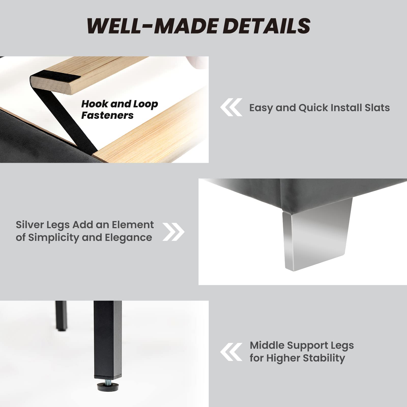 Still, looking for a favored bed frame? Our upholstered bed meets your daily needs for both sleep and leisure. Supported by solid wooden slats, the bed base features outstanding toughness and bending resistance. The extra middle support legs with adjustable foot pads further enhance overall stability. More, the headboard is filled with a soft sponge and covered with skin-friendly velvet for the purpose of maximum comfort and relaxation. All in all, this well-designed bed frame would undoubtedly be a perfect addition to the bedroom, guestroom, dorm, and apartment, etc.
