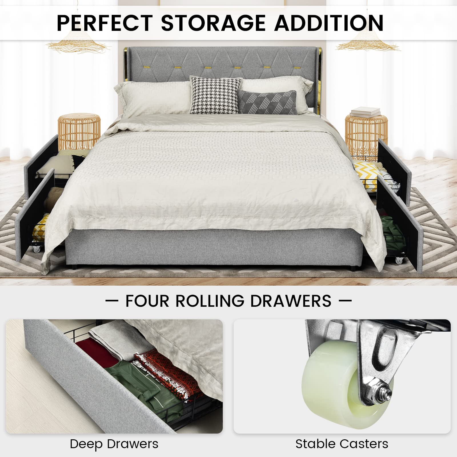 - Four Roomy Drawers: This platform bed frame is designed with 4 large drawers to accommodate your pillows, bed sheets, seasonal clothes and so on. Moreover, each one is fitted with smooth casters, making pulling more effortless and protecting the floor from scratches.