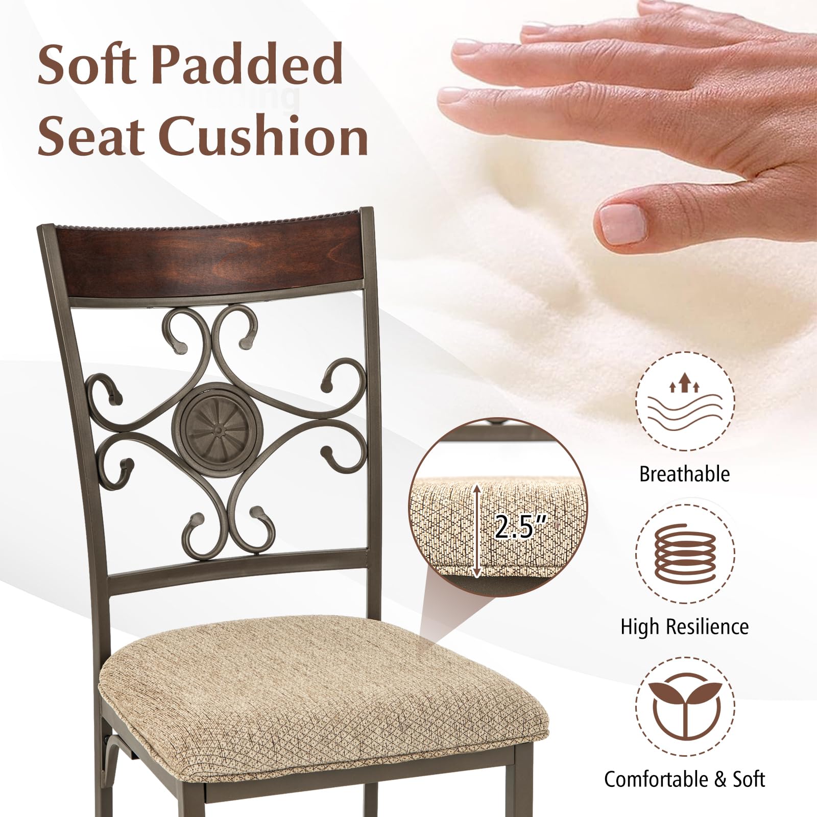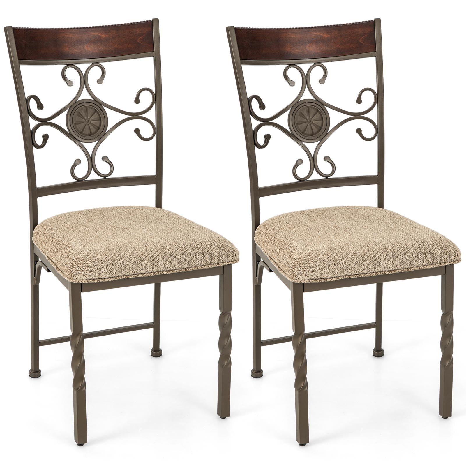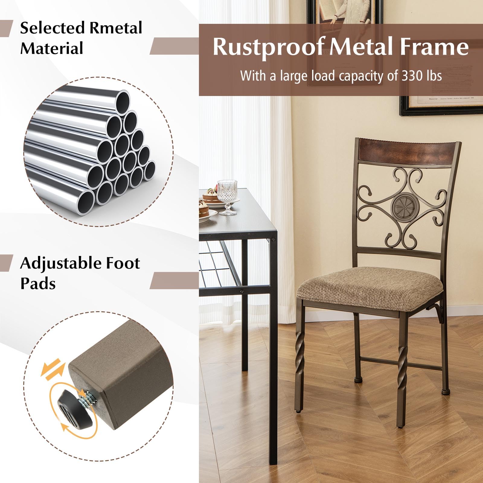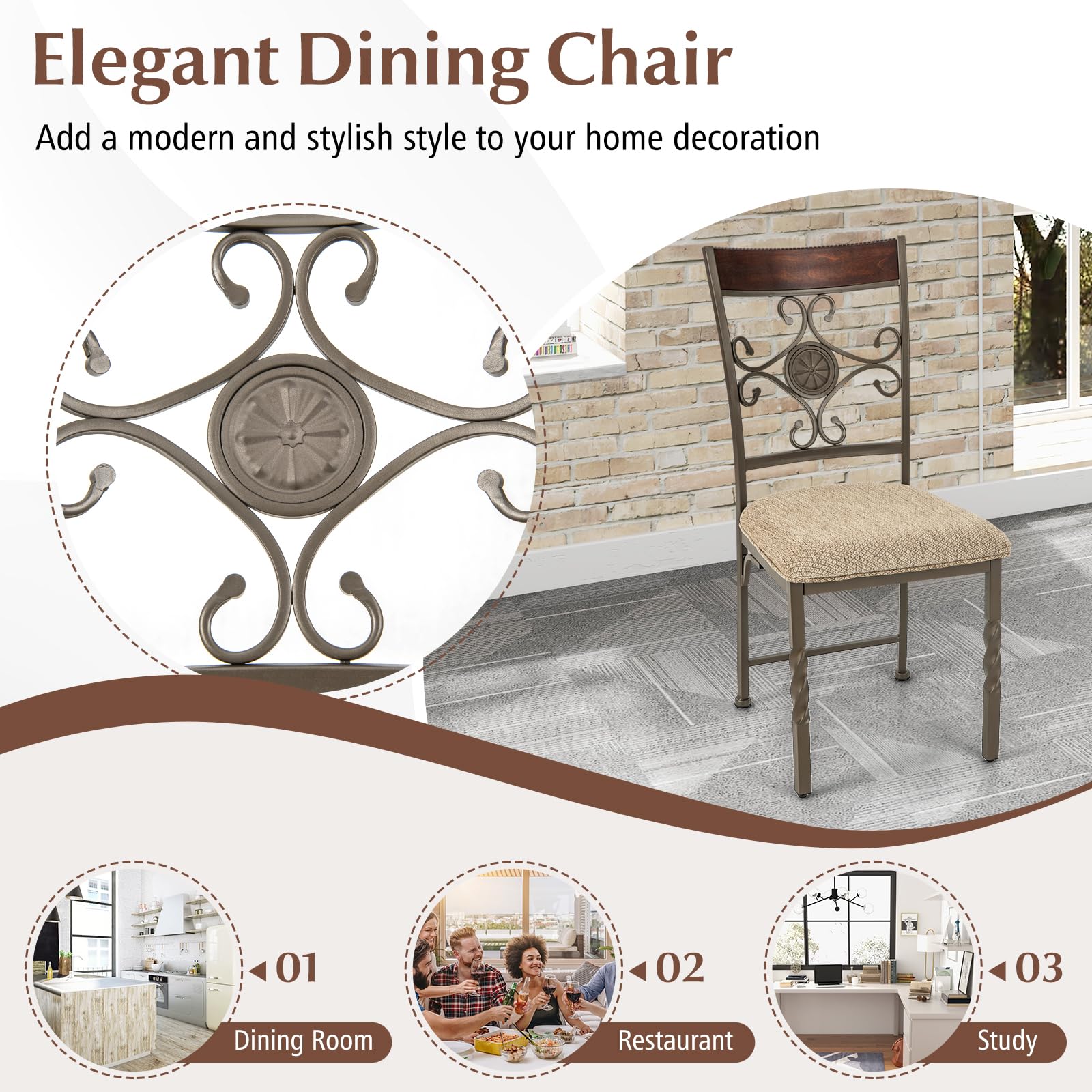 Are you looking for a dining chair that offers the perfect balance of comfort and style? Look no further! This dining chair comes with soft padded seat cushion and breathable fabric, ensuring a fatigue-free and enjoyable mealtime. Its curved high backrest offer optimal support, which ensures a pleasant dining experience every time. Besides, supported by a rustproof metal frame, this chair has a large load capacity of 330 lbs, making it sturdy and durable for long-term use. The powder-coated surface adds an extra layer of protection against rust. Moreover, it has elegant metal legs, reinforced connection, and adjustable foot pads offer stability and a touch of luxury to your room setting. In addition, with its vintage appearance and stylish backrest, this chair is suitable for various settings including your dining room, living room, balcony, or study. Elevate your home decor with this versatile dining chair.