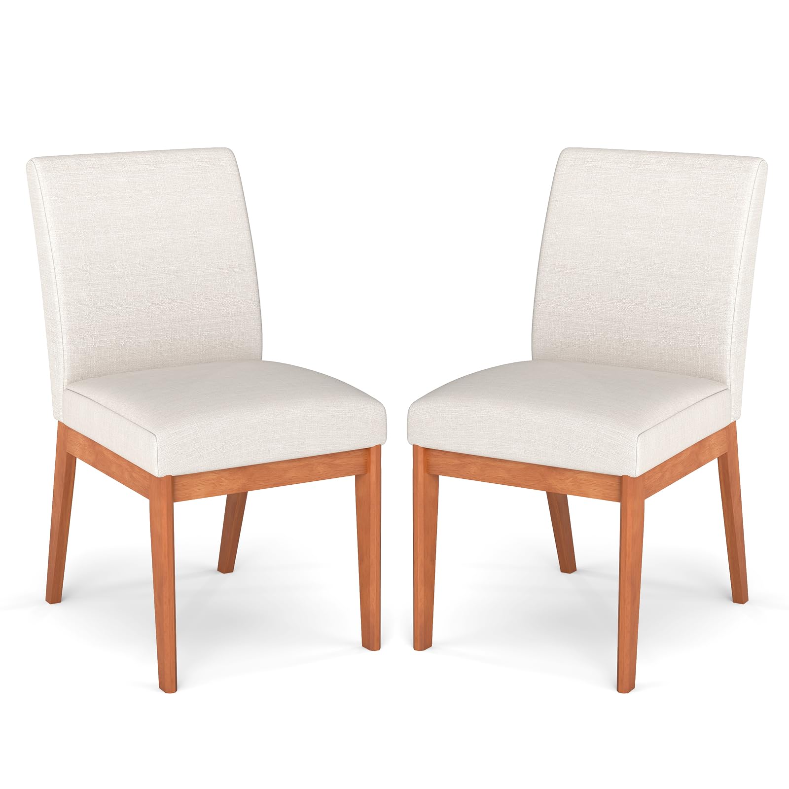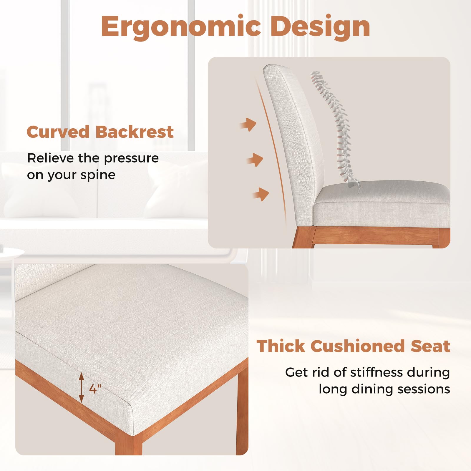 The legs of the kitchen chairs are crafted from rubber wood, featuring deformation resistance that stands up to frequent use. The dining room chairs feature seats and backrests filled with soft sponge, ensuring a truly comfortable sit. Upholstered in polyester fabric, these chairs resist wear and wrinkles, maintaining their appearance over time. The gracefully curved backrest supports your spine, easing pressure and allowing you to relax comfortably. Each chair boasts a 4" thick cushion, which alleviates discomfort during extended dining sessions. Versatile and chic, these dinette chairs are a perfect fit for various settings, such as dining room, living room or restaurant.