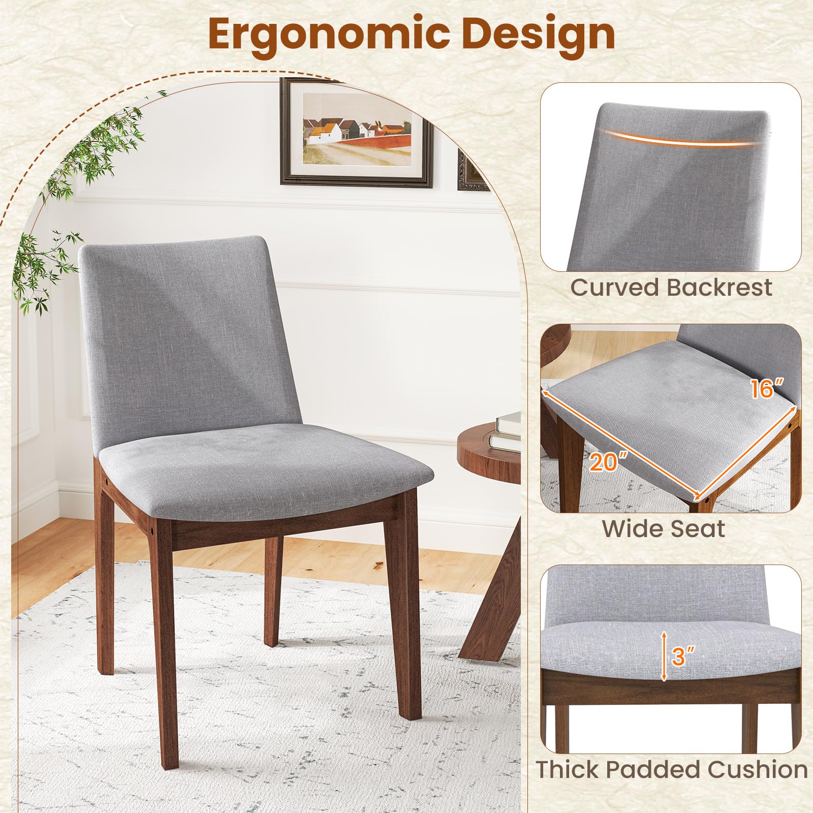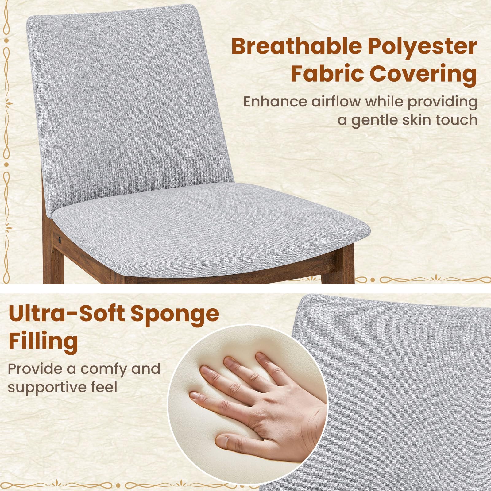 - [Plush Comfort]: The upholstered kitchen chairs are equipped with padded cushions filled with ultra-soft sponge material, providing luxurious comfort and coziness. The breathable linen fabric coverings ensure a gentle touch on the skin.