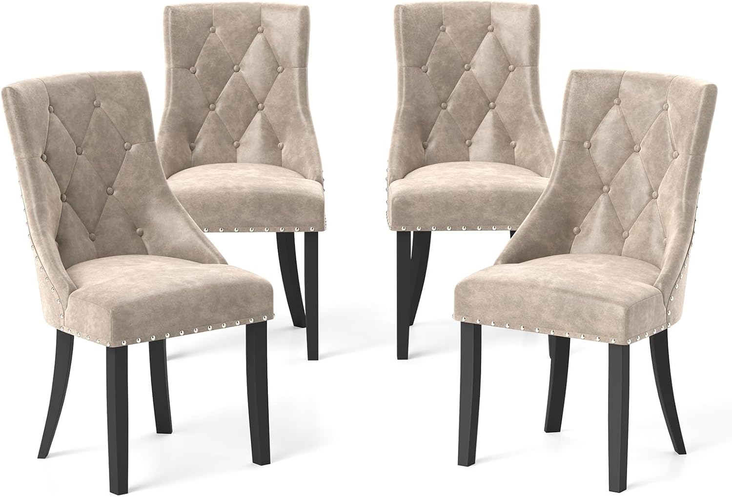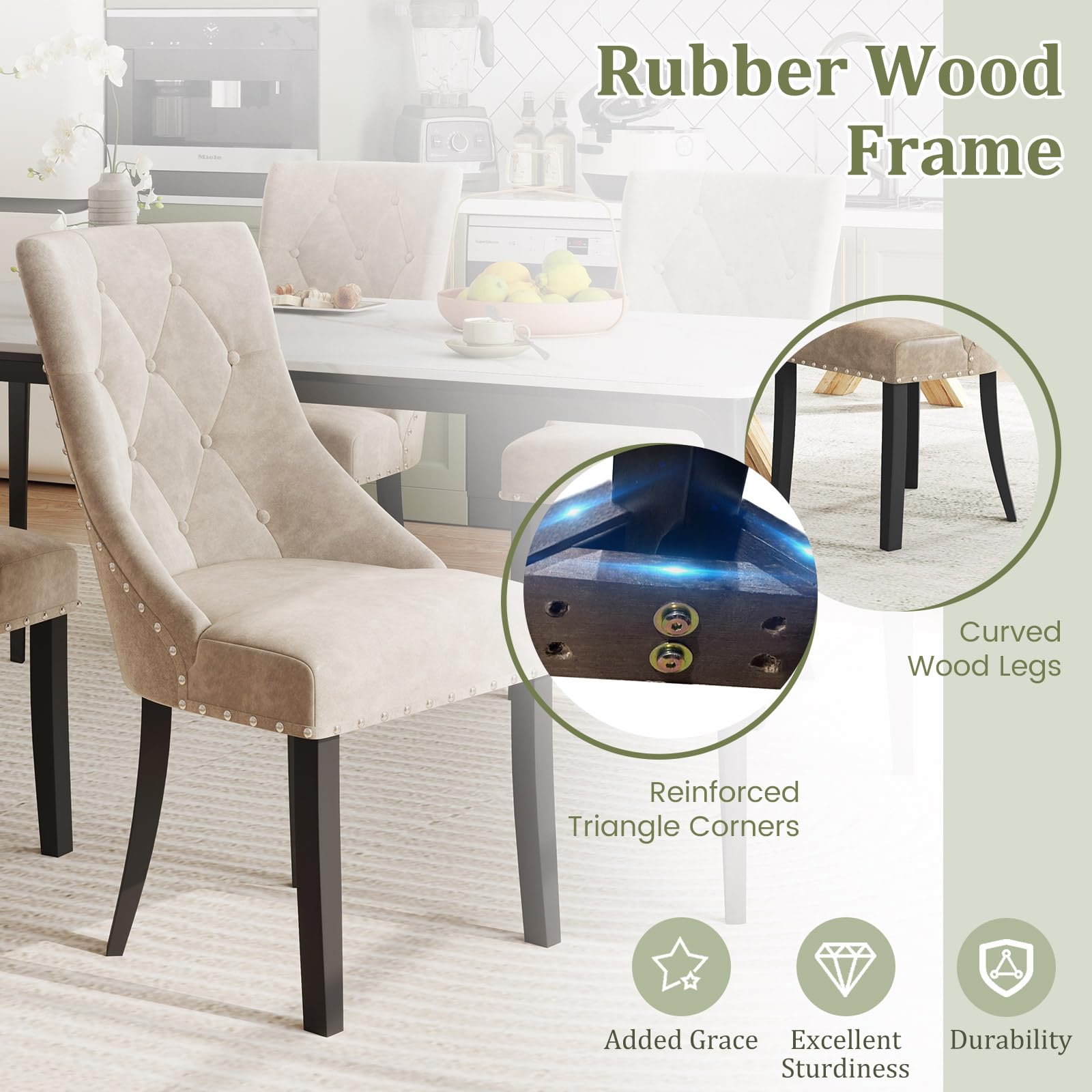 Crafted with a wing back and curved legs, these fabric kitchen chairs combine a rustic and contemporary design that seamlessly blends with various interior decorating styles. The nailhead trim and deep button tufting add a touch of luxury and elegance to the overall look. Not only are these chairs visually appealing, but they also prioritize comfort. The cushioned foam padding in the seat and back provides optimal support, ensuring a cozy seating experience during long gatherings or meals. The low-set arms add an extra layer of comfort, making these chairs perfect for leisurely dining experiences. With a solid rubber wood frame, you can rest assured that these chairs are built to last. Also, these chairs are easy to install with simple structure.