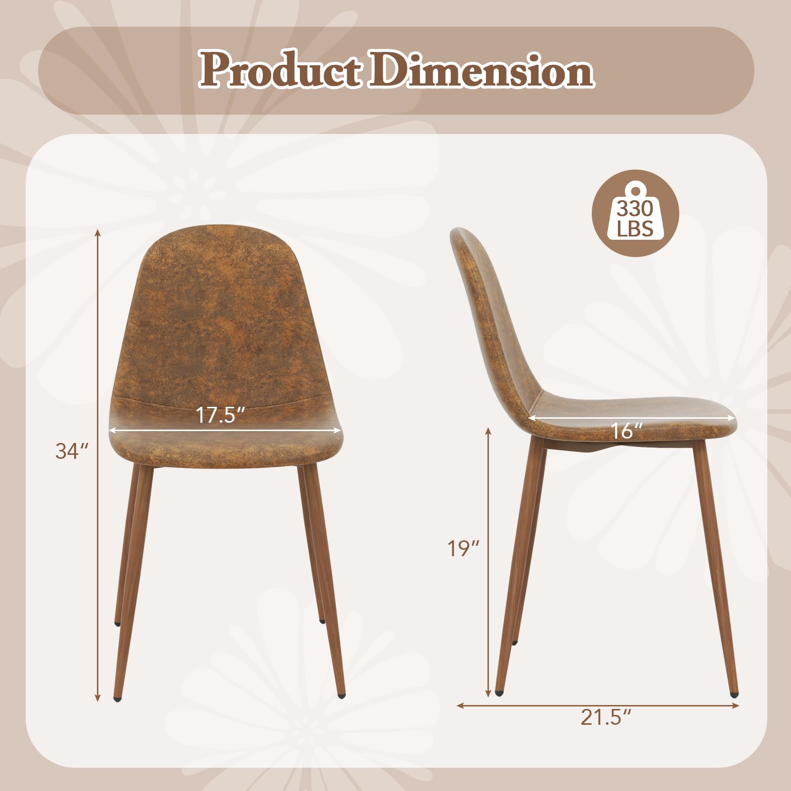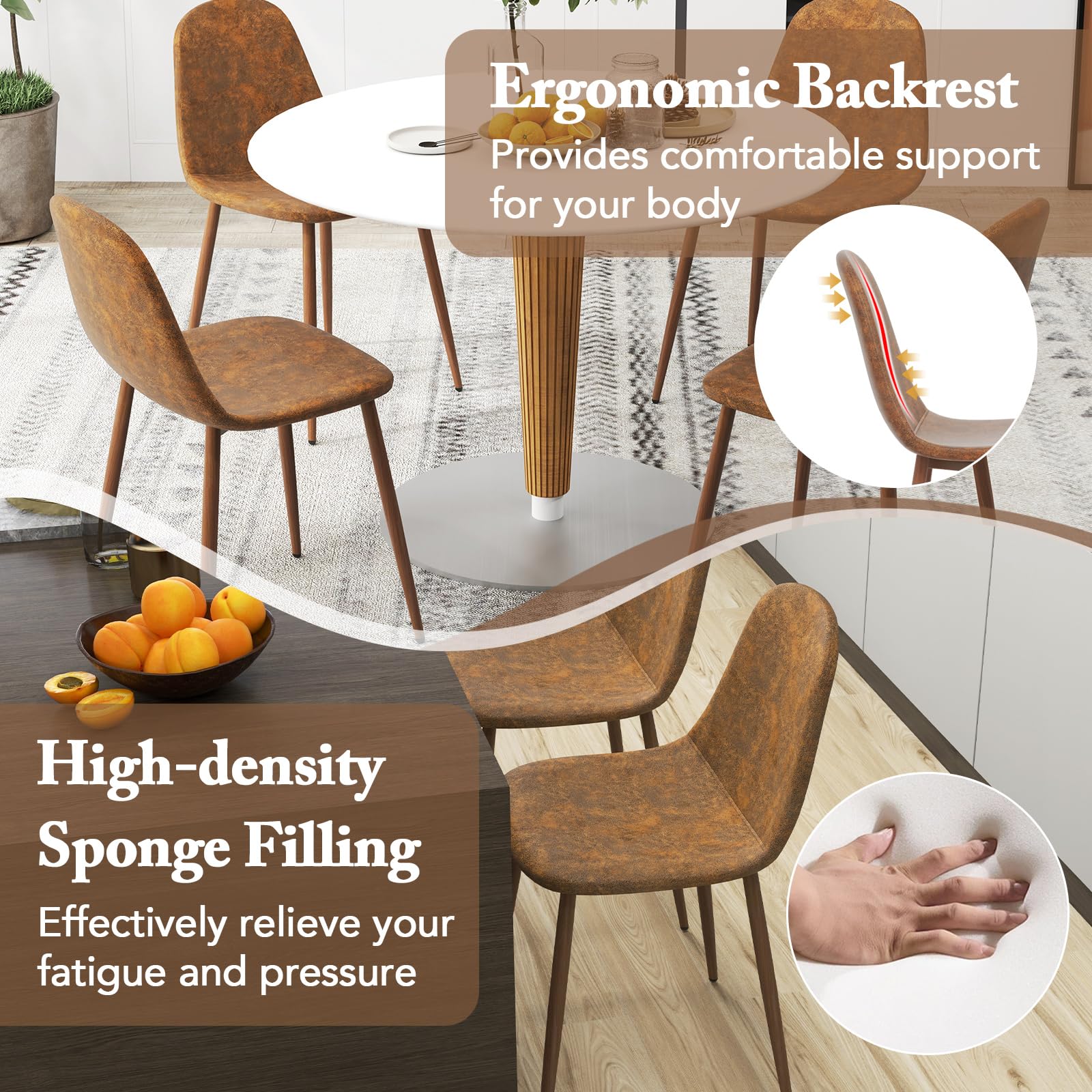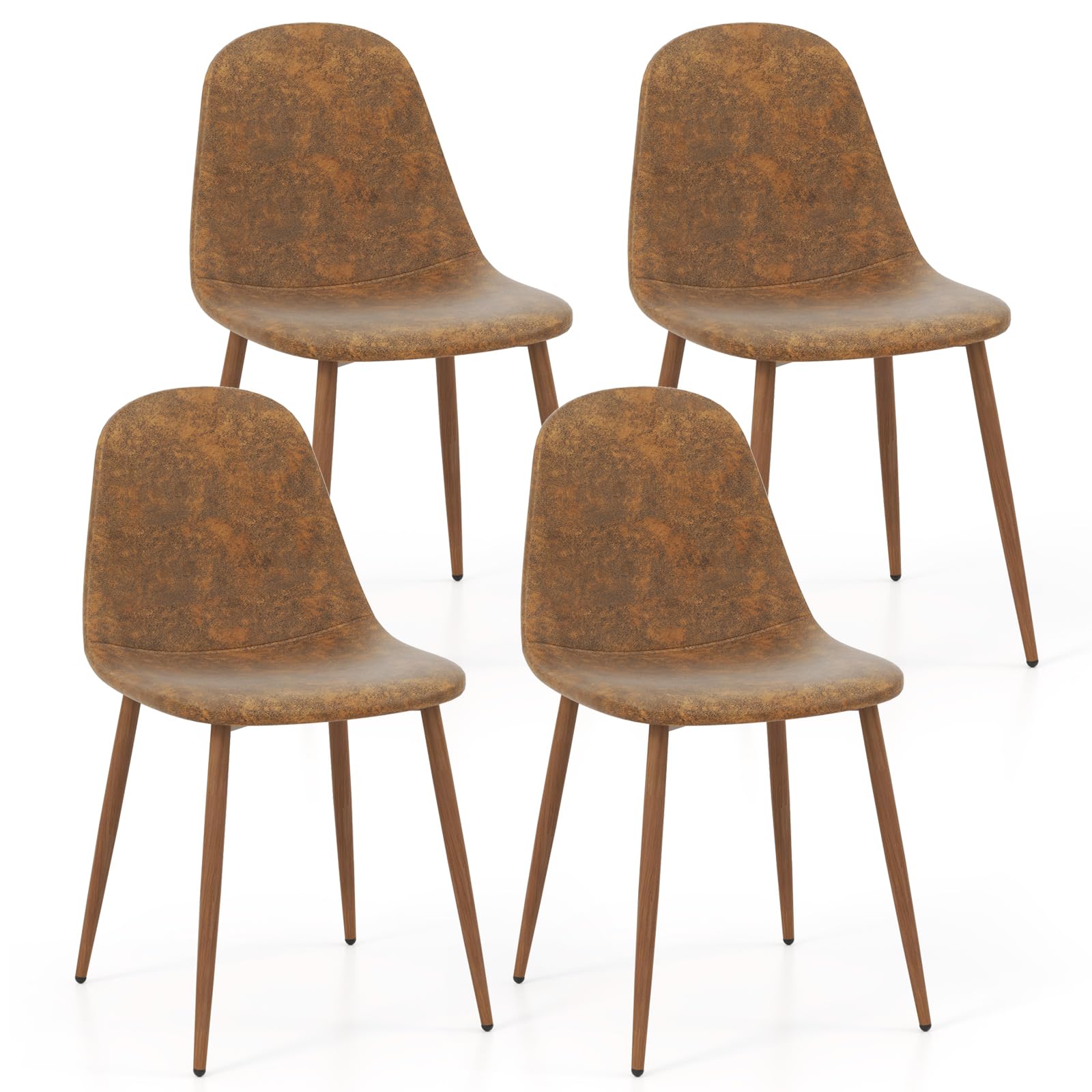 Each armless kitchen chair features an ergonomic backrest that adapts to your posture, providing gentle support during meals or gatherings. The cushions are filled with high-density foam to help ease tension and offer lasting comfort. Upholstered in water-resistant PU leather, the dining room chairs are easy to clean while maintaining a sophisticated look. Also, the seats showcase a subtle faux suede finish, lending a touch of vintage charm to your space. Supported by metal legs finished with wood grain detailing, these chairs blend seamlessly with various styles. Furthermore, an X-shaped reinforcement under the seat adds strength and stability, while adjustable foot pads ensure balance even on uneven floors. Therefore, the 4 pieces upholstered dining chairs are elegant choice for offices, kitchens, or cafes.