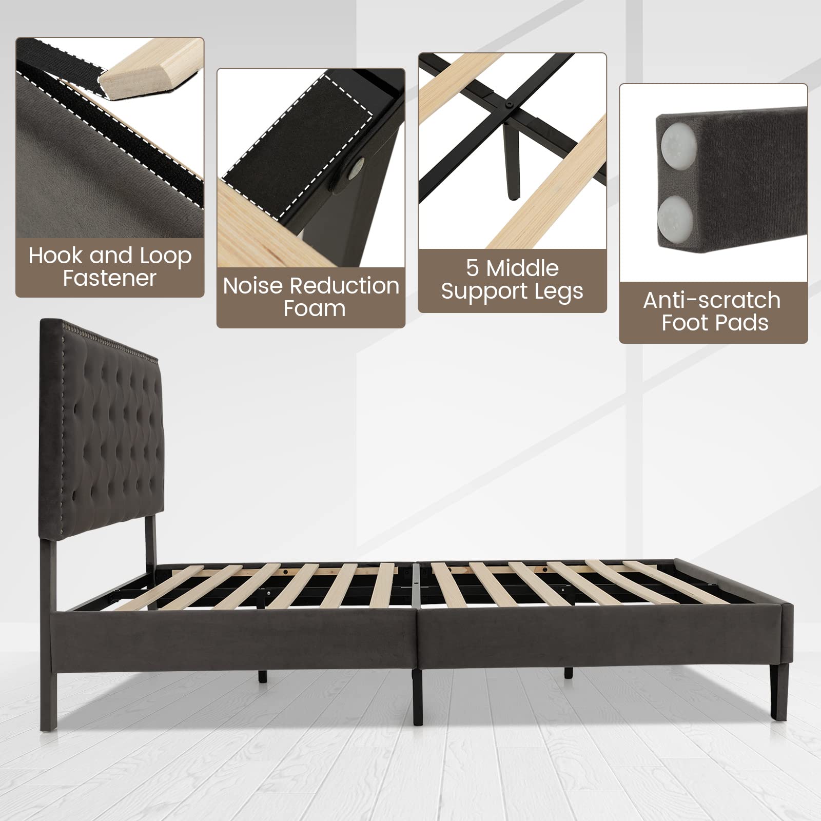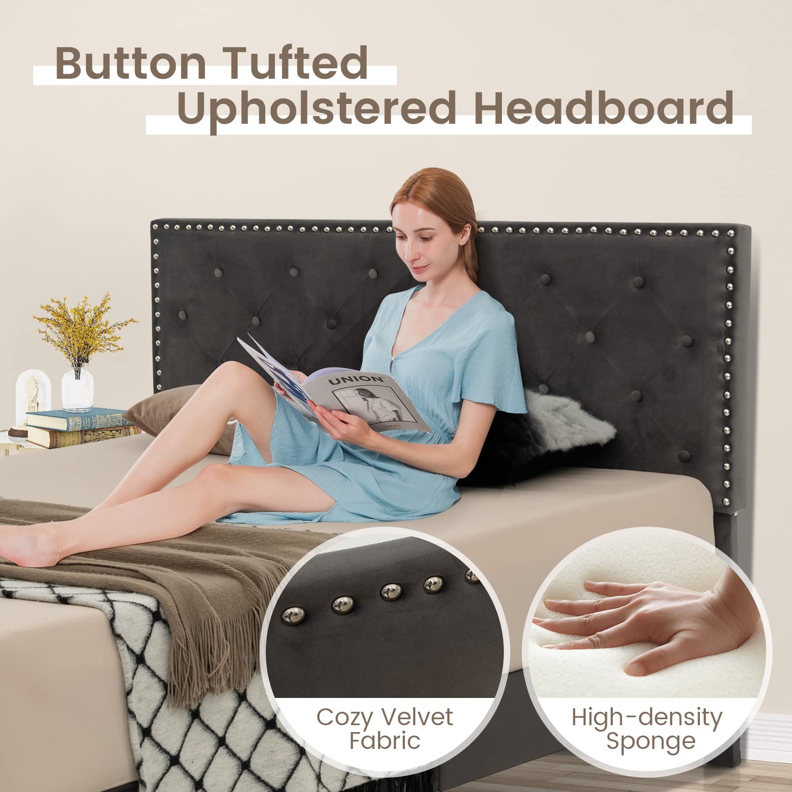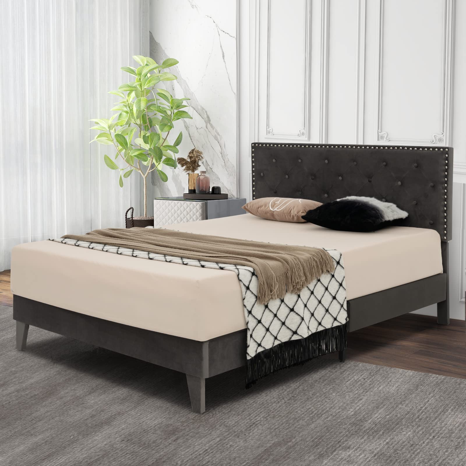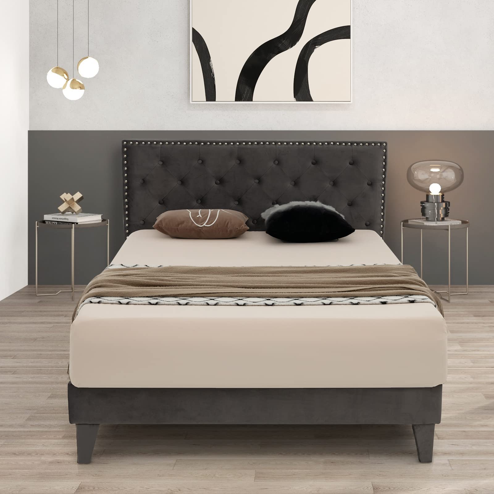 To make this bed frame sturdy enough to support you and the 10"-12" mattress (not included), we especially use stable plywood slats and a sturdy metal frame as the bed frame construction, ensuring 1000 lbs strong bearing capacity. Therefore, you can sleep on it without worry. No matter how you switch your sleeping position, this mattress foundation will always keep quiet thanks to the noise reduction foams. If you wanna read, just lean to the upholstered headboard for comfortable support.
