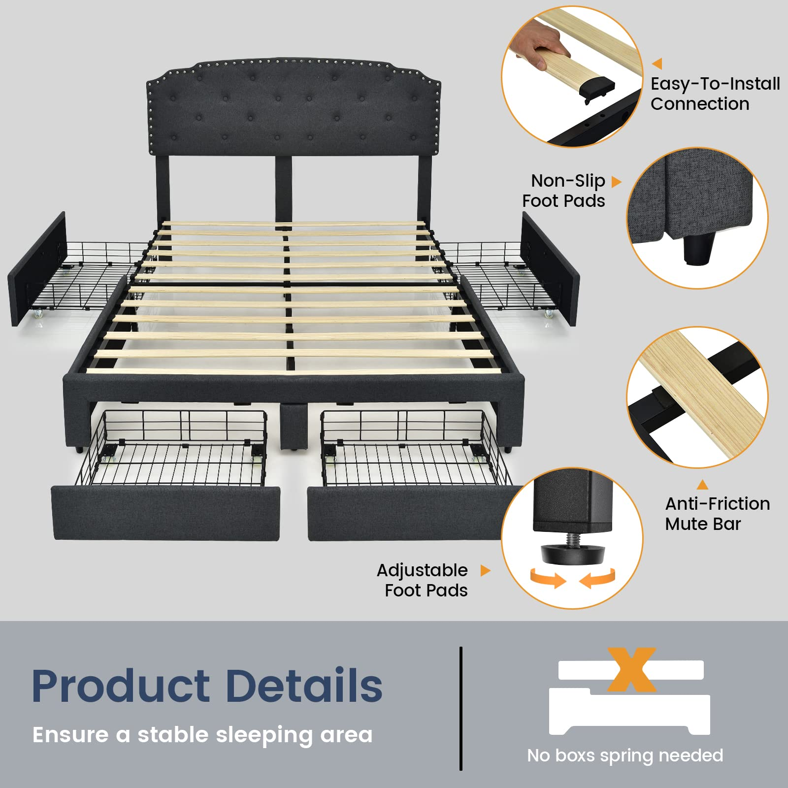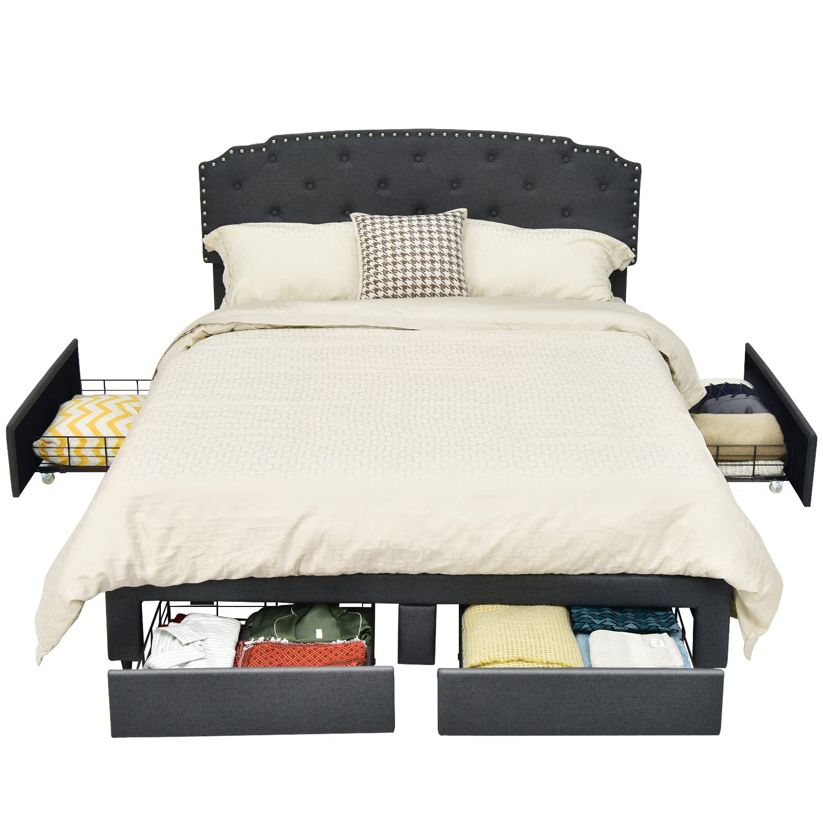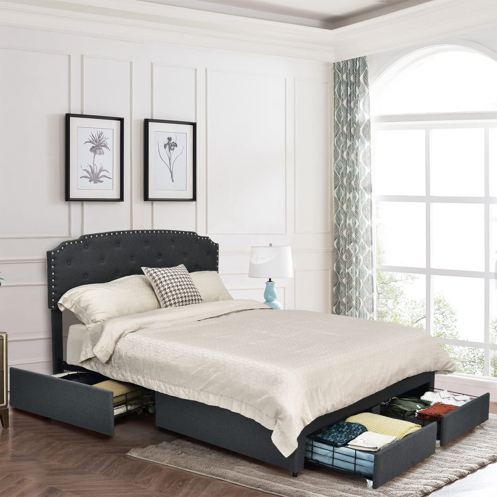 This bed frame comes with a steel frame and two kinds of foot pads (anti-slip and adjustable), so its 660 lbs load capacity and good stability are well ensured. The mute bar helps reduce friction and noise. Also, the whole bed frame is covered with breathable linen fabric, offering very good comfort. Especially the high headboard, which is also adjustable for 41" or 44"overall height, is filled with sponge and feels much softer. Meanwhile, the headboard is designed with buttons and rivets, so it looks very attractive. At the bottom, 4 deep drawers fitted with casters offer roomy storage space for seasonal clothes, pillows, bed sheets, and more. Thanks to a platform design, a mattress will be directly supported without a box spring. All you need to do is manually press each slat and finish an easy installation.