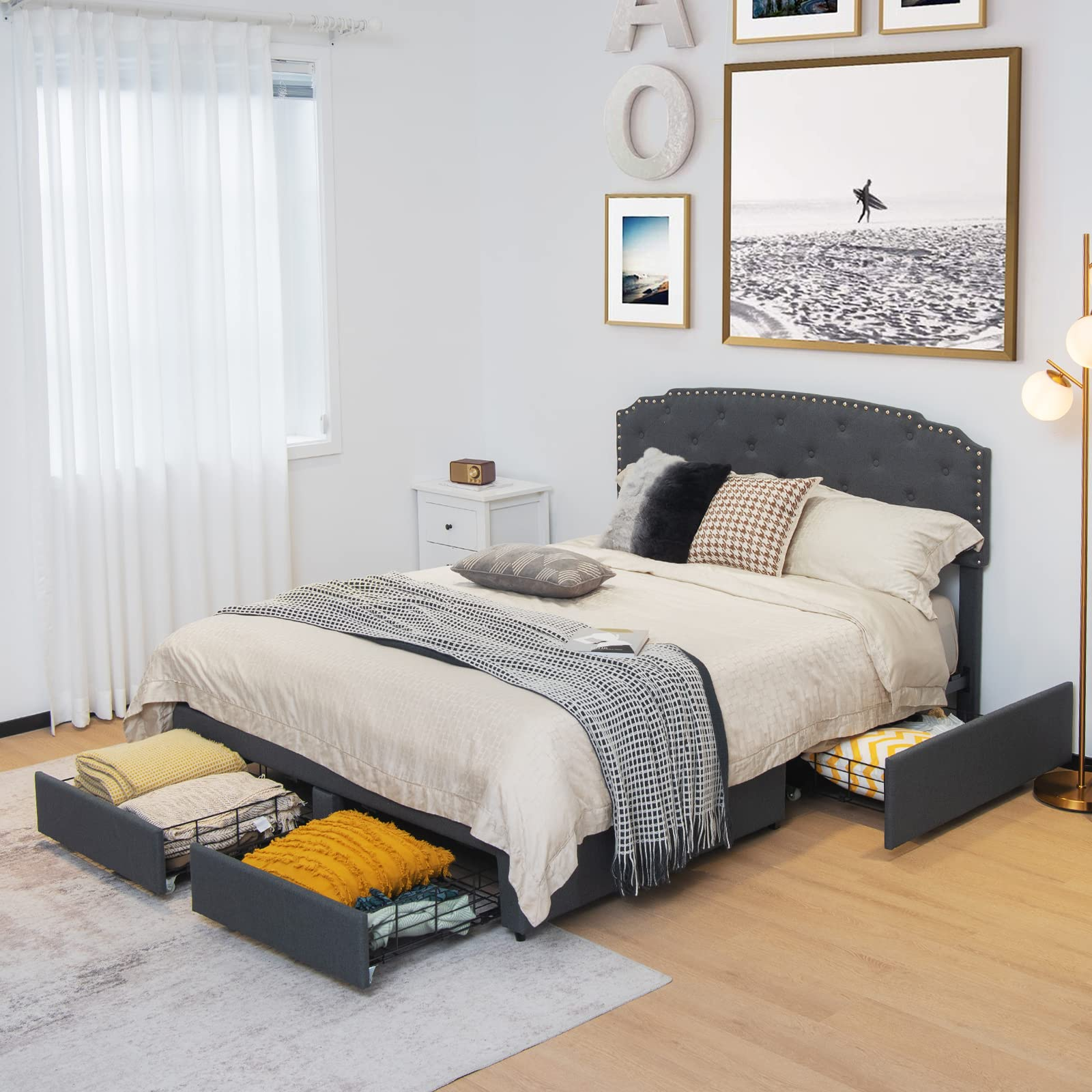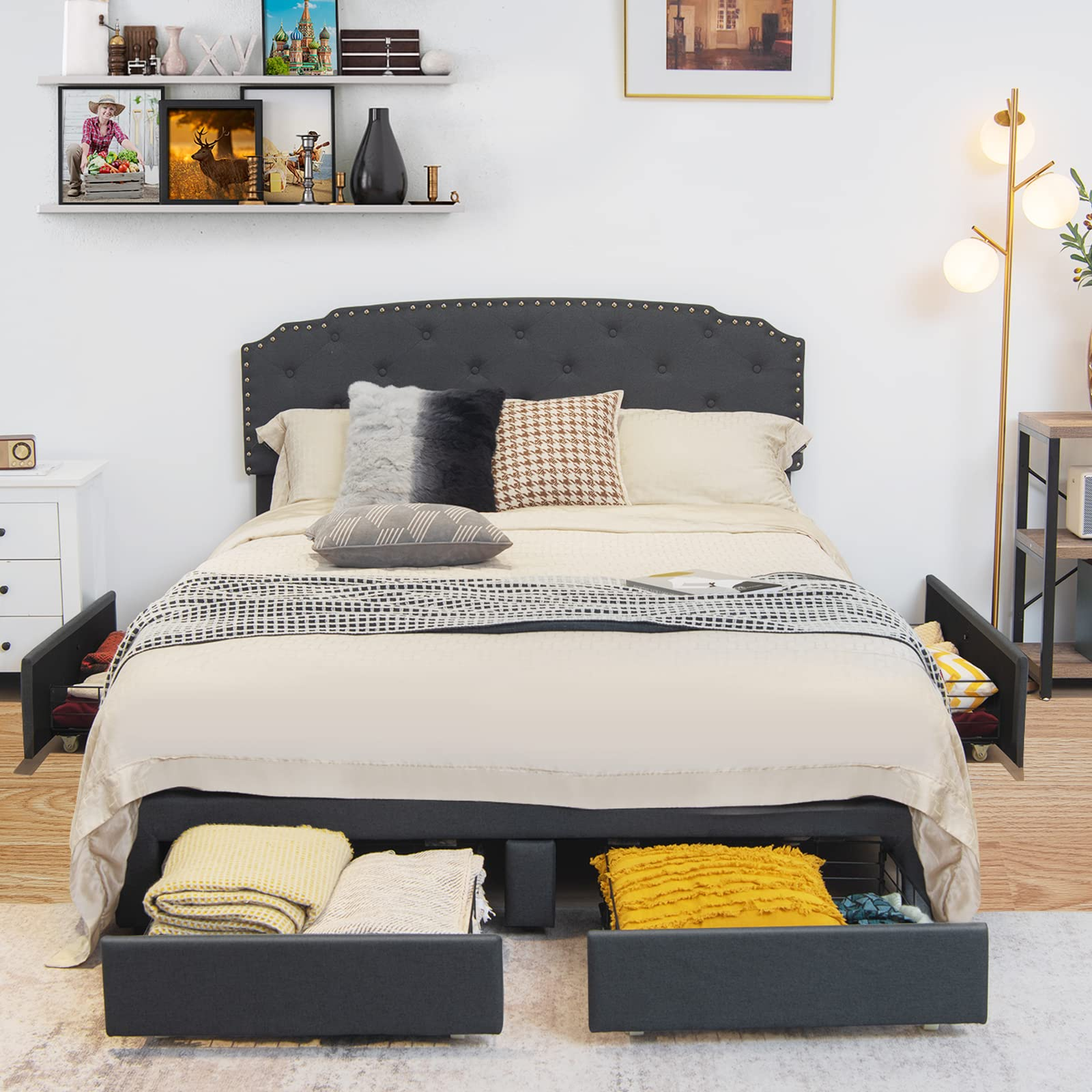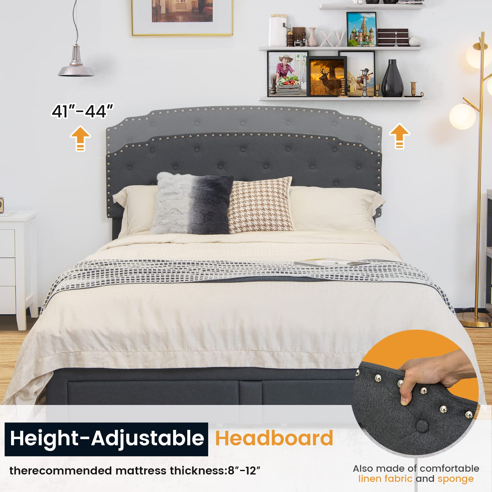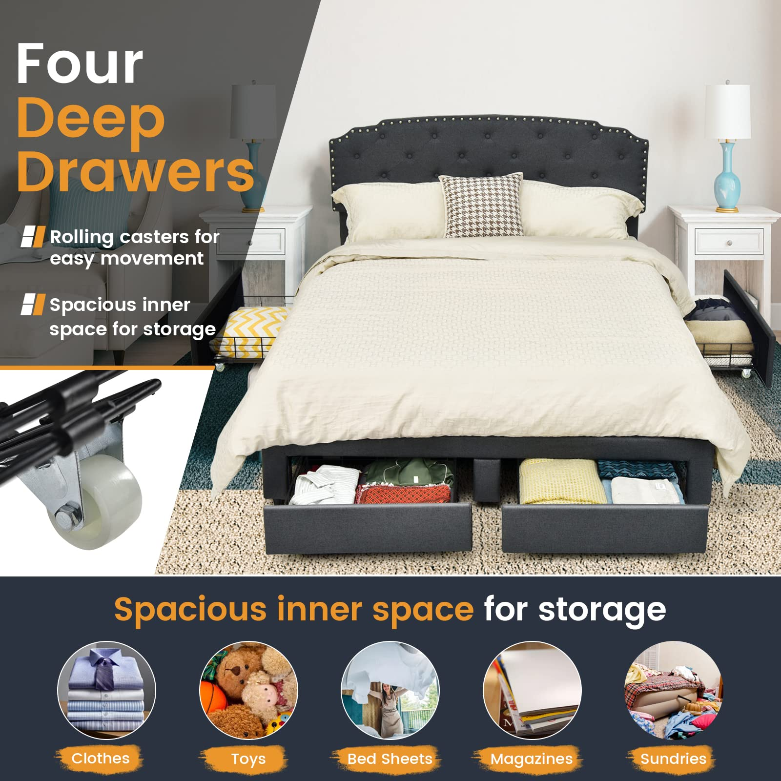 This bed frame comes with a steel frame and two kinds of foot pads (anti-slip and adjustable), so its 660 lbs load capacity and good stability are well ensured. The mute bar helps reduce friction and noise. Also, the whole bed frame is covered with breathable linen fabric, offering very good comfort. Especially the high headboard, which is also adjustable for 41" or 44"overall height, is filled with sponge and feels much softer. Meanwhile, the headboard is designed with buttons and rivets, so it looks very attractive. At the bottom, 4 deep drawers fitted with casters offer roomy storage space for seasonal clothes, pillows, bed sheets, and more. Thanks to a platform design, a mattress will be directly supported without a box spring. All you need to do is manually press each slat and finish an easy installation.
