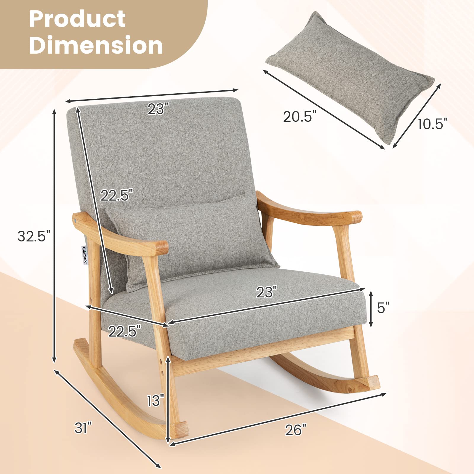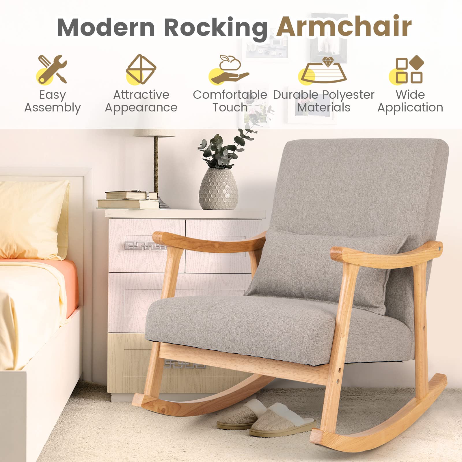 Product form Giantex Upholstered Rocking Chair - Modern Rocker with Rubber Wood Frame, Comfy Backrest & Seat $239.99 Item Package Quantity 1 2 ColorGrey Shipped today? Order within: Oct 05, 2025 17:00:00 -0700 Quantity Add to cart This item is a recurring or deferred purchase. By continuing, I agree to the cancellation policy and authorize you to charge my payment method at the prices, frequency and dates listed on this page until my order is fulfilled or I cancel, if permitted. Your order will be shipped for free!
