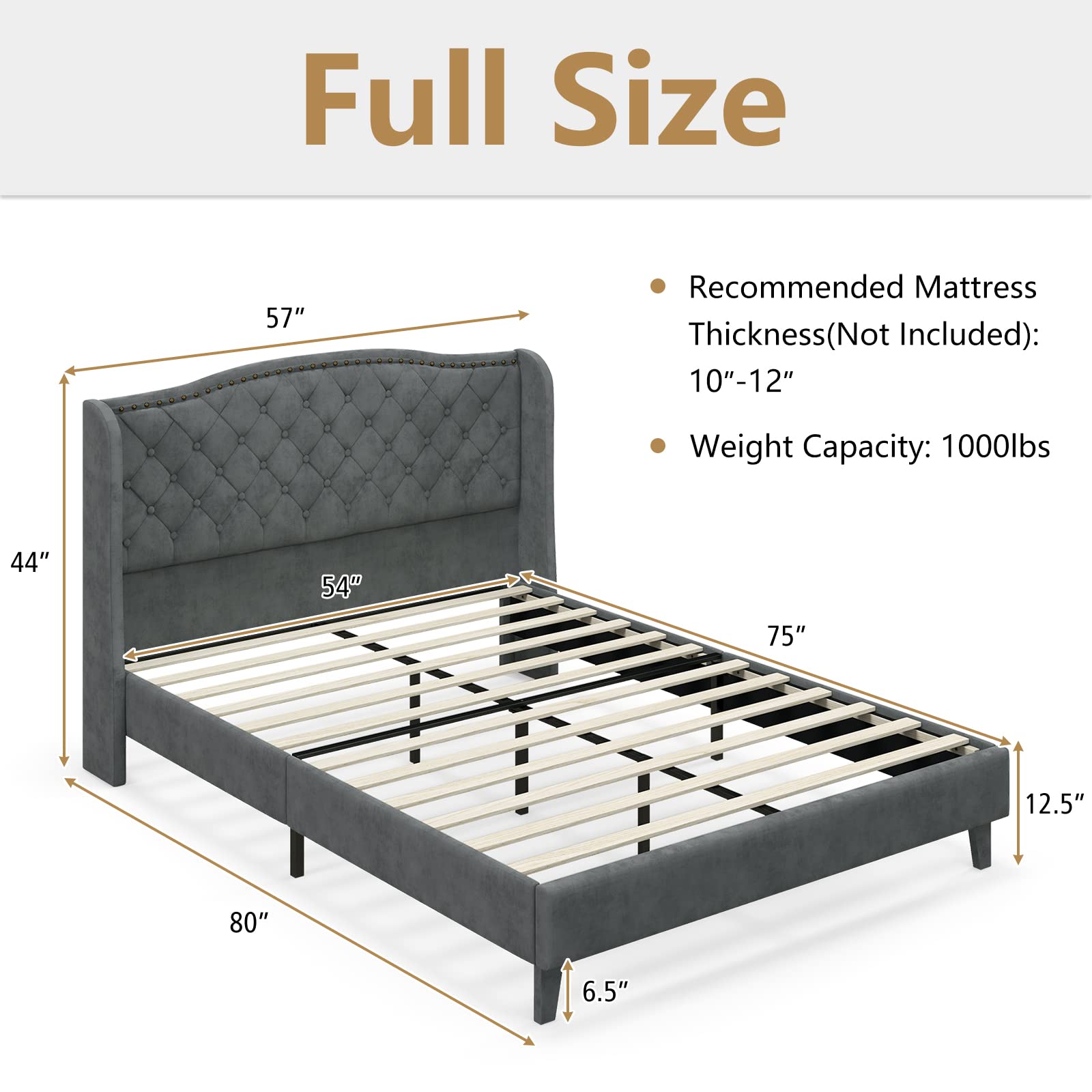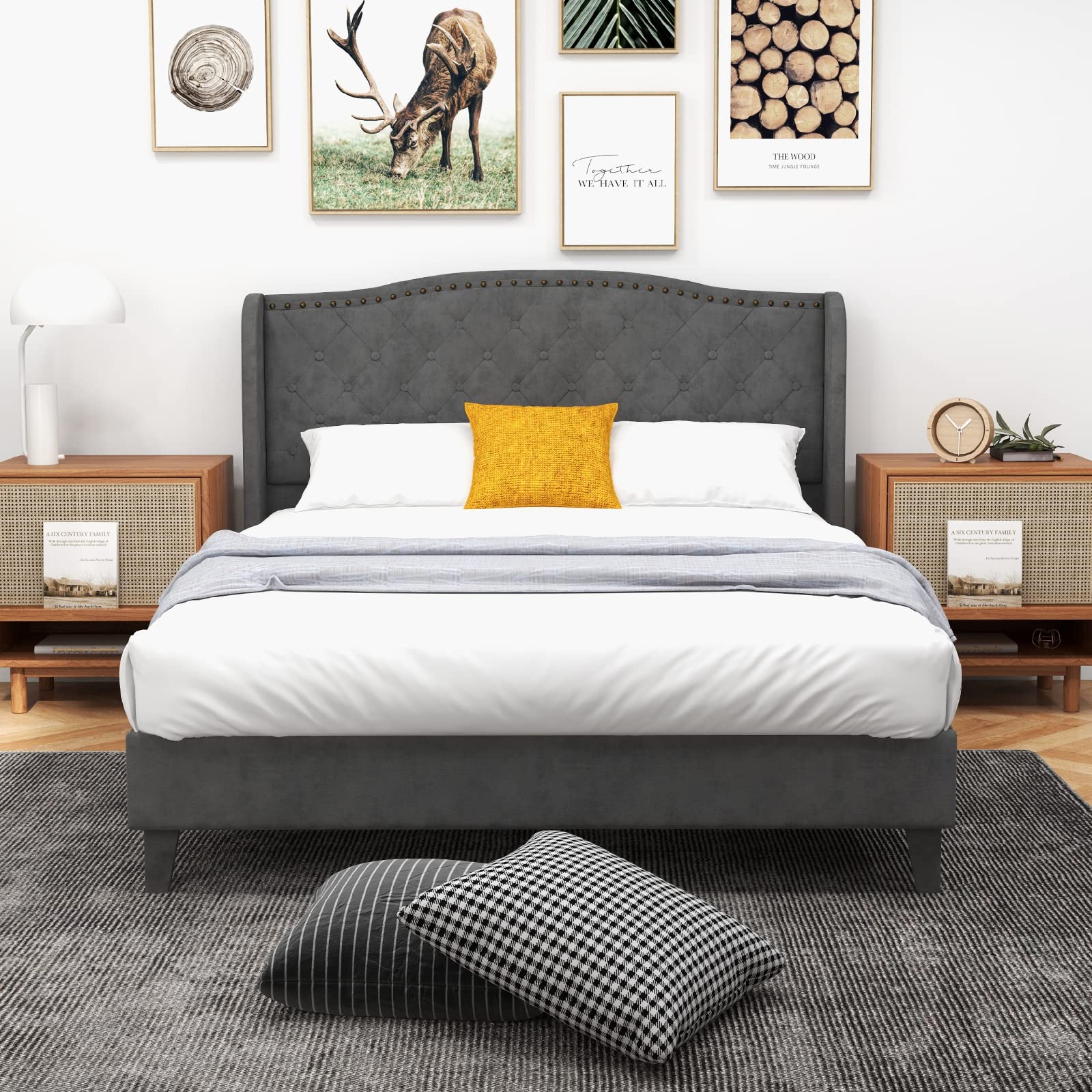 Have you found a favored bed frame? Our bed meets your daily needs for both sleep and leisure. Supported by solid wood slats, the bed base is sturdy and durable for a long lifespan. The extra middle support legs also improve the overall stability of bed frame. Combining soft sponge and skin-friendly velvet, the headboard ensures pleasant using experience for lying down or leaning against. With button embellishment and modern design, the bed base has an outstanding look and shows your great taste. This bed frame offers you a comfortable sleeping environment with reliable quality!