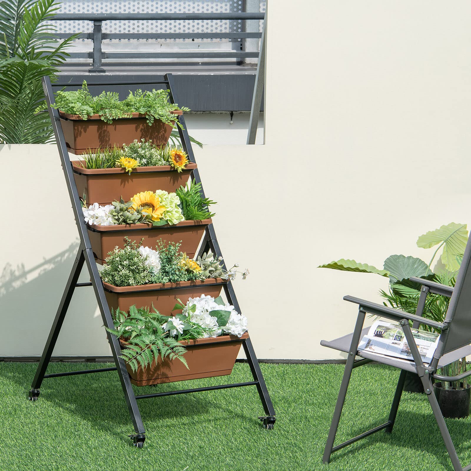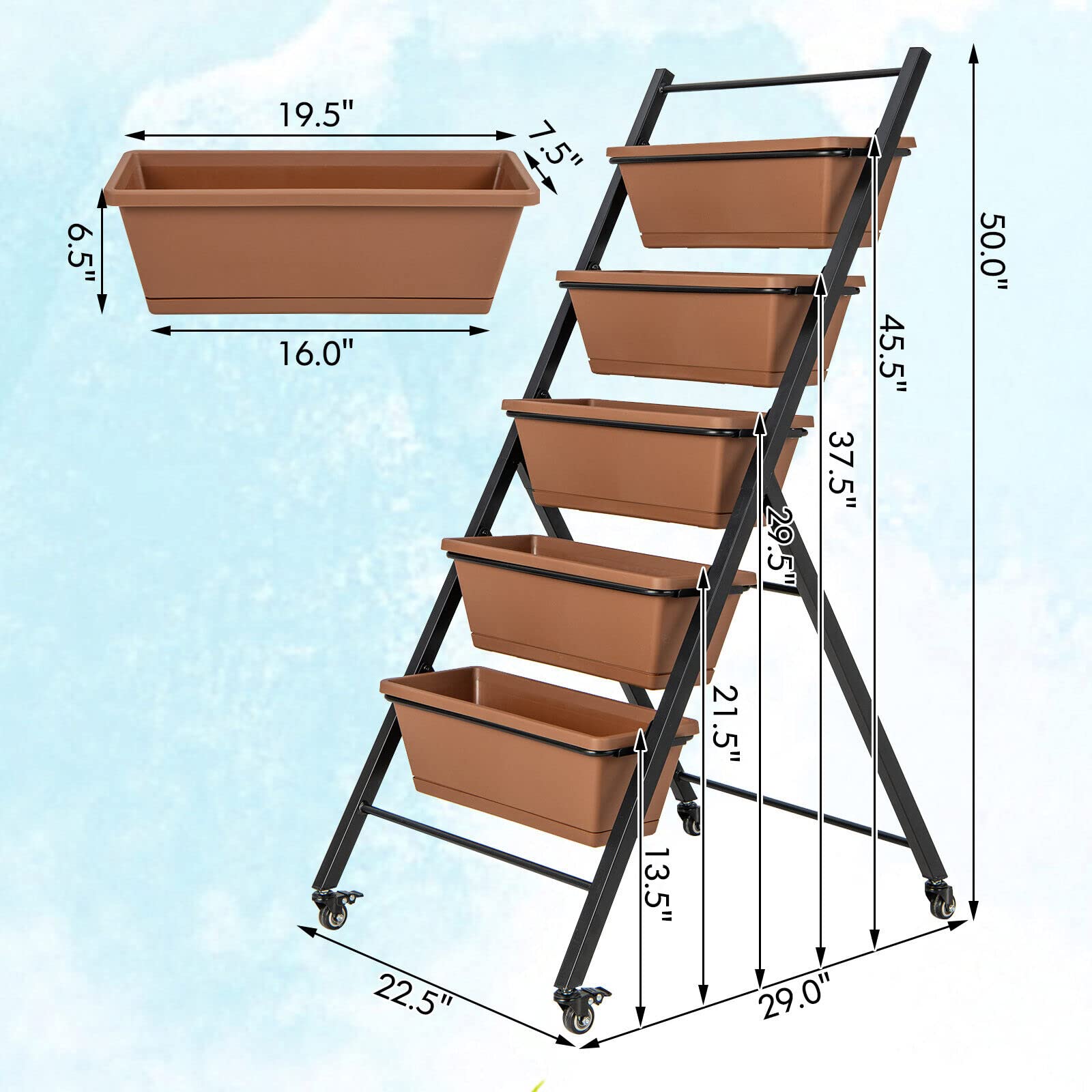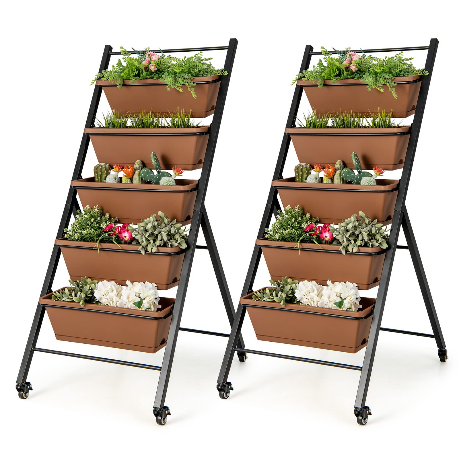 With our 5-tier vertical garden bed, your favorite vegetables, flowers, and fruits can be cultivated in an ideal environment. Besides, your garden will be well organized. The elevated garden bed is designed in a layered shape so that the plants below can get plenty of light. What's more, a detachable tray with drain holes at the bottom of the box can help reserve or drain out water to create a proper environment for plants to grow. The container boxes made of PP are safe, have no odor, and are durable. Supported by a strong rust-proof metal frame and triangular structure, the tall garden bed is very stable. To make it easy for you to move it inside and outside, we designed 4 universal wheels, two of which can be locked, allowing you to move it anywhere and park it safely.