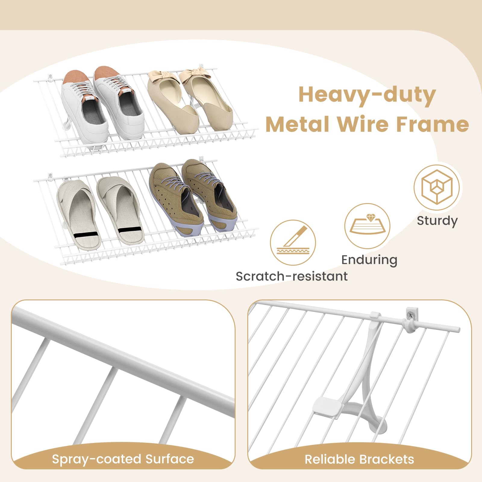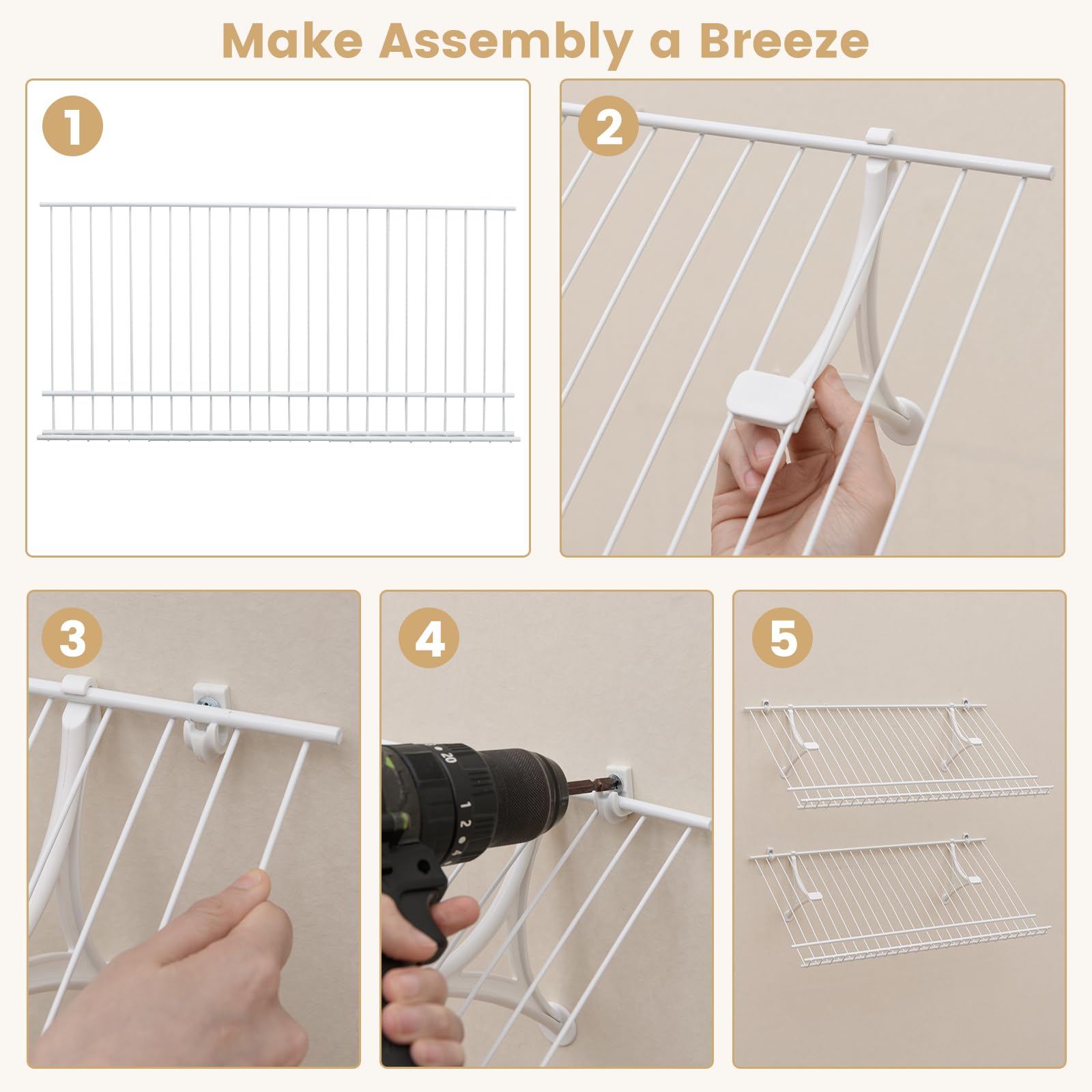 Made from heavy-duty metal wire with a spray-coated surface, this shelving unit promises durability and sturdiness. Perfect for various configurations, this custom shelving unit can be hung at any height without occupying any floor space. Equipped with sturdy brackets, the storage organizer kit ensures your belongings are securely held in place. The edge protection design keeps delicate items from snagging or falling. The complete accessory set provides everything you need for a straightforward installation process.