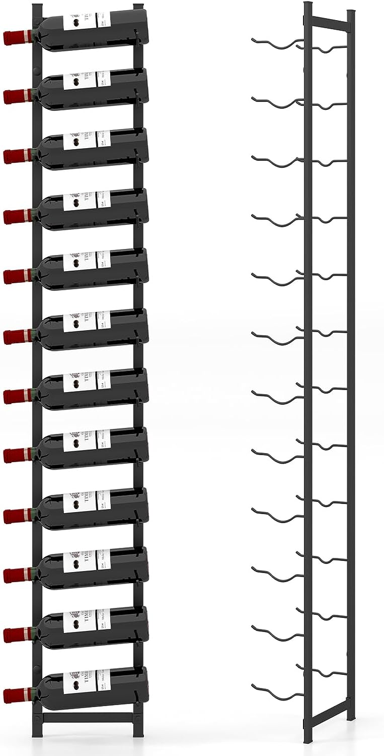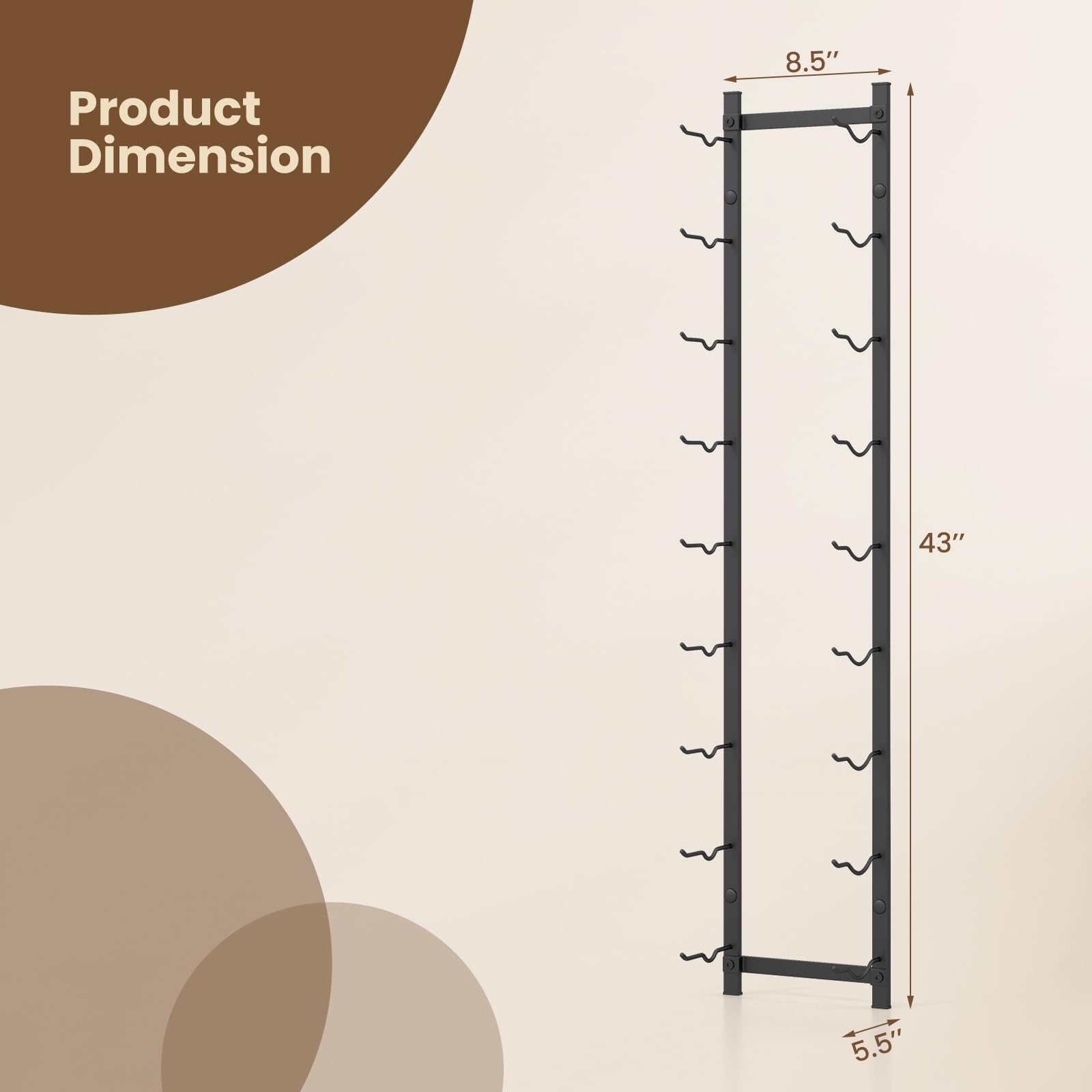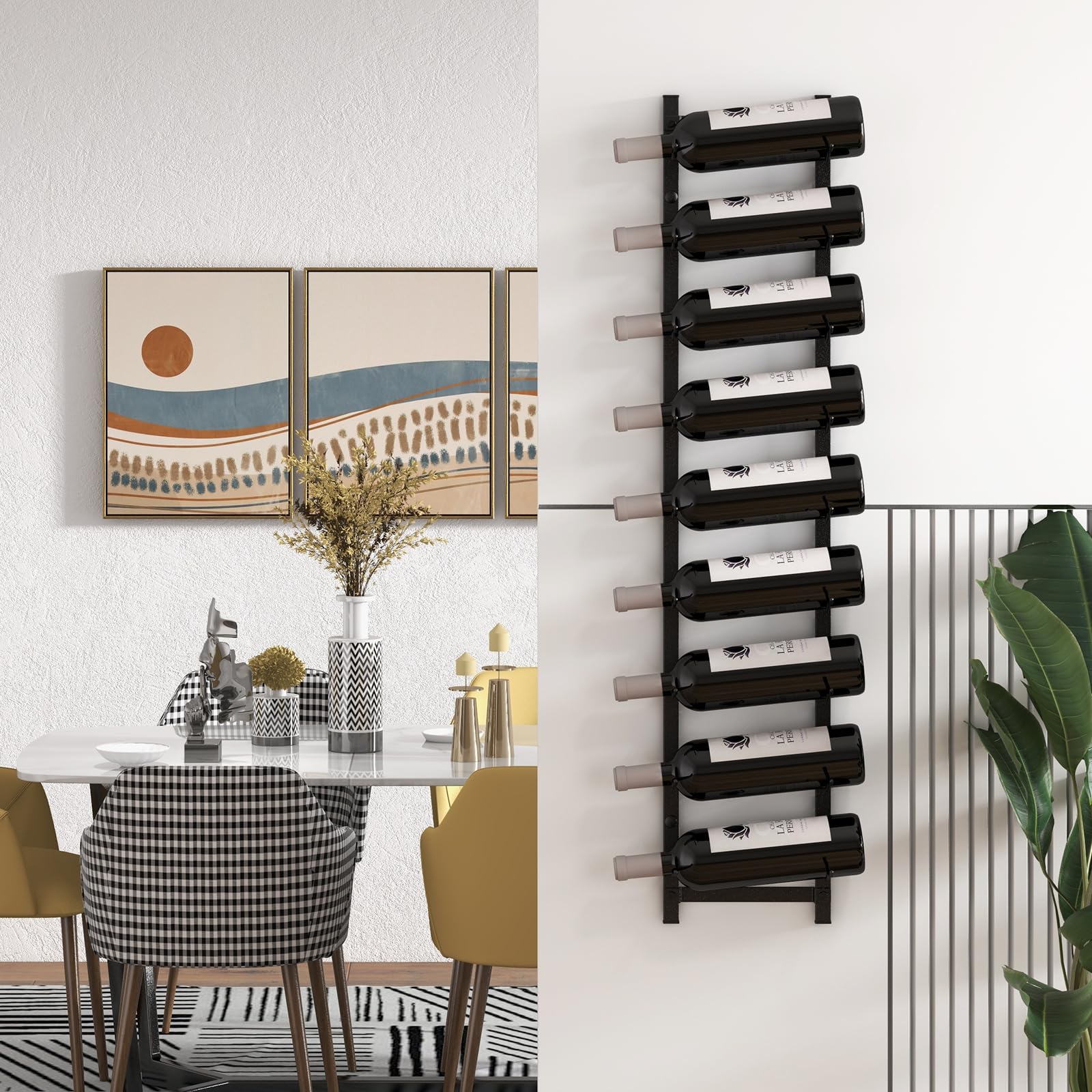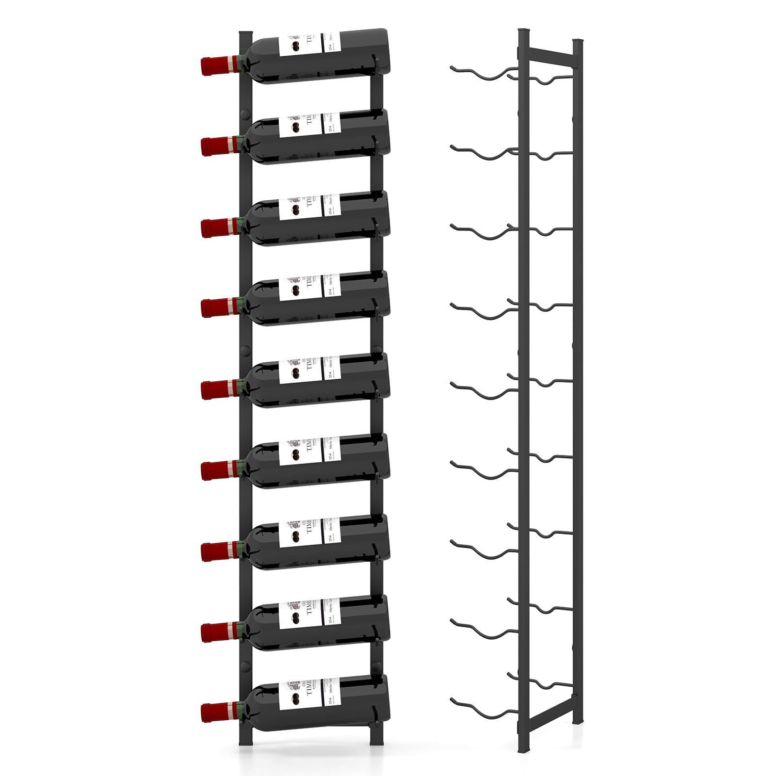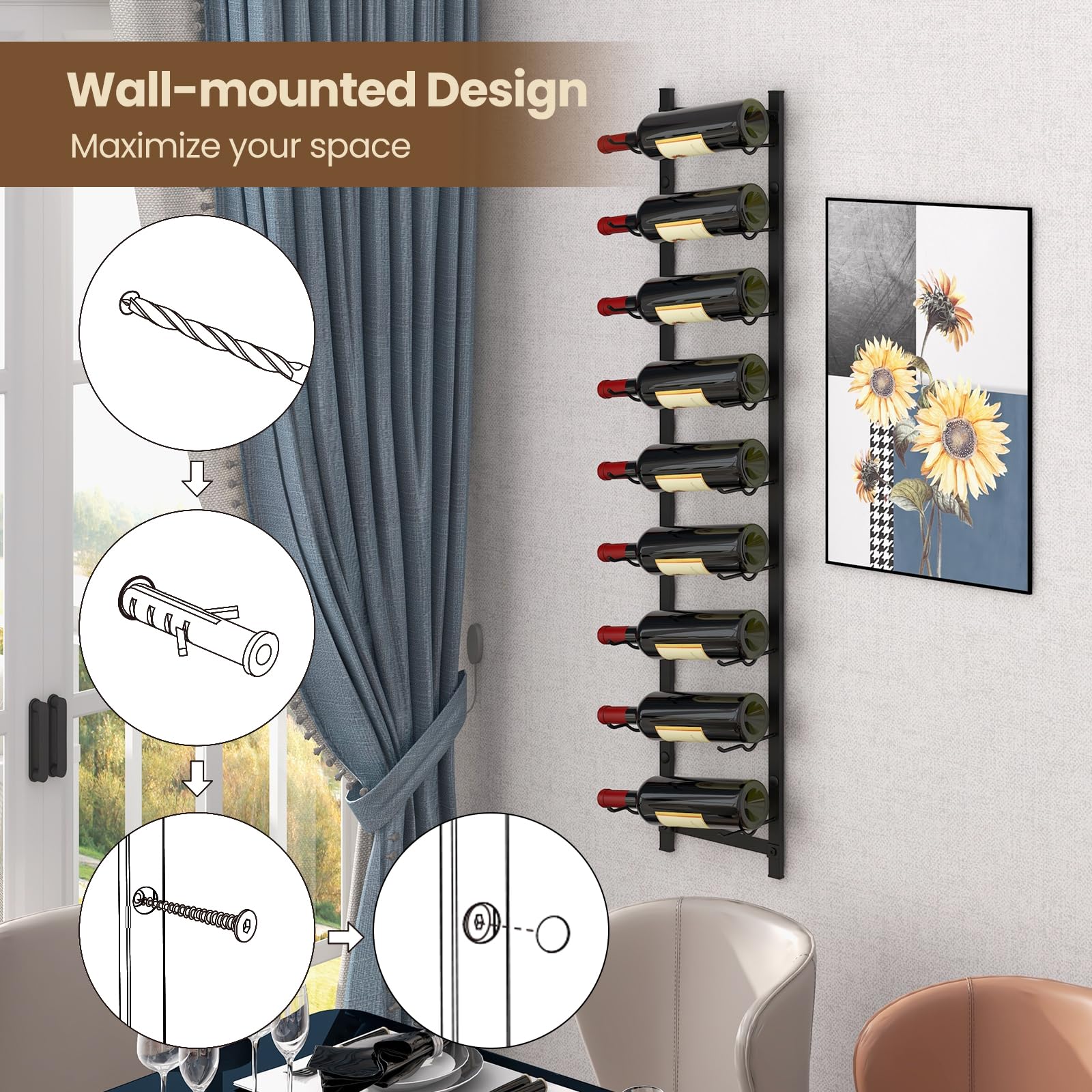 Giantex wall-mounted wine rack is a functional and stylish way to store and display your wine collection! This particular wine rack is designed to accommodate 9 wine bottles, providing ample storage space for your favorite bottles of liquor, champagne, or wine, making them neatly organized and easily accessible. The tilted design ensures that the corks are consistently in contact with the wine at all times and prevents air from entering the bottles, maintaining the quality and flavor of your wine. Made from durable metal, this wine holder is built to last and can withstand heavy bottles without bending or warping. Its sleek and modern design will complement any kitchen, dining room, or bar decor, adding an elegant touch to your space.