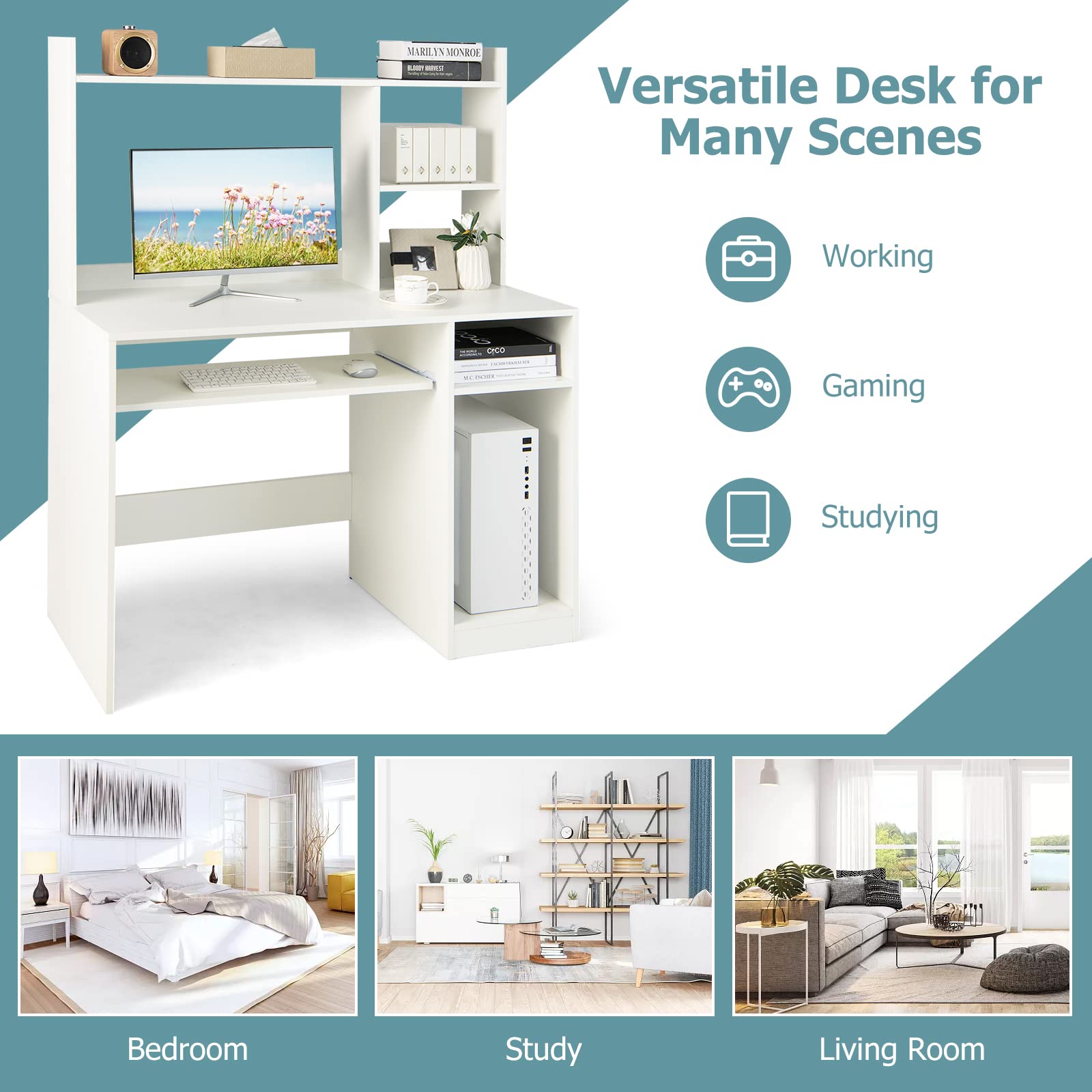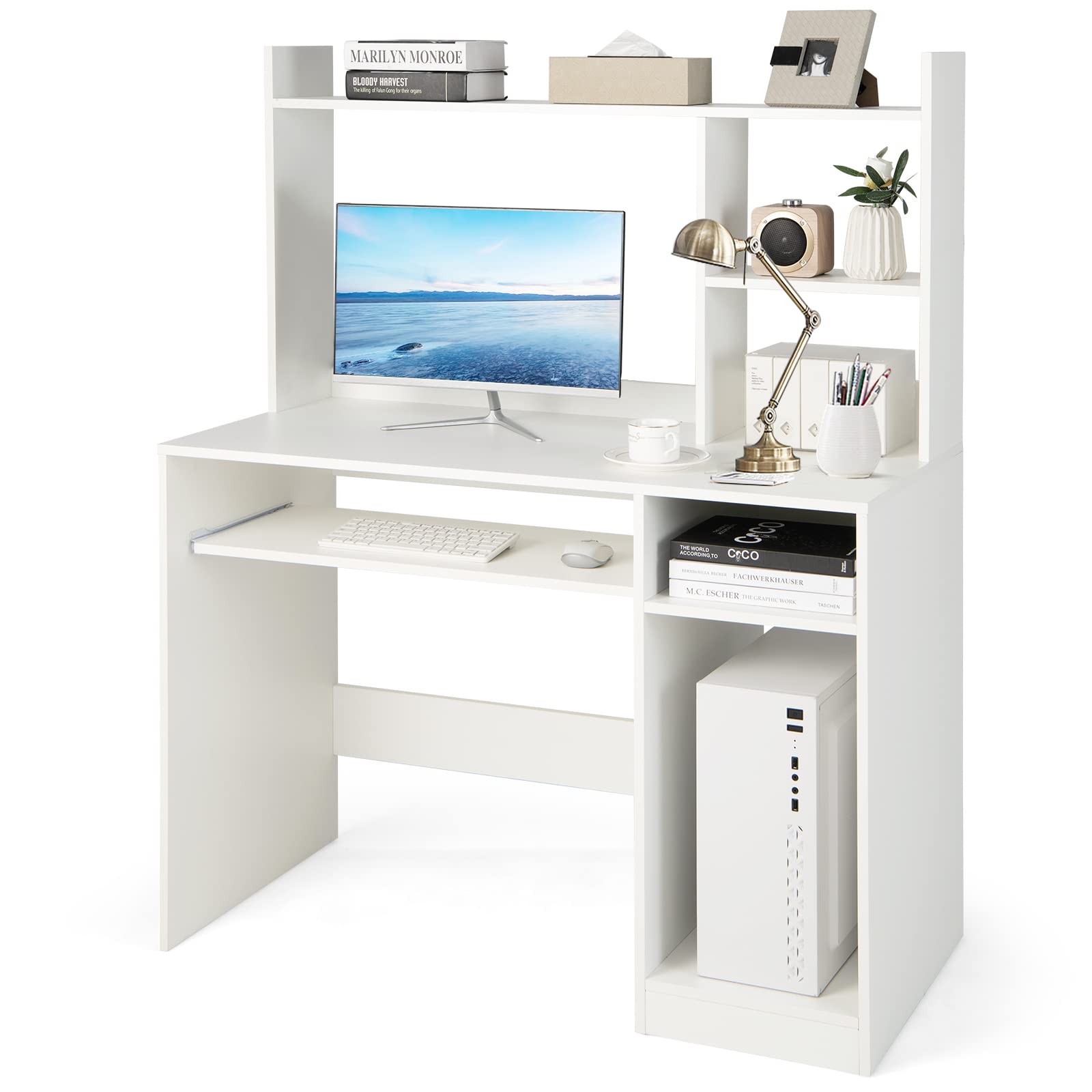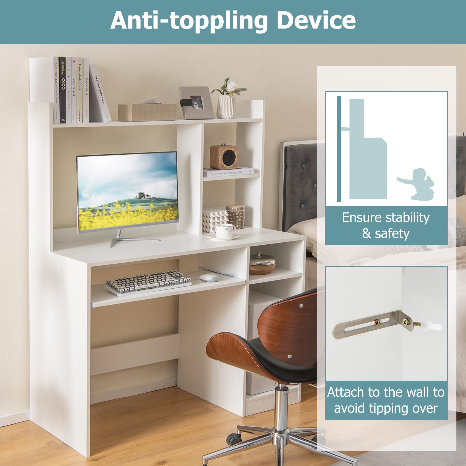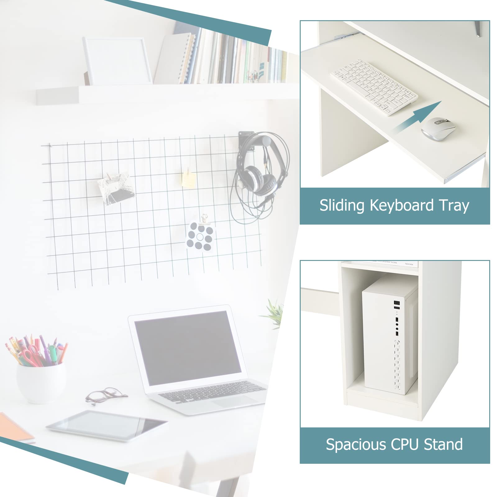Featuring spacious desktops and open storage shelves, this writing desk with a hutch can easily accommodate your laptop, keyboard, books, files, and accessories. With the smooth easy-cleaning surface, you can clean the desk with a cloth. The sliding keyboard tray and CPU stand will bring much convenience to your working and studying. This computer PC table has a durable and strong structure. You can also attach the table to the wall with the anti-toppling device to avoid tipping over and ensure stability & safety. This multifunctional desk can be served as a computer PC table, office desk, study workstation, writing desk, or gaming table. It is suitable for a study room, bedroom, living room, and office. With clean, simple lines, this white writing desk will create an elegant comfortable feel to your home office!