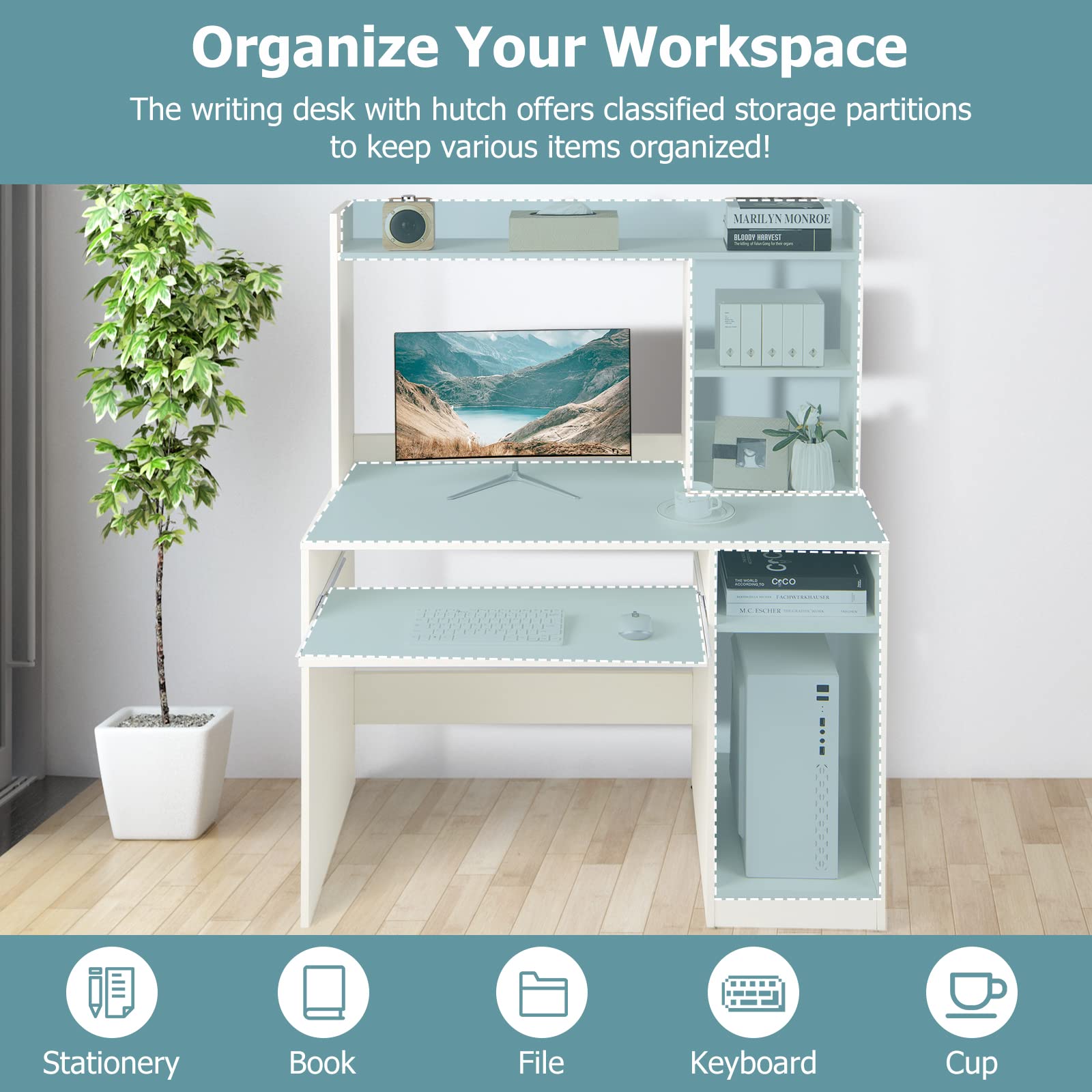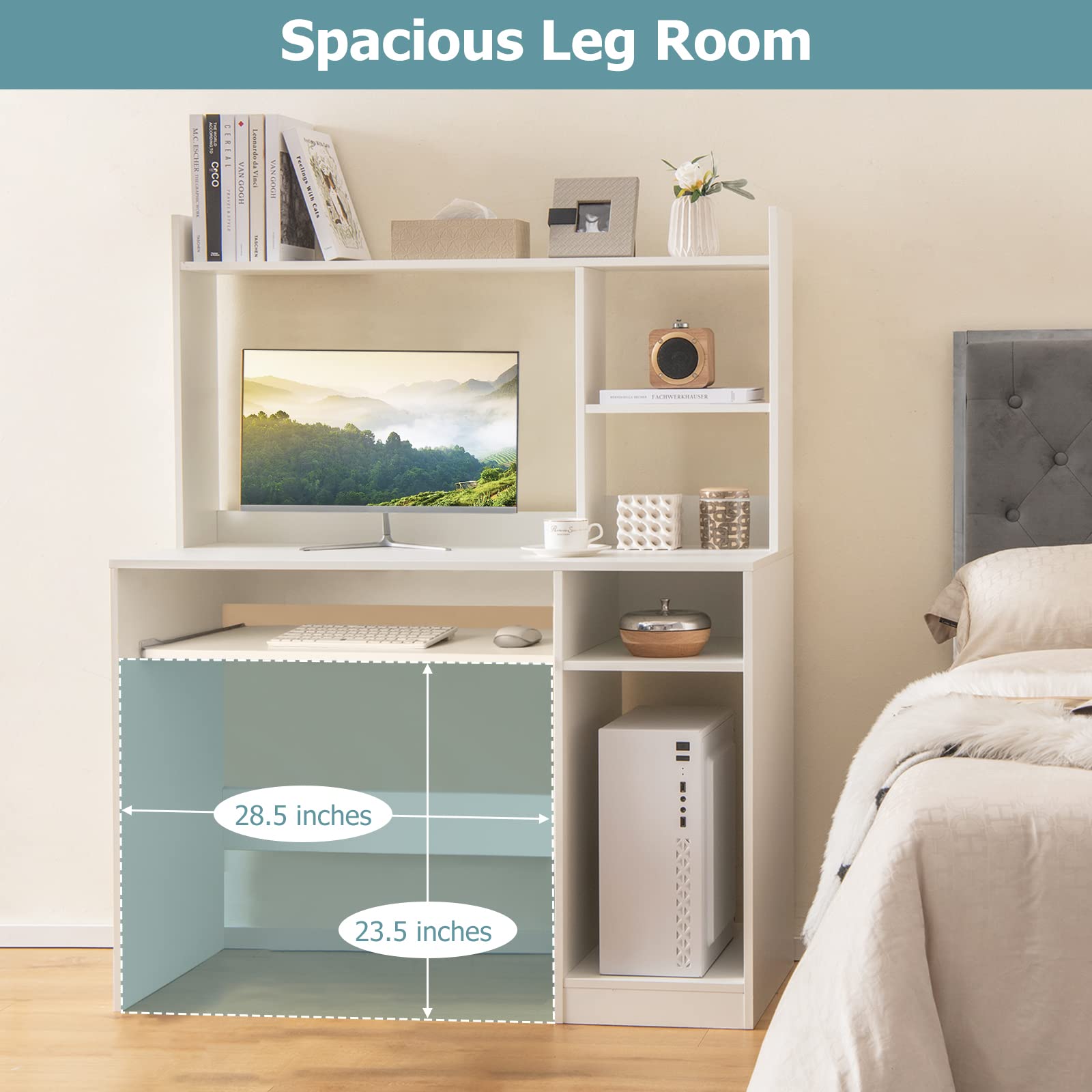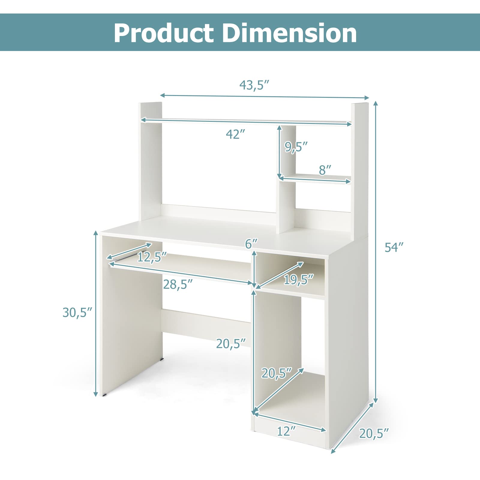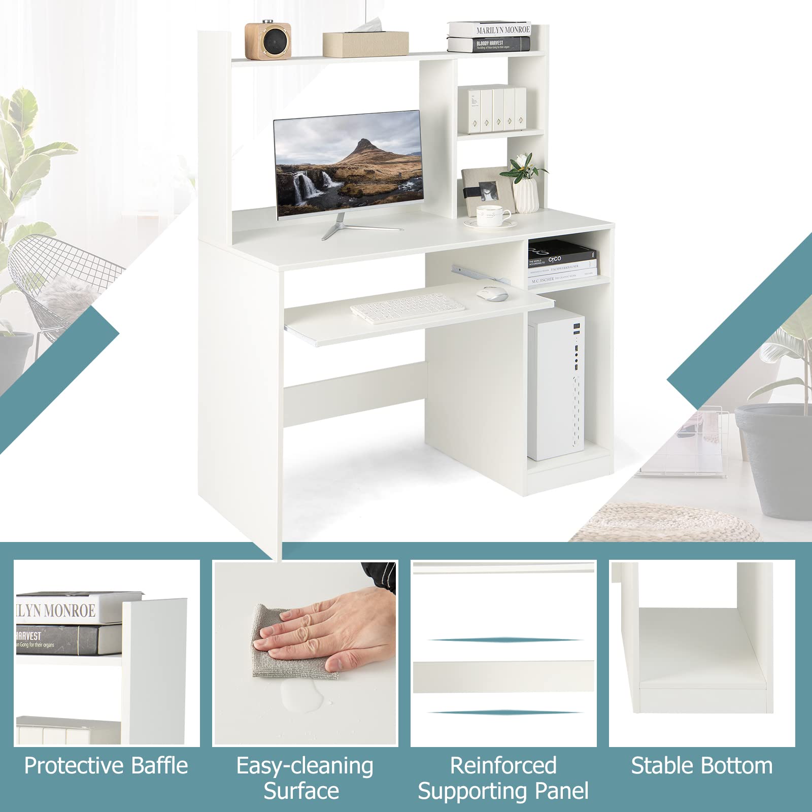 Featuring spacious desktops and open storage shelves, this writing desk with a hutch can easily accommodate your laptop, keyboard, books, files, and accessories. With the smooth easy-cleaning surface, you can clean the desk with a cloth. The sliding keyboard tray and CPU stand will bring much convenience to your working and studying. This computer PC table has a durable and strong structure. You can also attach the table to the wall with the anti-toppling device to avoid tipping over and ensure stability & safety. This multifunctional desk can be served as a computer PC table, office desk, study workstation, writing desk, or gaming table. It is suitable for a study room, bedroom, living room, and office. With clean, simple lines, this white writing desk will create an elegant comfortable feel to your home office!