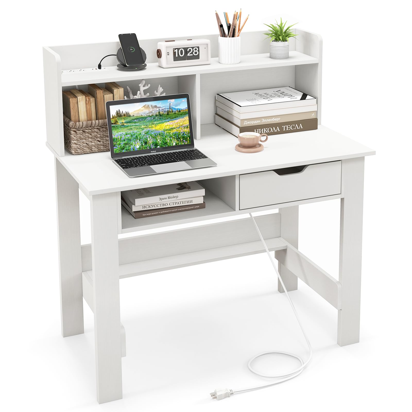 Elevate your work environment with our computer desk, specifically designed to accommodate all your study and work necessities. The desk includes a built-in charging station and cable hole for convenient access to power outlets for connecting your electronic devices. The spacious desktop and open storage hutch provide ample space for organizing and displaying items. With an open compartment and a drawer, this desk offers plenty of storage to keep your workspace neat and orderly. Bring this computer desk to your home office to optimize and expand your workspace effectively.