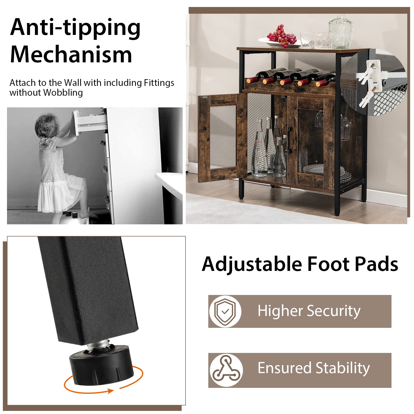 [Anti-tipping Mechanism & Easy Assembly]: Featuring anti-tipping device, the wine rack table can be attached to the wall with included fittings without wobbling. Besides, two mesh doors and side plates are designed to realize the functions of visualization as well as ventilation, which is convenient for you to see the inside whether from front view of from side view.