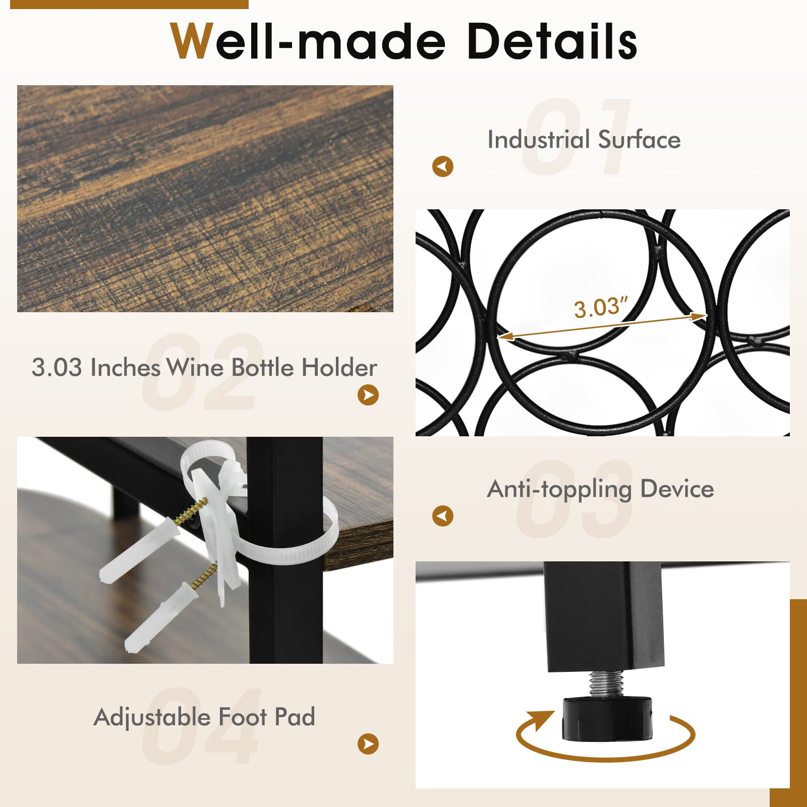 Featuring a 3-tier wine rack, 3-layer open shelves, and 4-row glass holder, this indoor furniture combines a wine rack and storage table as one, convenient to put the needed items at once. More storage space, more organized room. Meanwhile, the wine rack allows the wine bottle to be stored at an angle for better flavor. You may show curiosity about what makes our wine table better than others. It is a thickened metal frame with a stronger bearing capacity of up to 330 lbs, which is superior to the ultra-thin metal frame for instability. And the anti-toppling devices make this coffee bar table safer for daily use. There are many more well-made details waiting for you to explore.