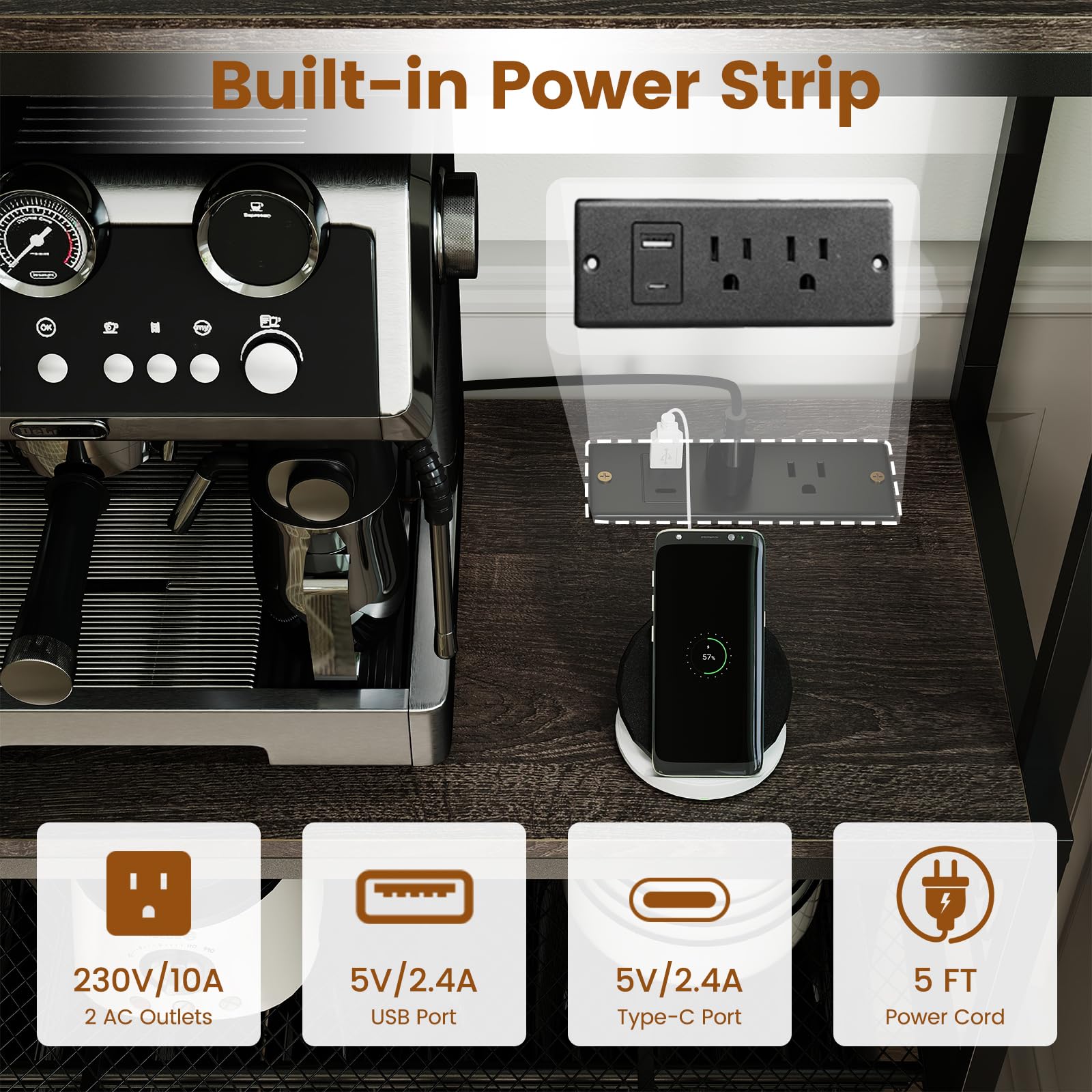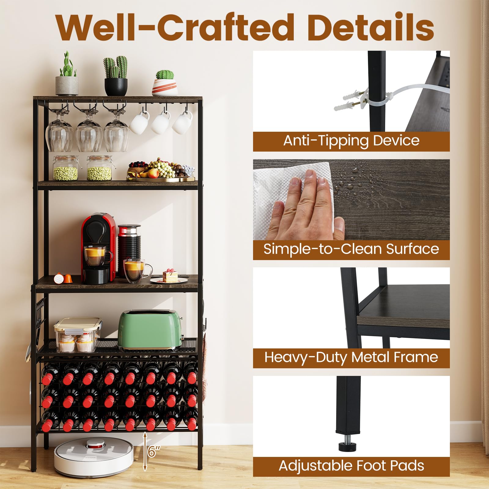 This exquisite storage rack includes a built-in power strip for convenient device charging. And the freely adjustable light effect offers more elegance. It also features 4-tier sufficient storage space, plus specialized sections for 24 wine bottles, 9 stemware glasses and 9 mugs. Enhanced with a reinforced metal frame and designed with an industrial aesthetic, the wine rack with well-crafted details brings not only utility but also a sleek allure to your kitchen or home bar. Elevate your home’s functionality and style with this essential addition!