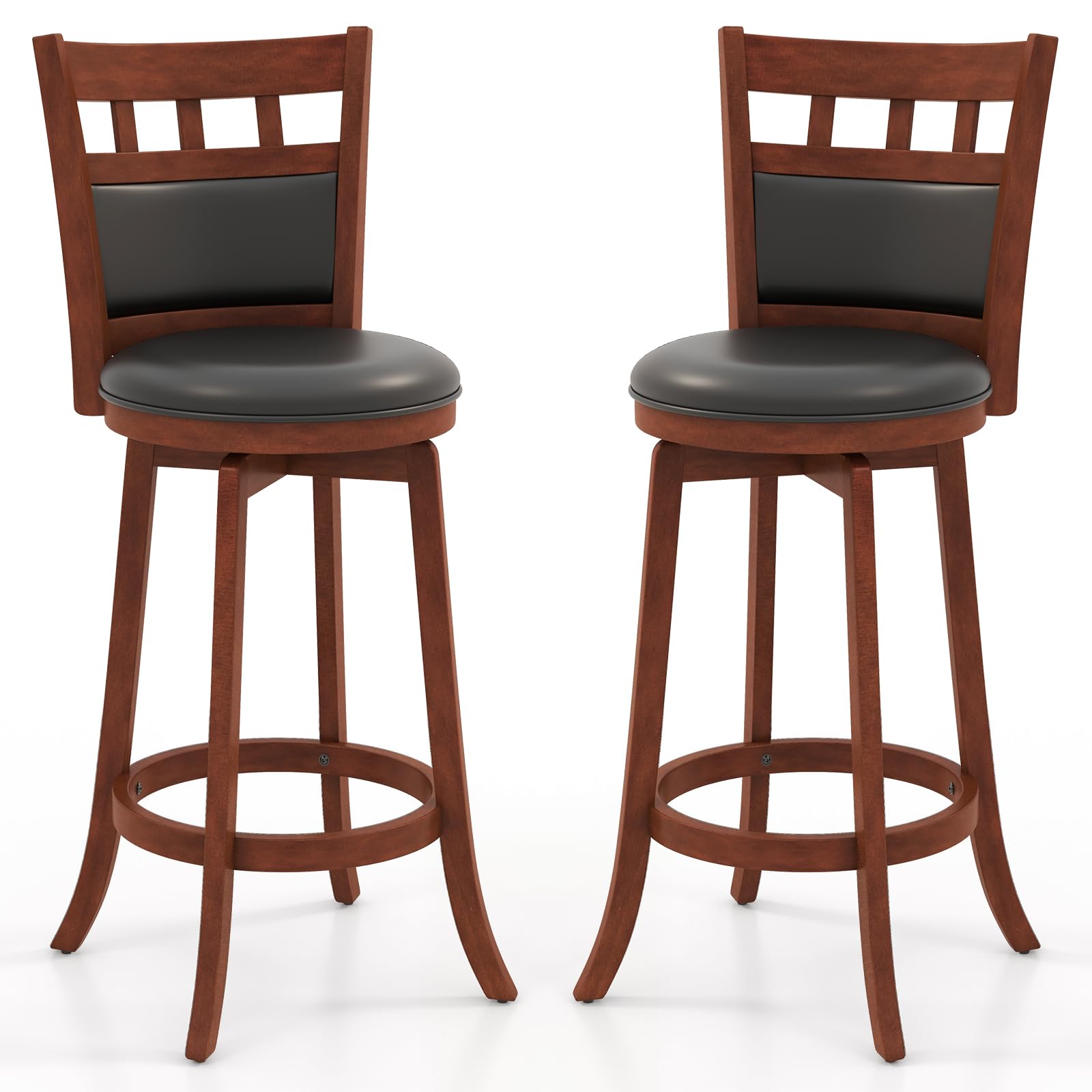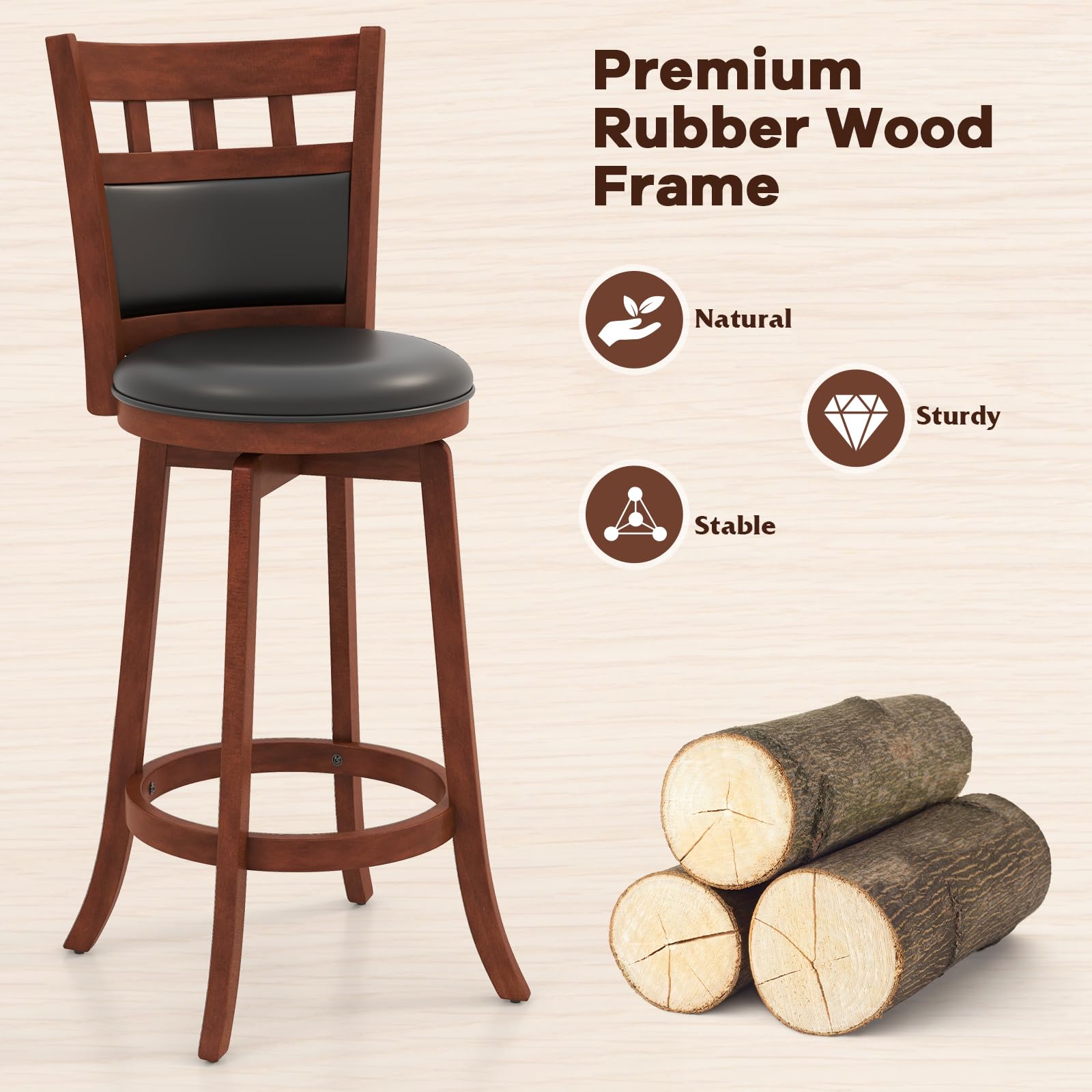 Are you looking for premium kitchen bar stools? Look no further! Crafted from high-quality rubber wood, these stools offer a sturdy and stable seating option with a touch of natural elegance. The 360° swivel seat design allows you to rotate effortlessly, while the round footrest enhances comfort and stability. Enjoy a comfortable sitting experience with the ergonomic padded backrest and soft cushion, supported by high-density foam and waterproof PVC cover for easy cleaning. These bistro stools feature exquisite details like a breathable hollowed backrest and sturdy supporting legs with non-slip foot pads. They can perfectly complement bar tables ranging from 40" to 43" and are ideal for kitchen islands, dining rooms, bars, and cafes.