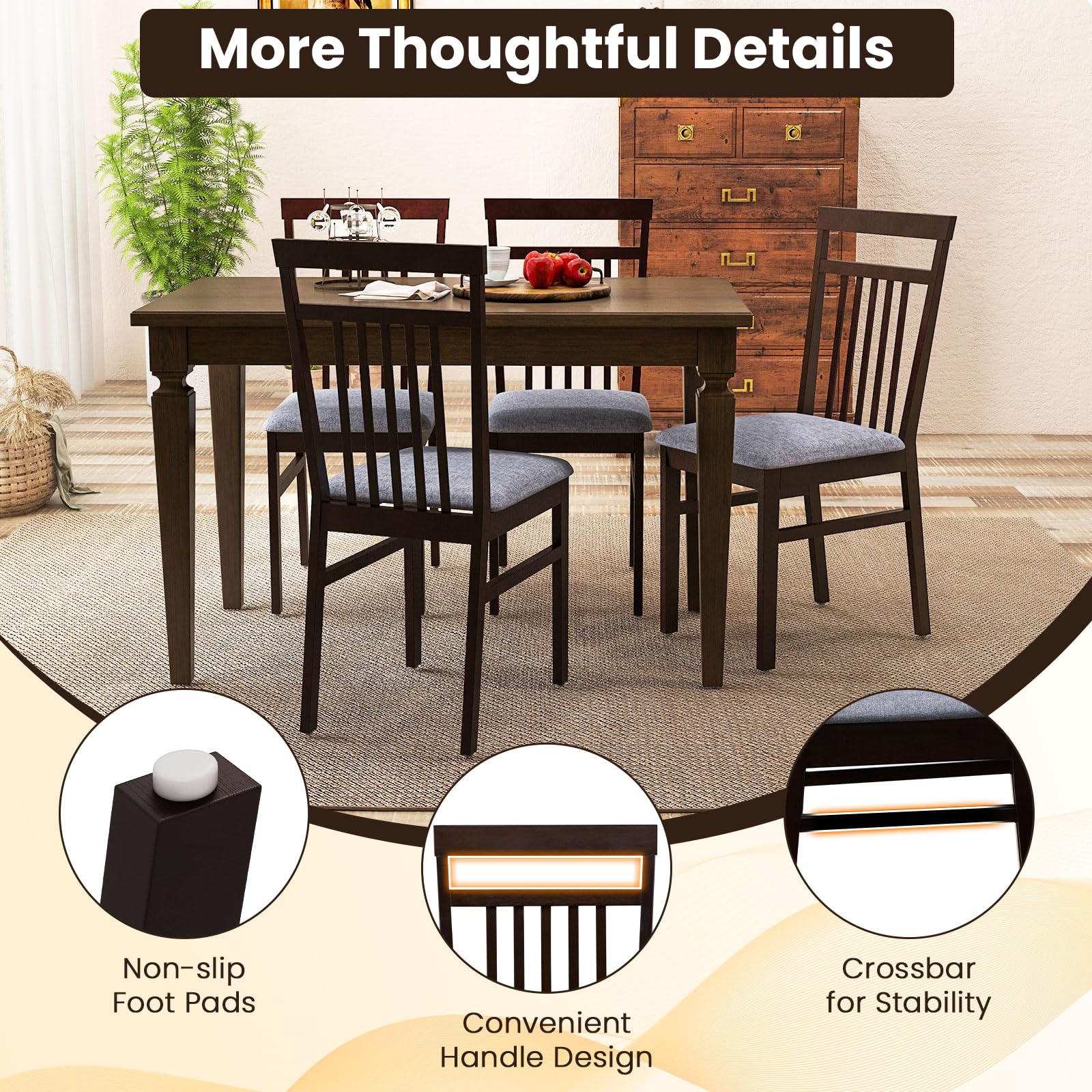 √ The chair's sturdy wood legs are equipped with non-slip foot pads, ensuring stability and safety.