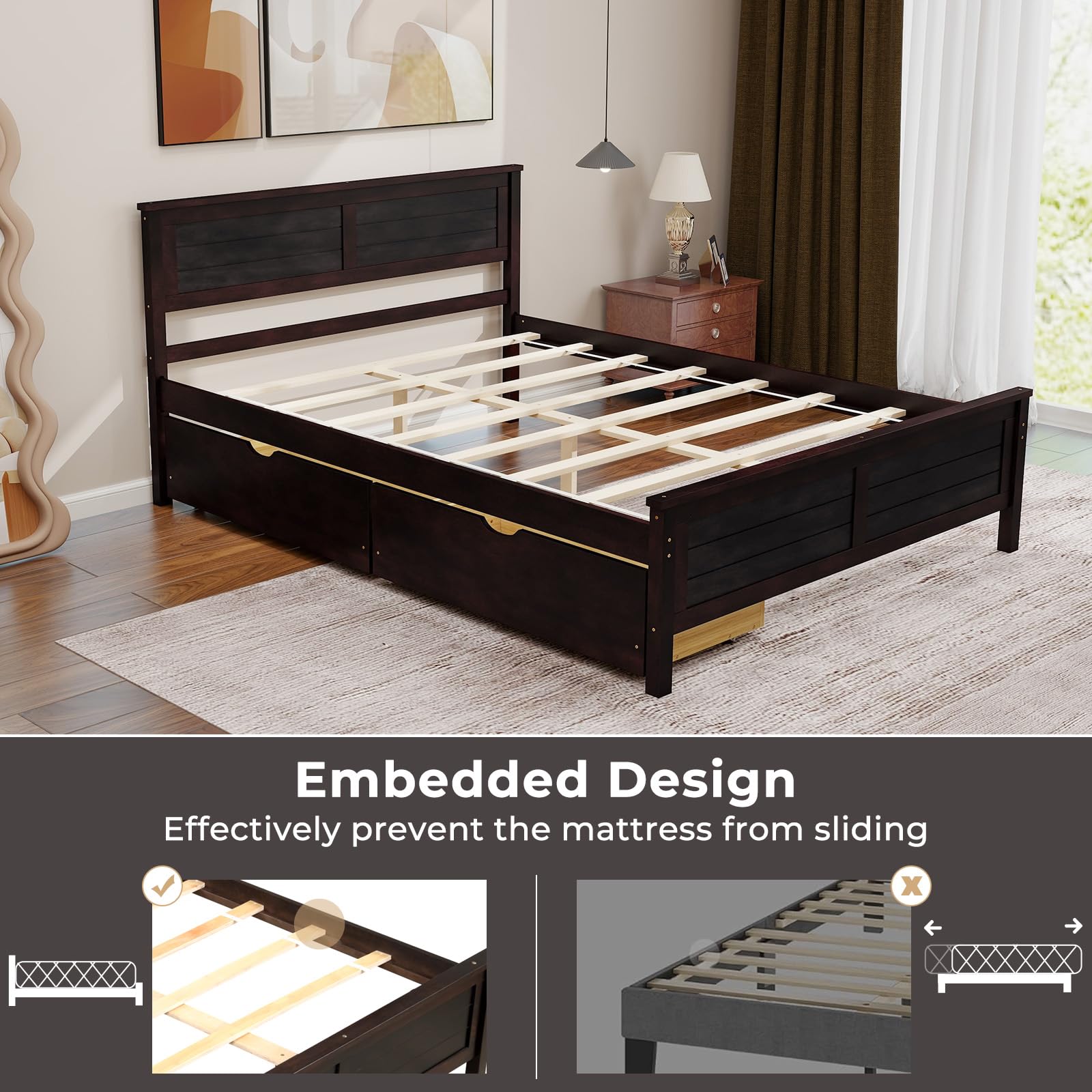 - [Thoughtful and User-Friendly Design]: Our embedded design prevents mattress sliding, ensuring a consistently comfortable sleeping experience. Thoughtful drawer stoppers ensure that the drawers stay in a fixed position, promoting tidy and organized storage.
