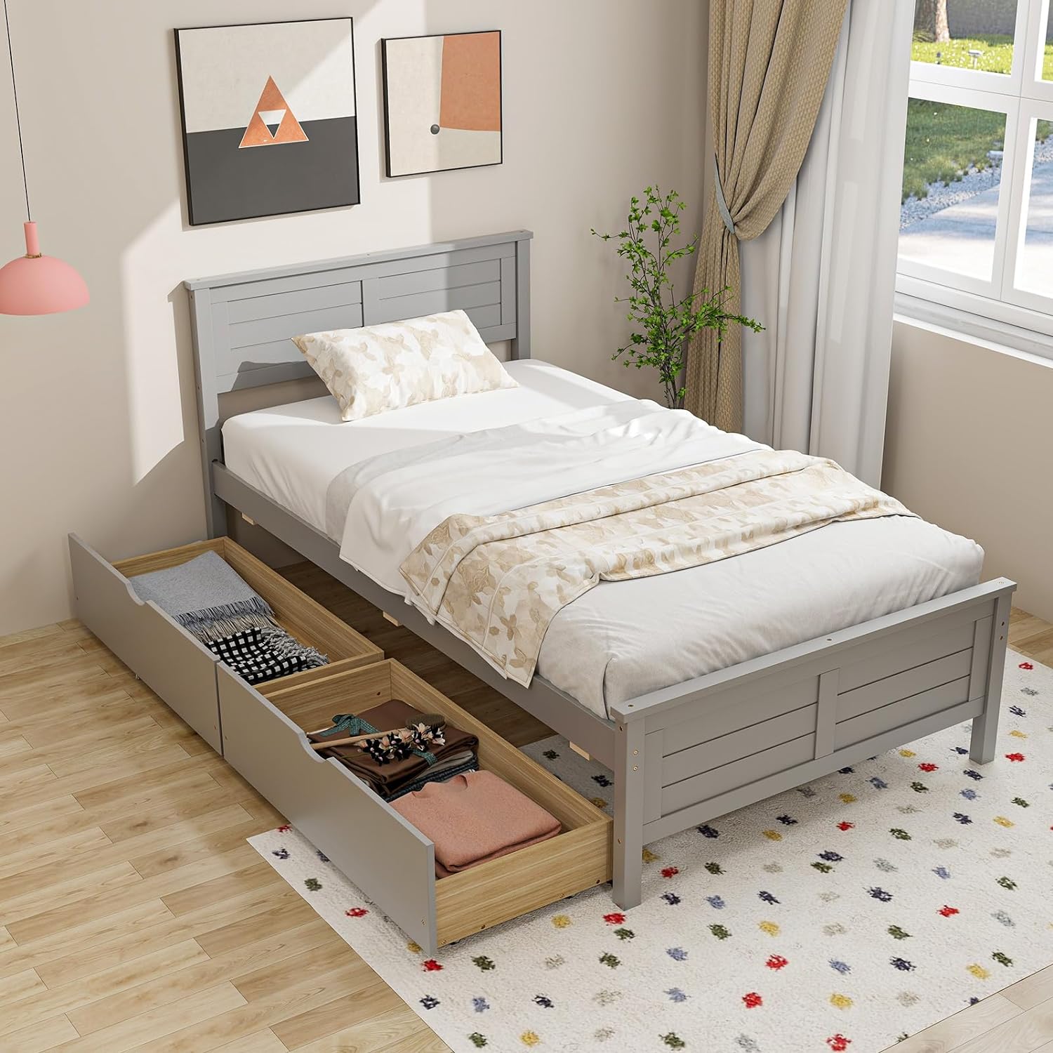 - [Discover Extra Storage Space]: Maximize your bedroom space with our platform bed featuring 2 large drawers on wheels. Perfect for stowing away seasonal clothes and other essentials, these slide-out drawers provide convenience with cut-out handles and smooth wheels, ensuring easy access. Plus, the versatile design allows you to use the drawers on either side of the bed.