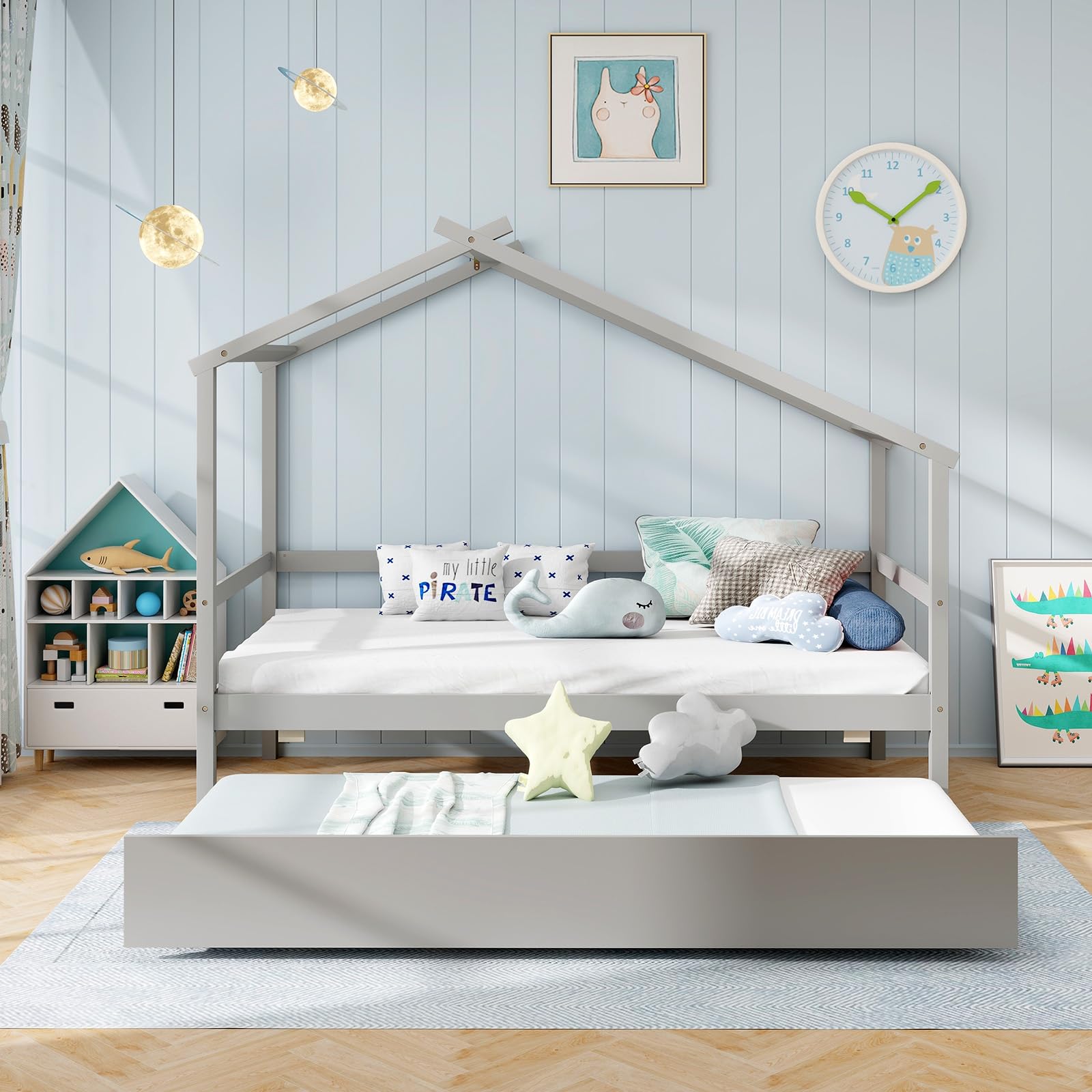 Immerse your child in a space that is as functional as it is whimsical—perfect for DIY decorating enthusiasts with space for string lights or banners. Crafted from top-notch solid wood with a smooth finish, the kids daybed transforms bedtime into an exciting adventure. Worried about overnight guests? Roll out the cleverly concealed trundle bed for effortless sleepover setups. No box spring needed, thanks to robust wooden slat support! Dive into this blend of charm and convenience—where style meets imagination. Turn your child’s bedroom into a captivating retreat where dreams come alive!