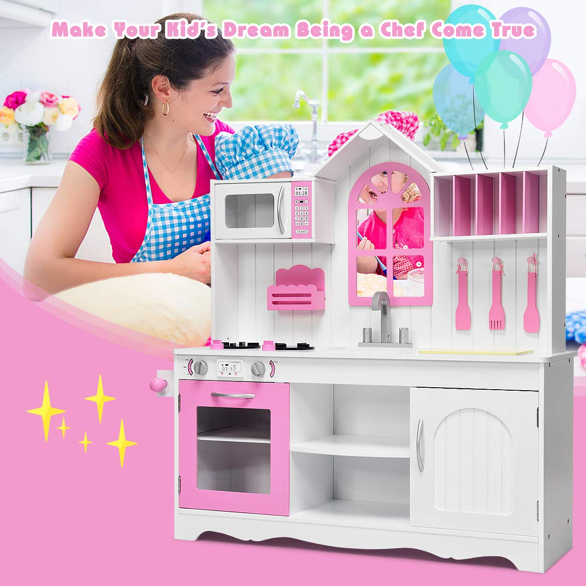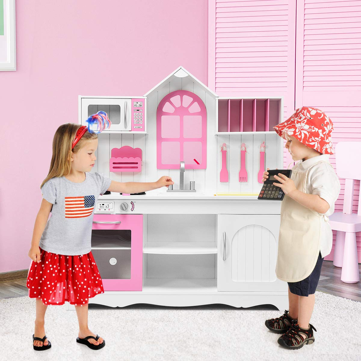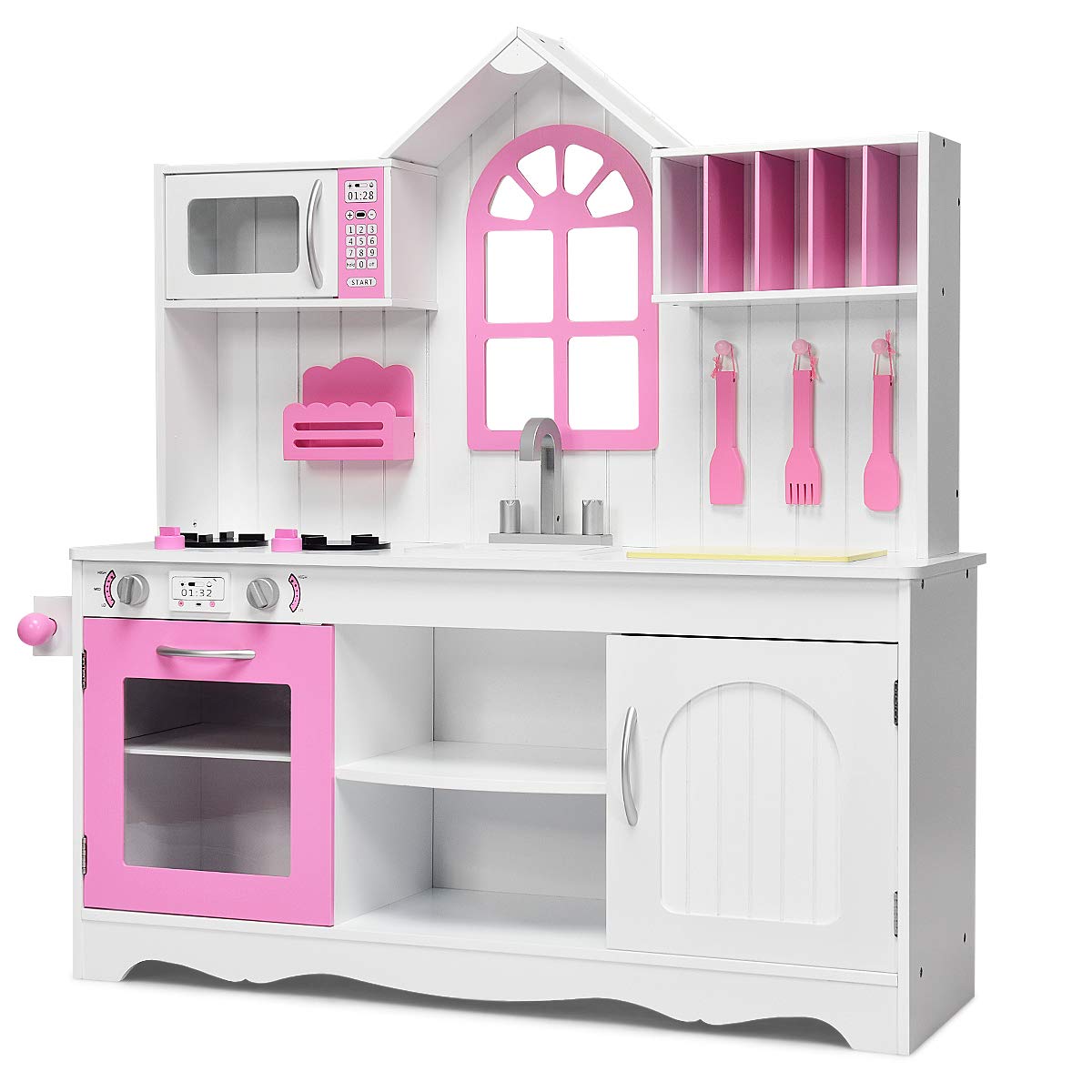 - Wood Kitchen Play Toy: Giantex pink adorable wood kitchen play toy is perfect for your kids to pretend to cooking big feasts for the whole family. It provides role-play fun for hours for your young chefs.