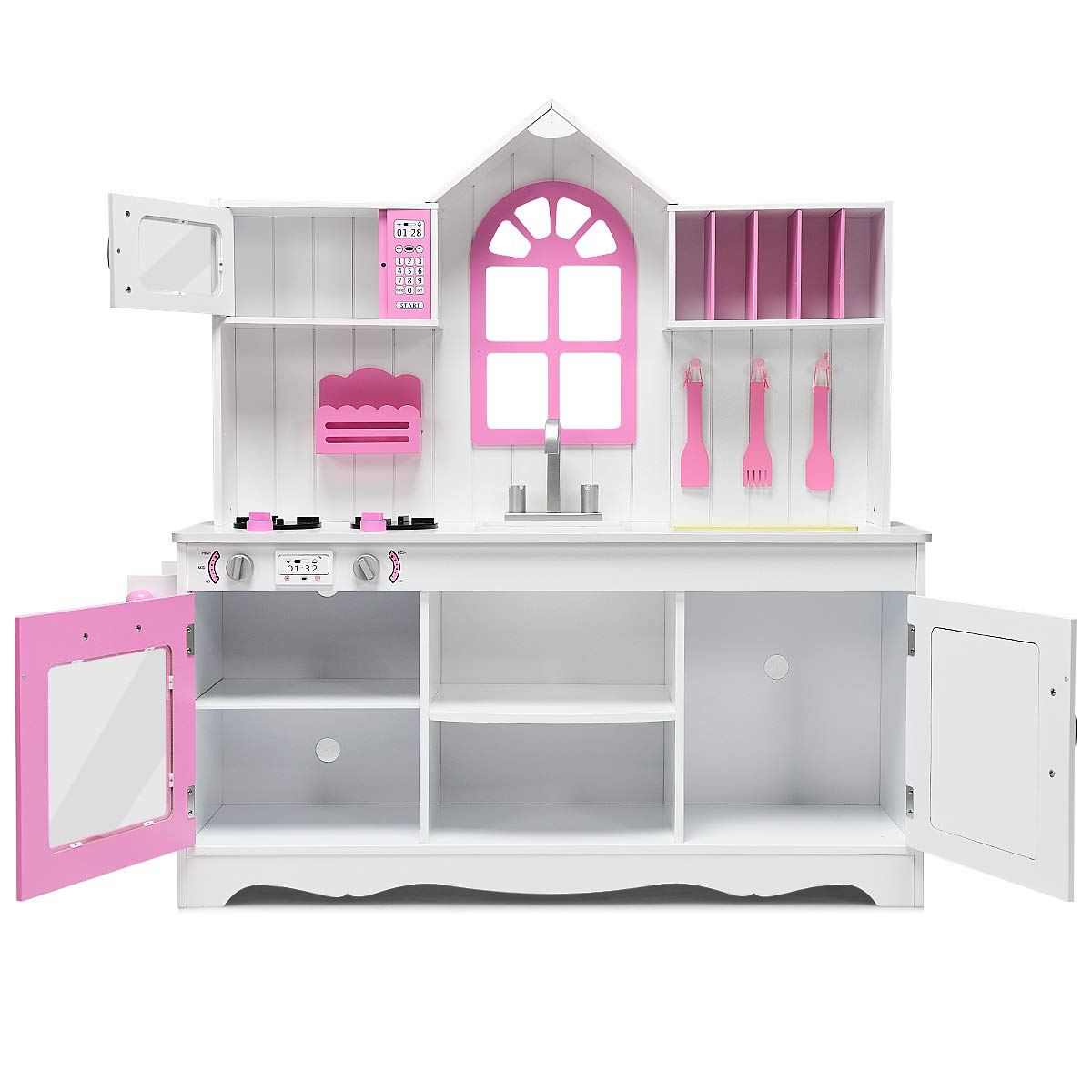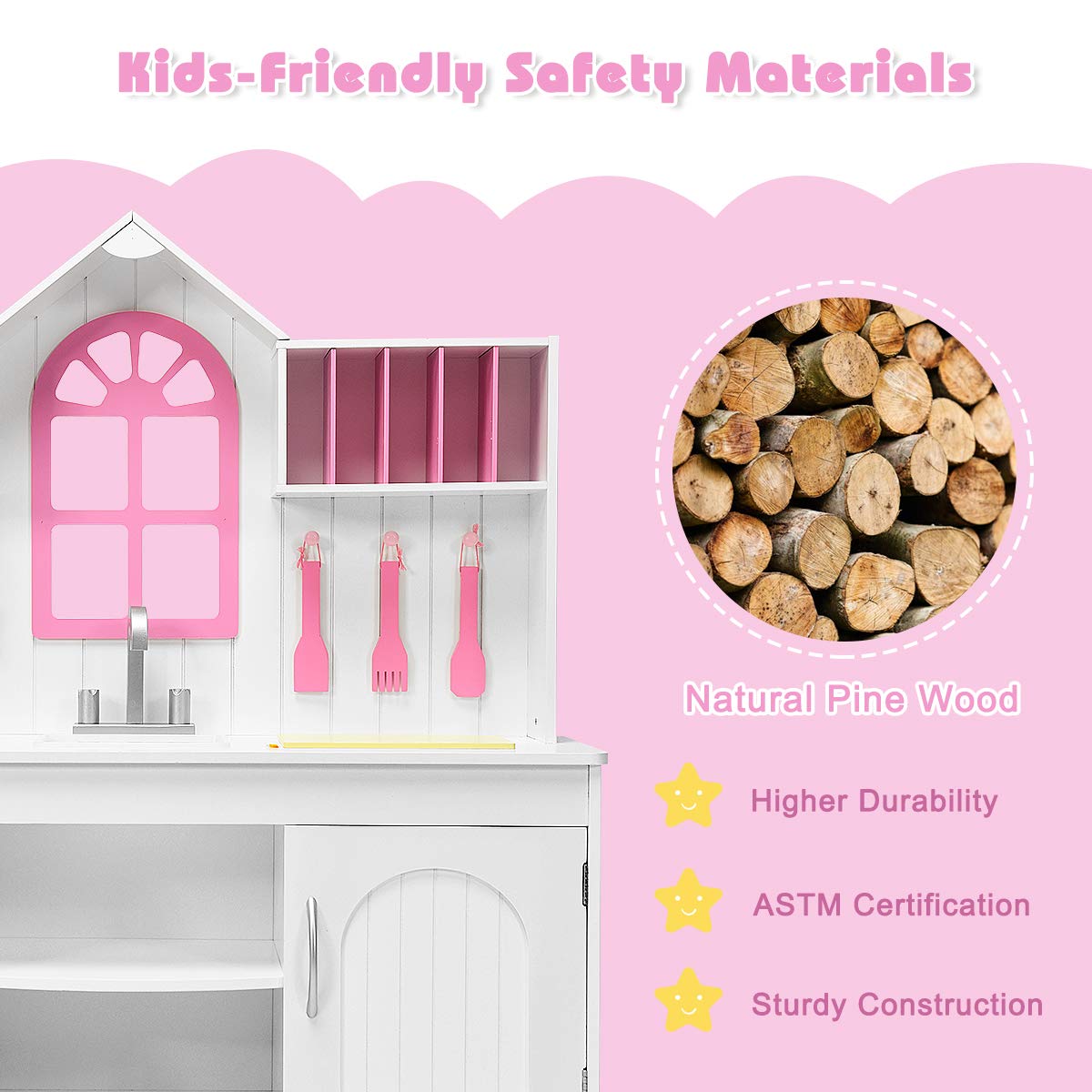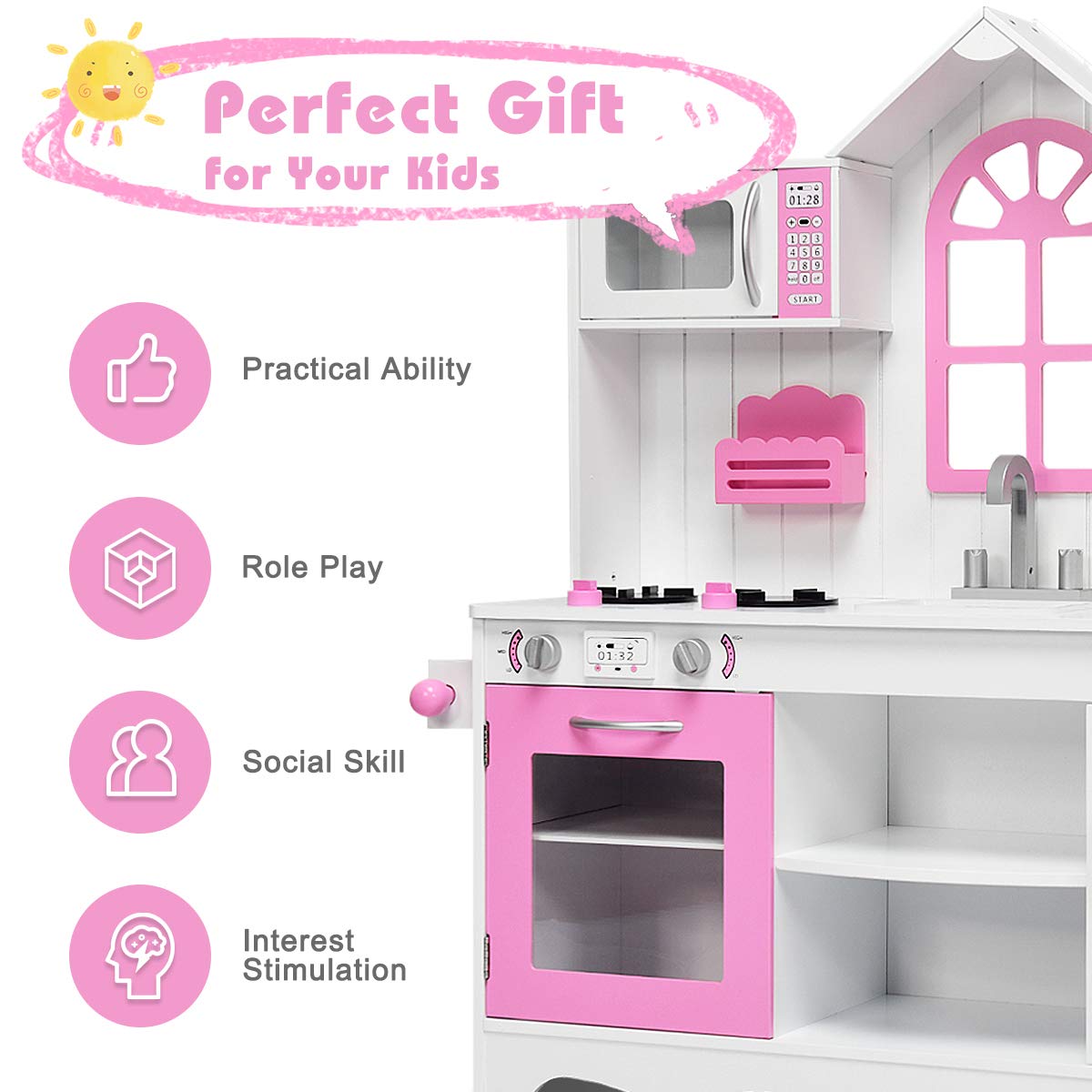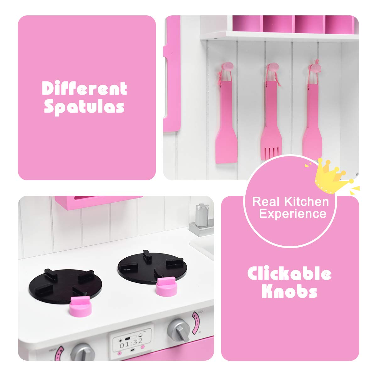 - Wood Kitchen Play Toy: Giantex pink adorable wood kitchen play toy is perfect for your kids to pretend to cooking big feasts for the whole family. It provides role-play fun for hours for your young chefs.