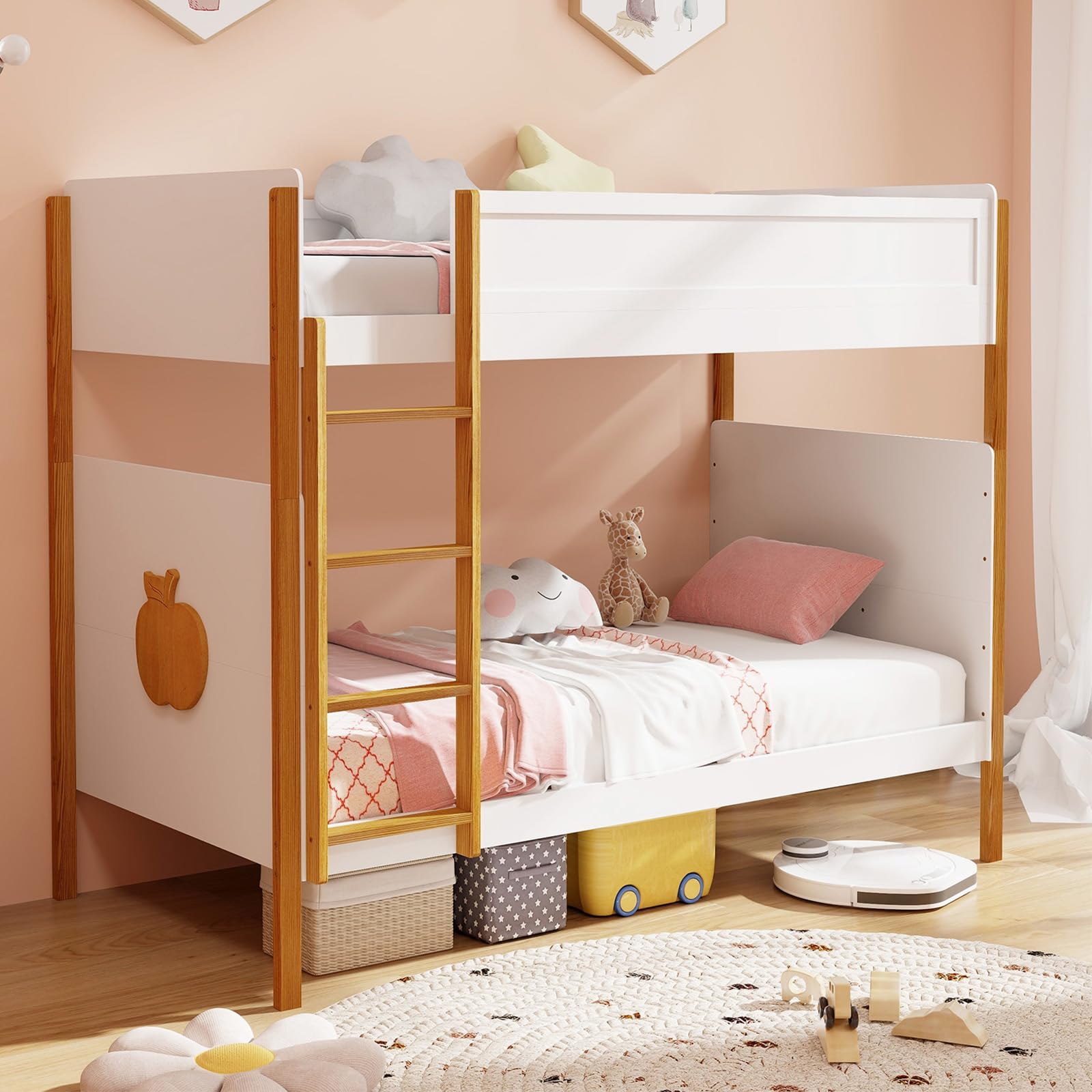 - Adorable Appearance: The combination of unique apple decoration, white and natural colors creates a captivating contrast, making it an eye-catching piece that complements any room. The bunk bed enhances the style and functionality of kids’ room, summer camp or youth hotel.