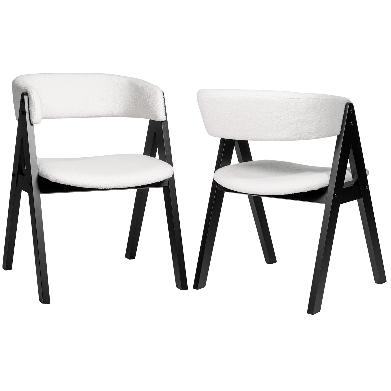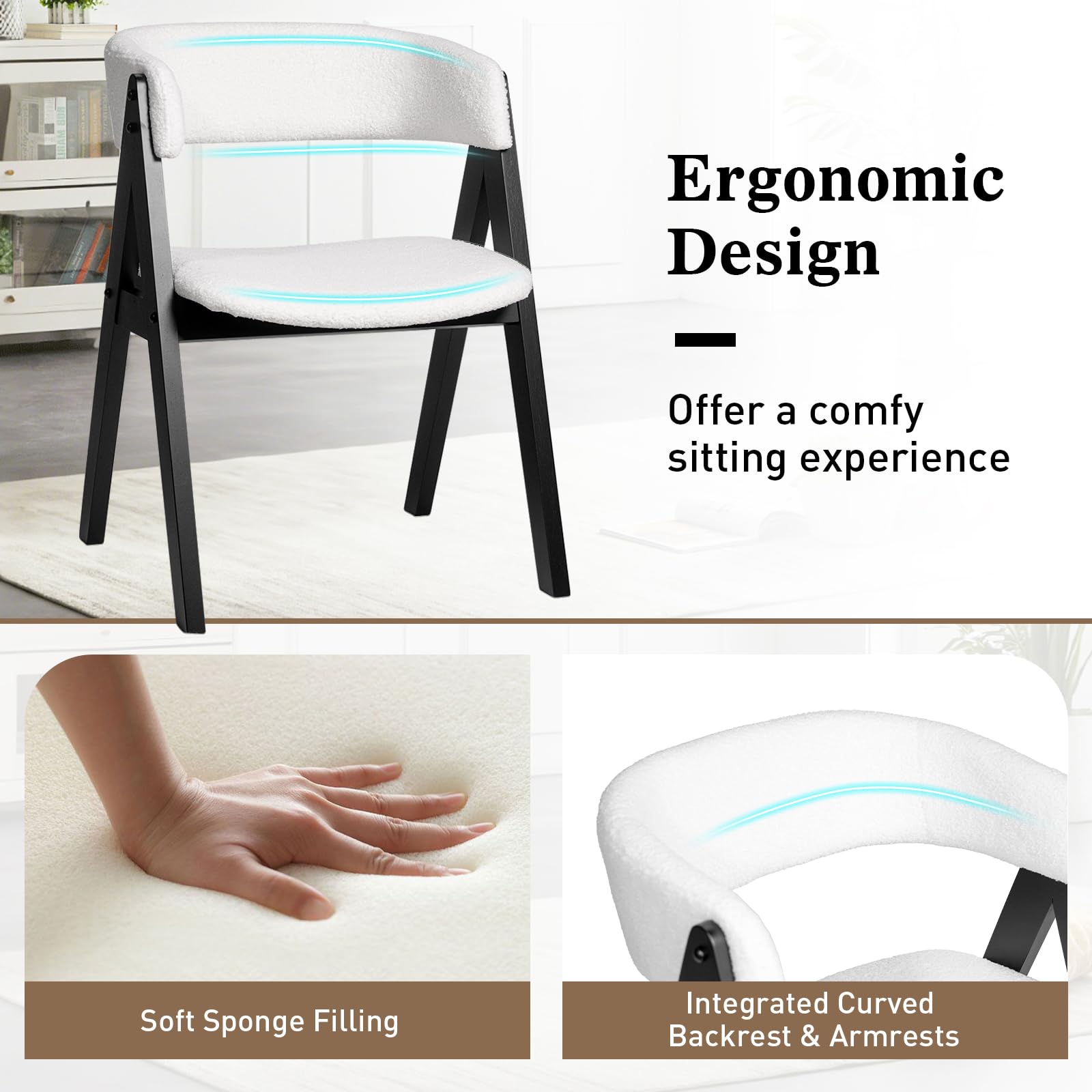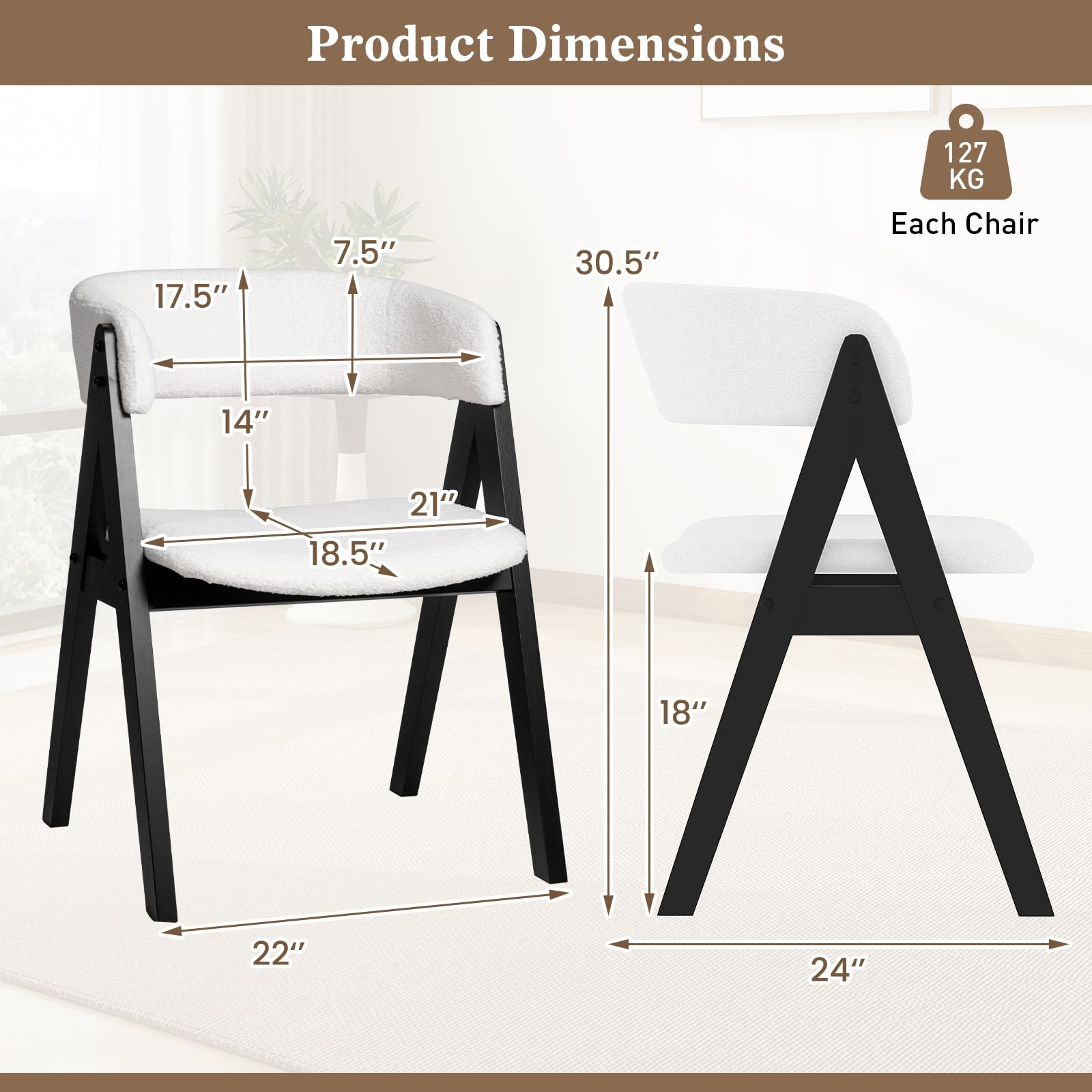Our farmhouse wooden dining chair set measures 22" x 24" x 30.5" (L x W x H), which can not only be placed around a dining table, but also be utilized as accent chairs in a reading nook, or added to a home office for a touch of elegance. At the core of each chair are solid rubber wood legs and robust LVL material in the seat and back, ensuring durability and support that withstands the test of time. These chairs are not just strong but also supremely comfortable: each is fitted with soft sponge filling and sumptuous faux sherpa fabric that invites you to sit back and relax. The wide padded seats, paired with integrated curved backrest and armrests, cradle your body in comfort with every meal. Settle into these plush chairs to enjoy both everyday meals and special gatherings with comfort and elegance.