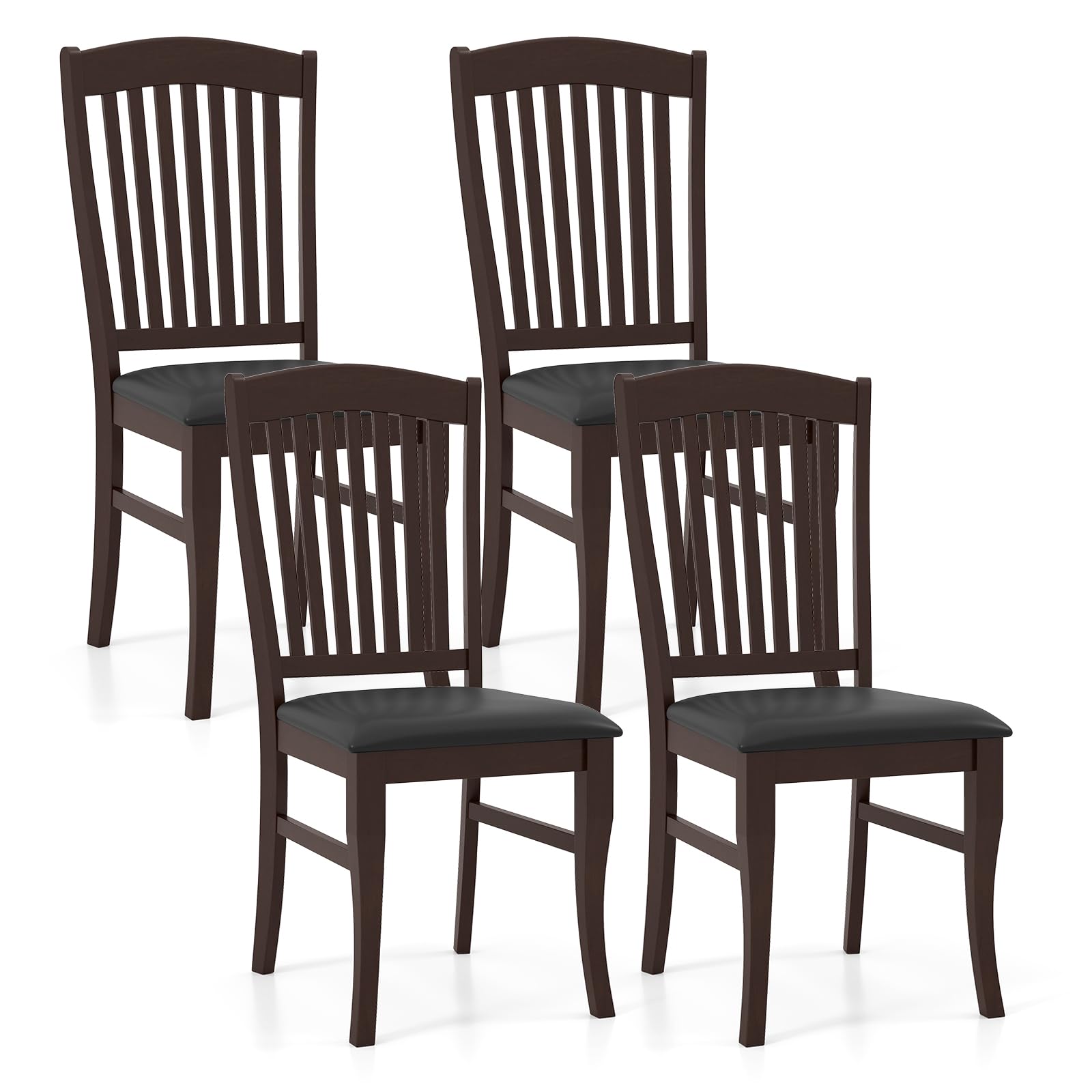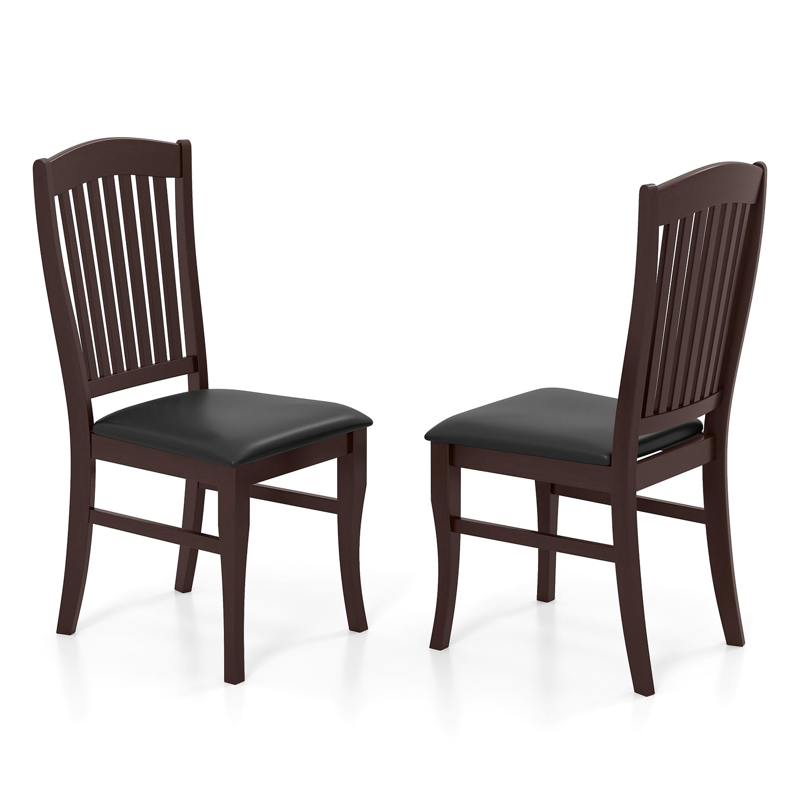 The dinette chairs are designed with PU leather coverings on the seats, which not only adds a touch of elegance but also protects the chairs from everyday wear, making them a long-lasting choice for your dining area. The soft sponge filling of our dining chairs will provide comfort during extended meals. Whether you're enjoying a leisurely brunch with your family or hosting a dinner party with friends, the plush cushioning of our chairs allows you to relax and dine in absolute comfort. Moreover, the kitchen chairs feature a slatted high backrest that provides optimal support for your spine. Crafted with a natural rubber wood frame, the dining room chairs are engineered to offer exceptional stability. Additionally, there are more thoughtful details. For example, the anti-slip feet will enhance the overall stability while protecting your floor.
