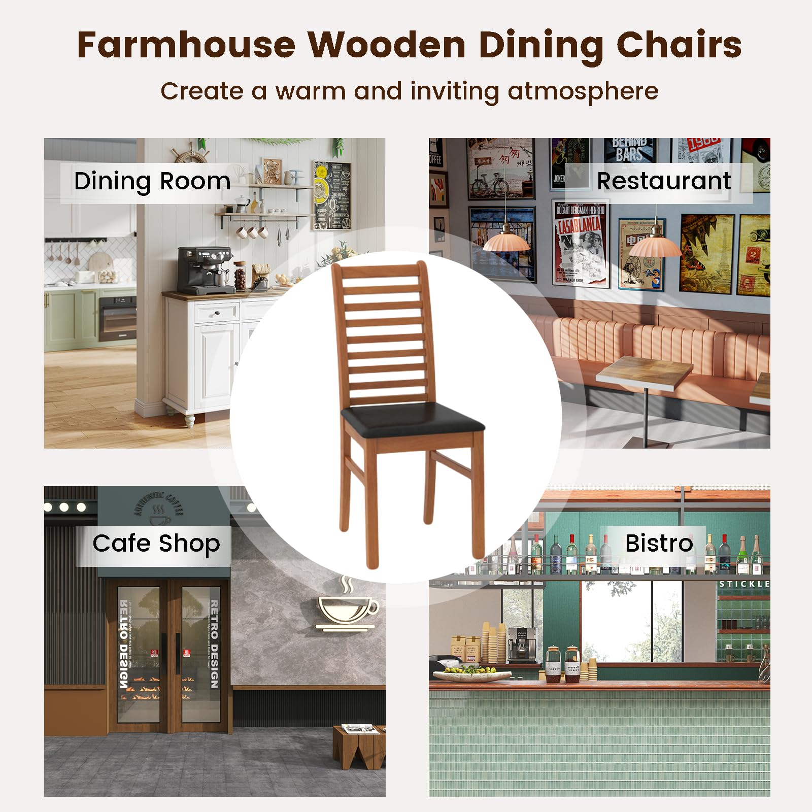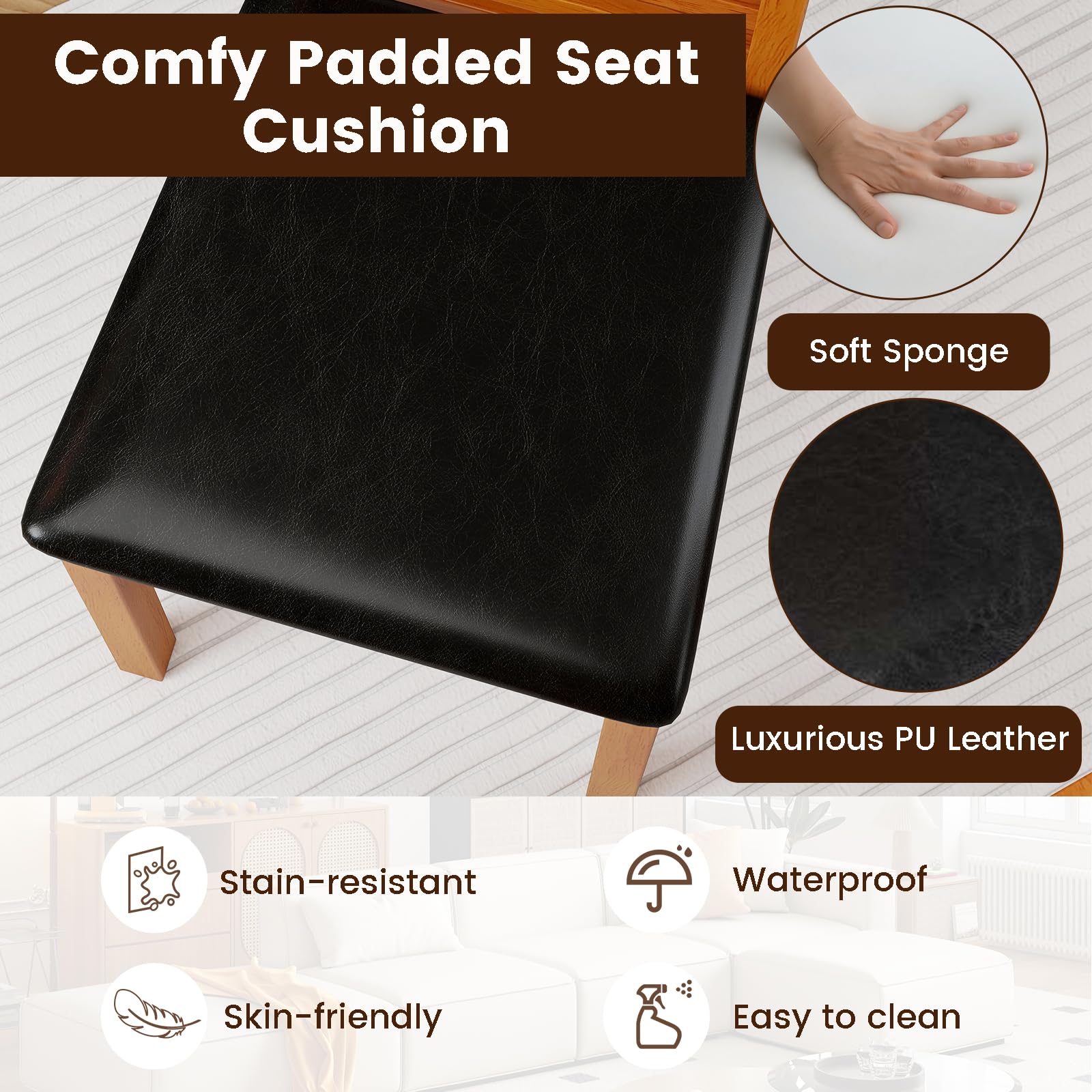 Our wooden dining chairs are constructed from robust rubber wood, ensuring longevity and stability under daily use. The seats are upholstered in luxurious, waterproof, and stain-resistant PU leather, offering an easy-to-clean surface that maintains its sophistication over time. Featuring high, curved ladder-shaped backrests, these chairs provide excellent support, reducing back strain during prolonged seating periods. With their versatile mid-century modern style, these chairs seamlessly adapt to various indoor environments, from the dining room to the office or as stylish extra seating in your living space.