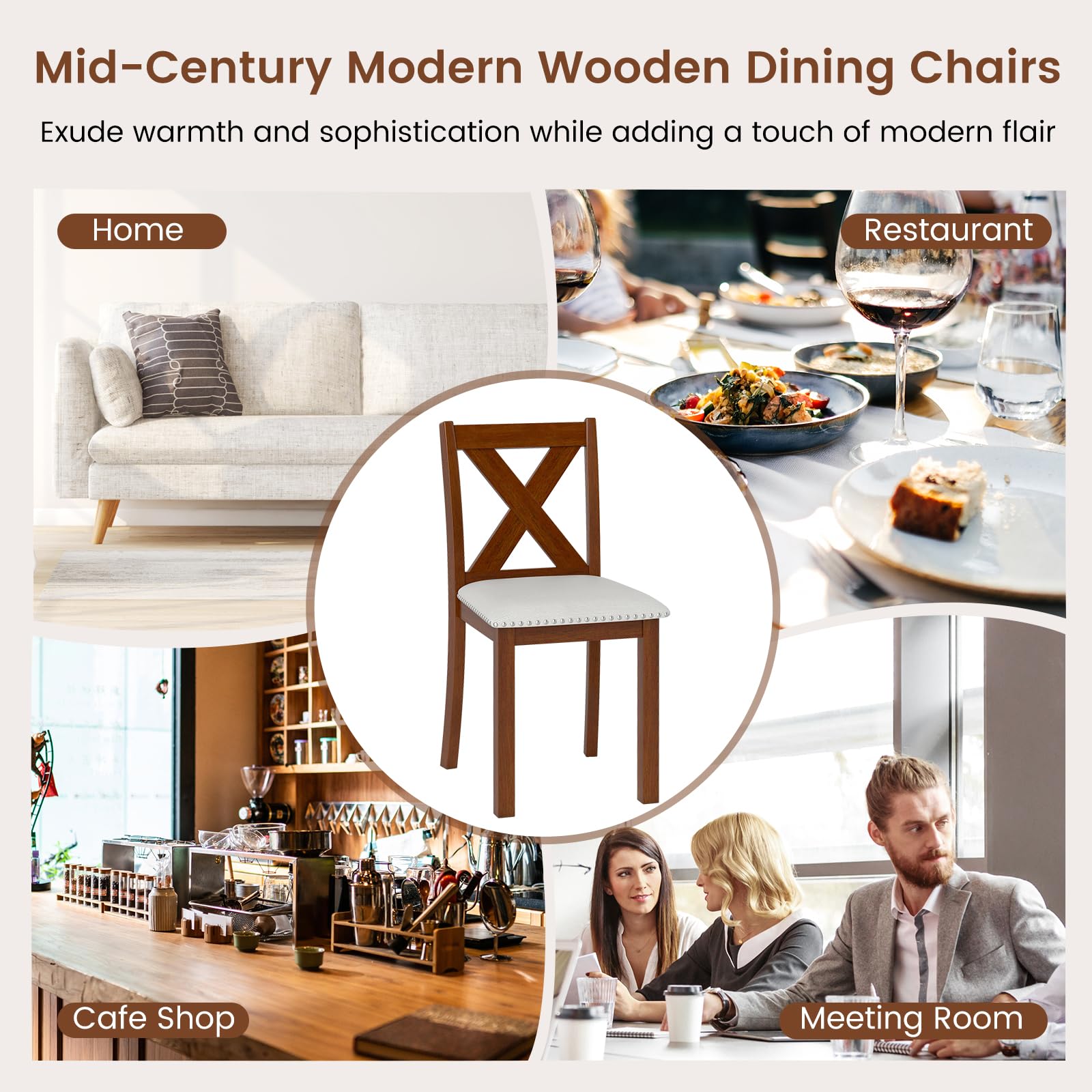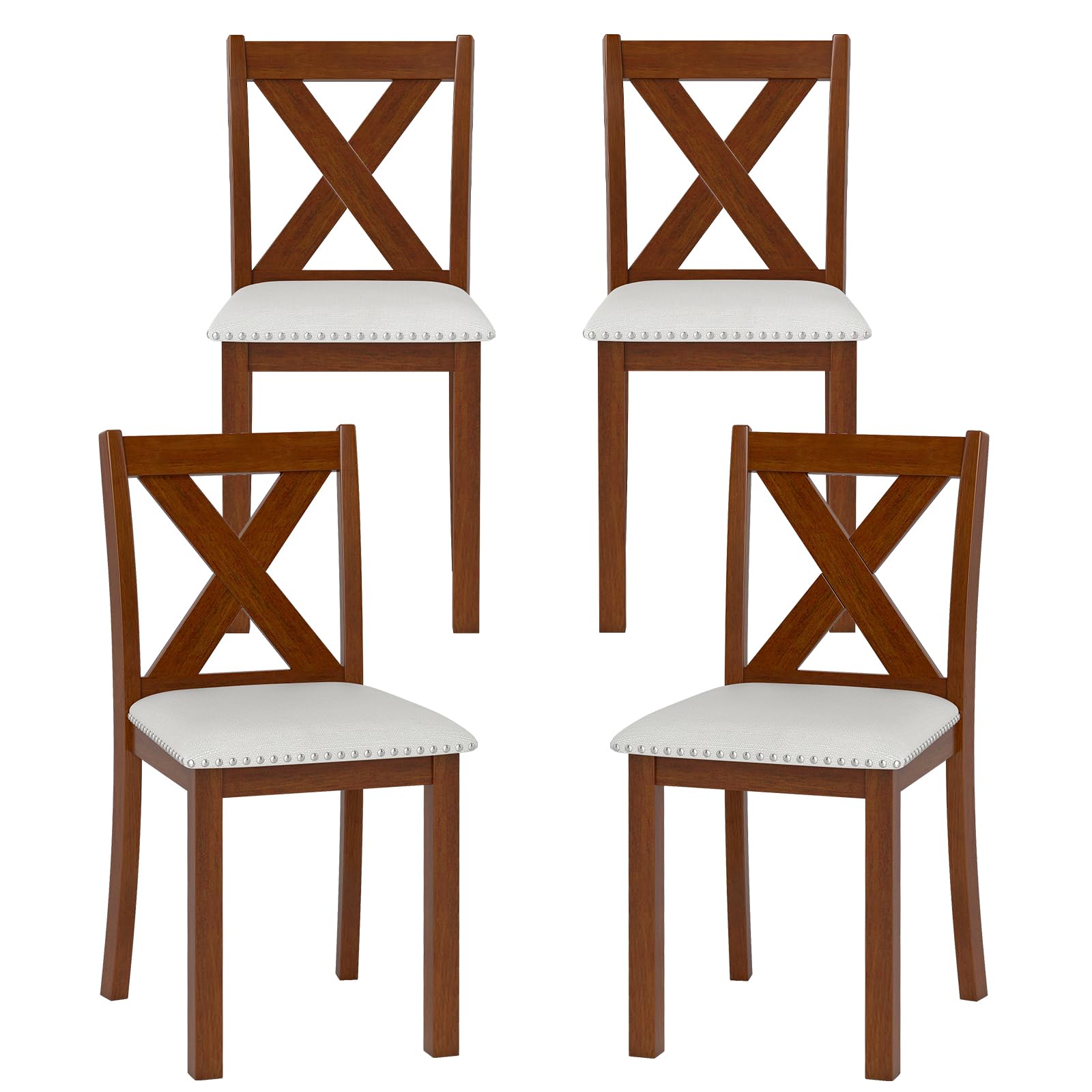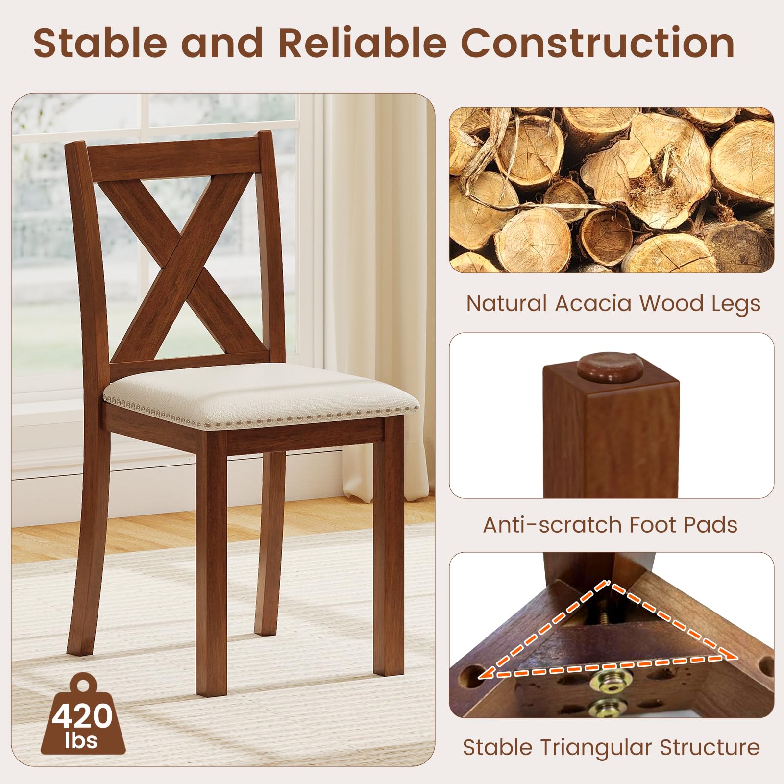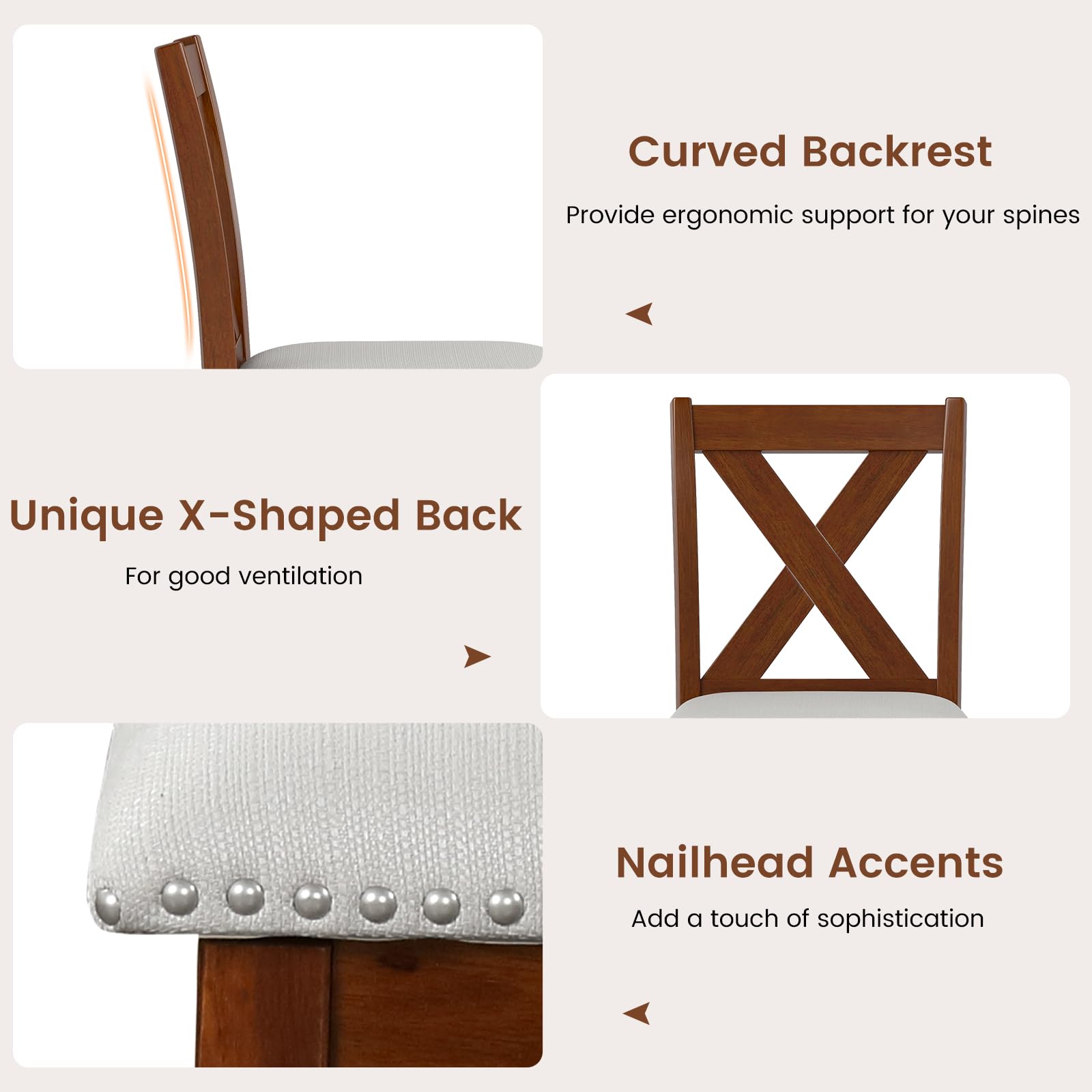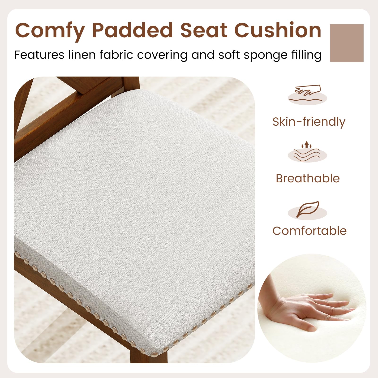 Our wooden dining chair set features solid acacia wood legs and reinforced triangular structures beneath the seats, ensuring durability you can trust for everyday use. The comfortable padded cushions are wrapped in soft linen fabric, delivering long-lasting comfort for family meals or gatherings. With gently curved backrests and unique X-shaped detailing, these chairs provide supportive seating and enhanced ventilation, making every meal more enjoyable. Elegant beige linen and rich brown wood finishes, accented by classic nailhead trim, allow these chairs to blend beautifully with a range of interiors, from dining rooms and kitchens to cafes or office spaces. Instantly refresh your space with timeless style and reliable quality.