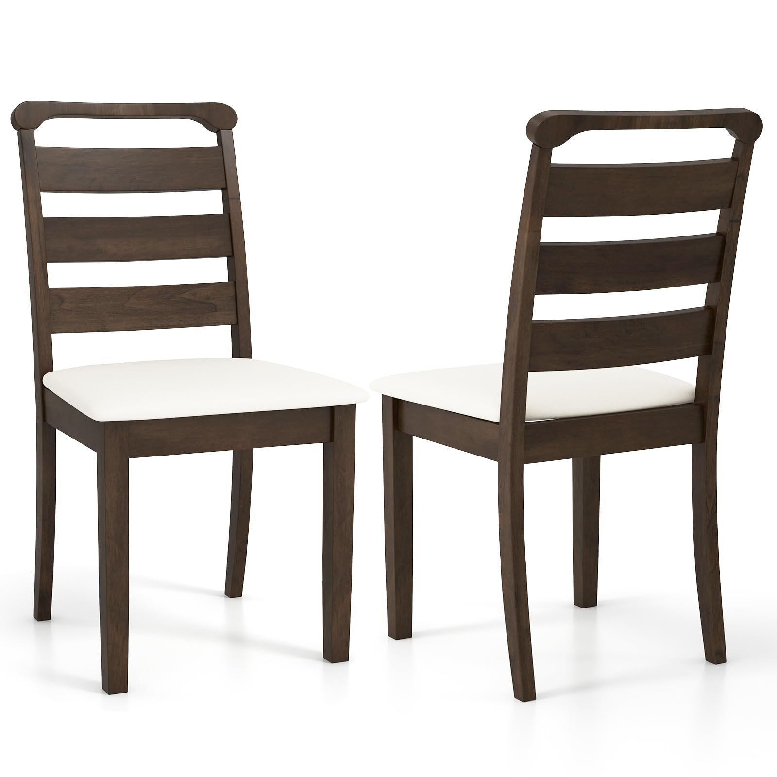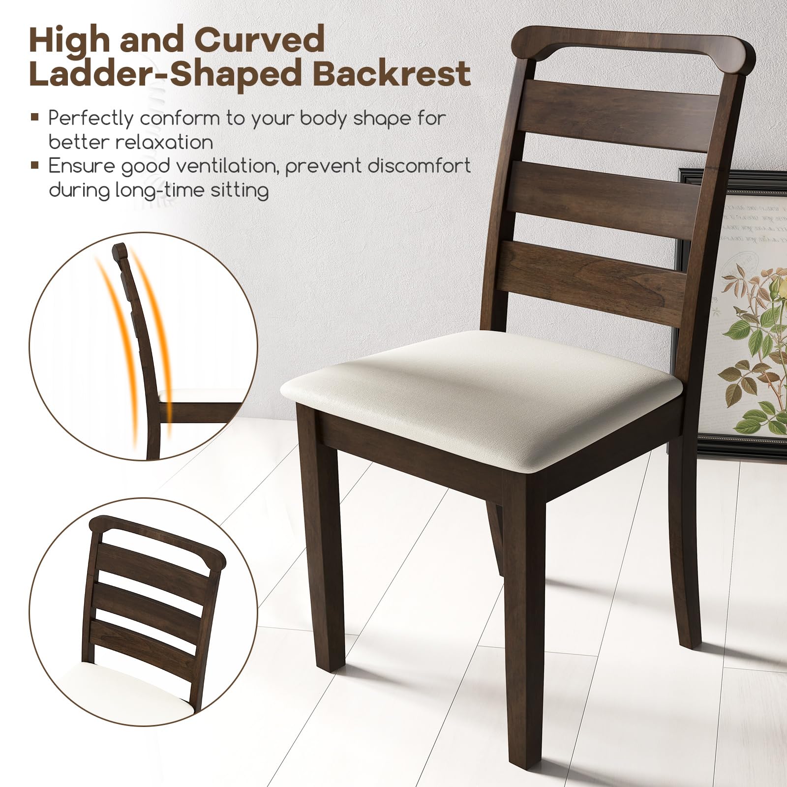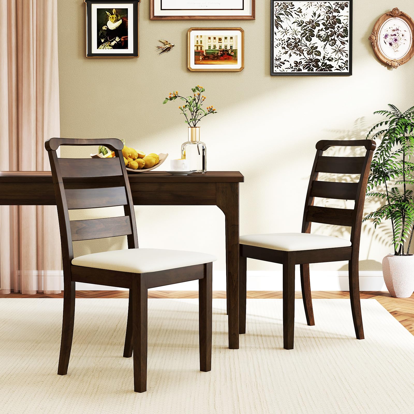 This wooden dining chair set is meticulously crafted with robust rubber wood frames, ensuring a stable and reliable seating solution for everyday use. Experience comfort tailored to your body with these chairs' ergonomically curved high ladder-shaped backrests, promoting a healthy sitting posture during extended meals or gatherings. Indulge in luxurious comfort with the soft padded seat cushions, meticulously crafted with soft sponge filling and covered in breathable polyester fabric for a cozy and inviting feel. The elegant combination of walnut wood frames and white upholstery adds a touch of sophistication to any space, making these chairs versatile for various settings, whether in the dining room, kitchen, office, or living room.