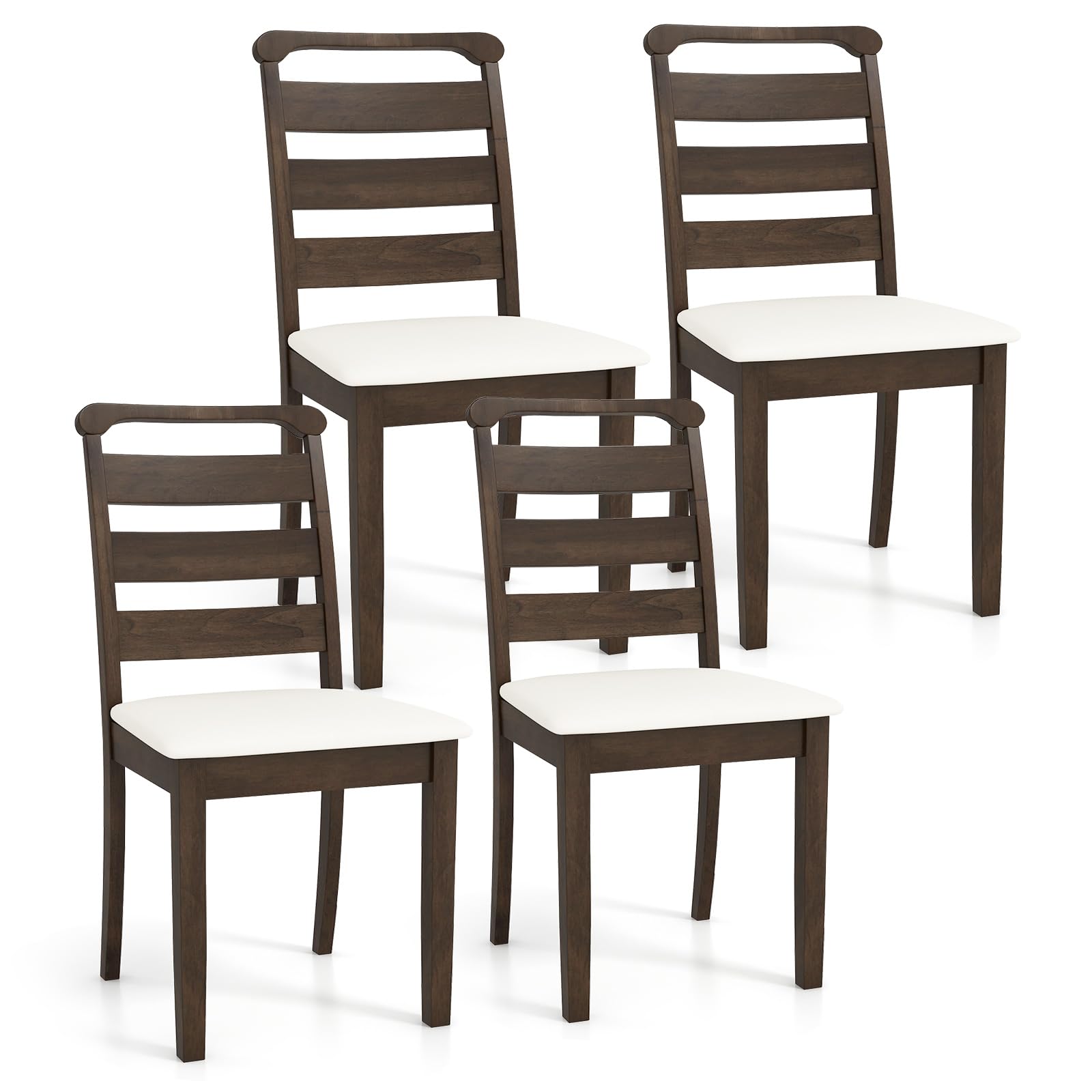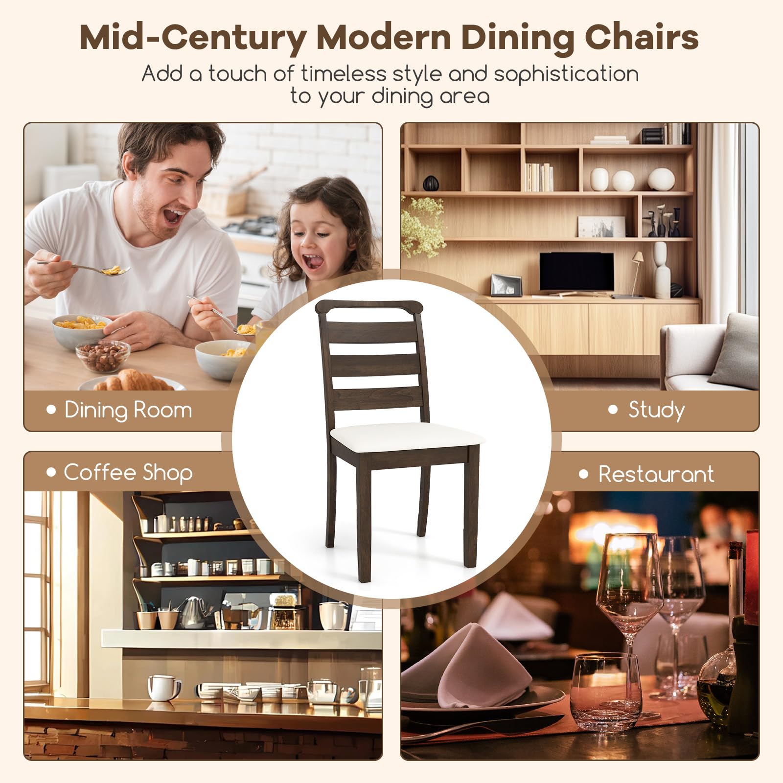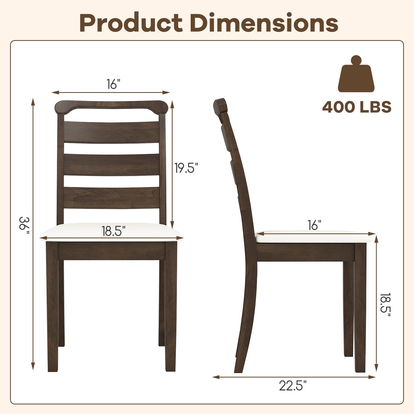 This wooden dining chair set is meticulously crafted with robust rubber wood frames, ensuring a stable and reliable seating solution for everyday use. Experience comfort tailored to your body with these chairs' ergonomically curved high ladder-shaped backrests, promoting a healthy sitting posture during extended meals or gatherings. Indulge in luxurious comfort with the soft padded seat cushions, meticulously crafted with soft sponge filling and covered in breathable polyester fabric for a cozy and inviting feel. The elegant combination of walnut wood frames and white upholstery adds a touch of sophistication to any space, making these chairs versatile for various settings, whether in the dining room, kitchen, office, or living room.