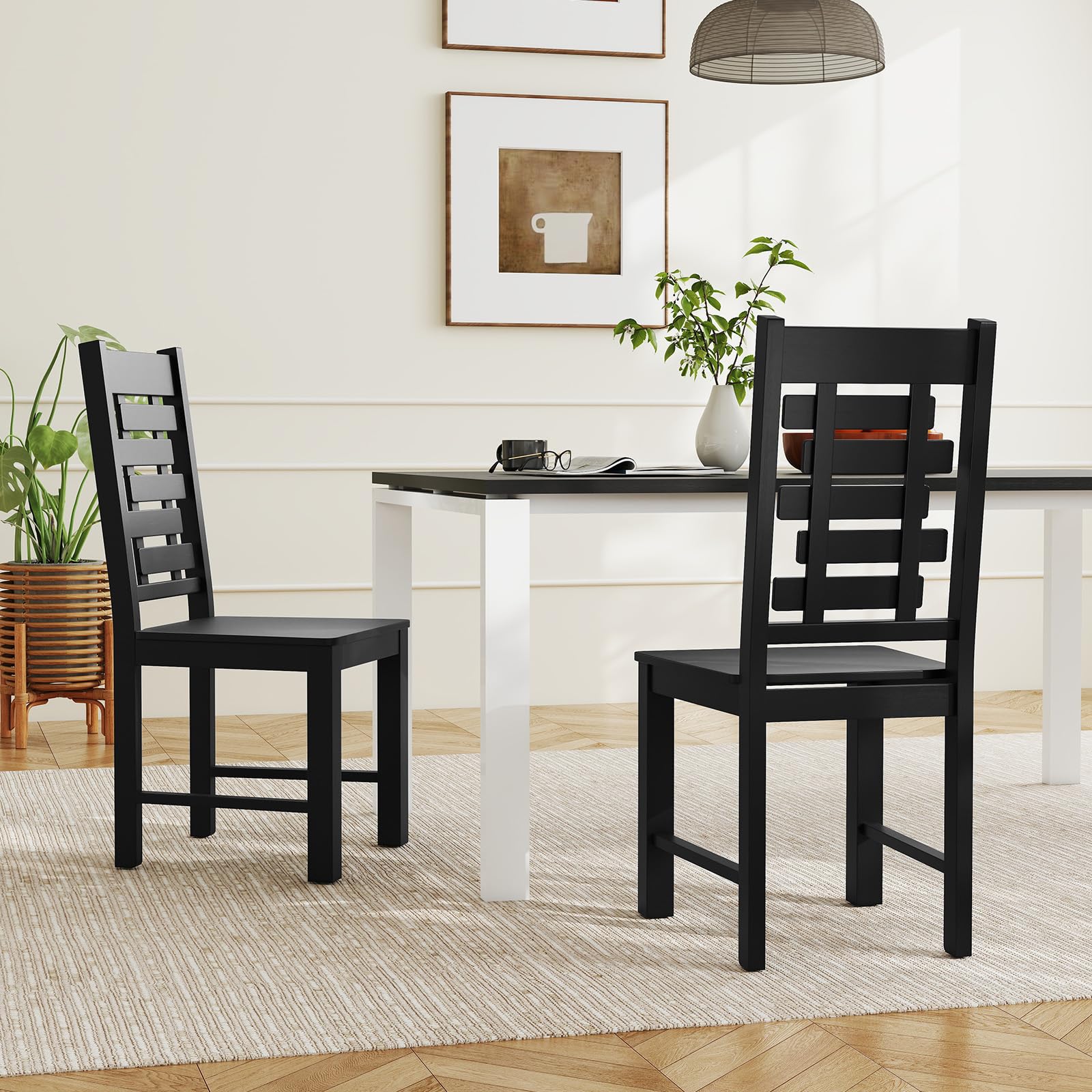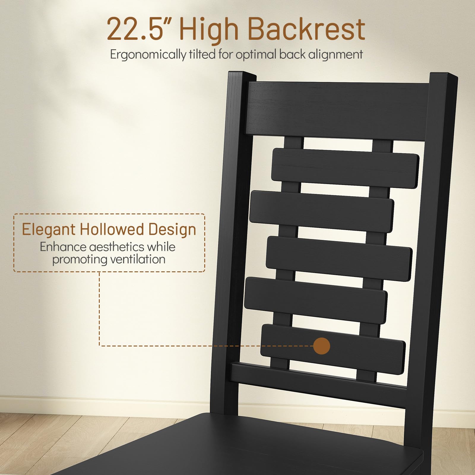 Our heavy-duty dining chair set is beautifully crafted from 100% solid rubber wood to ensure durability and stability. Each chair can support up to 400 lbs/180 kg, making them a sturdy choice for daily use. The high back design, standing at 22.5", contours to the human spine, providing exceptional comfort with its elegant, hollowed back that also promotes air circulation. Available in classic black and pure white, these chairs complement any decoration with their vintage charm. Designed to be versatile, they fit perfectly not just in dining rooms but also in kitchens, breakfast nooks, restaurants, cafe shops, or bistros. Opt for these stylish yet functional chairs to instantly elevate the look and feel of your dining area.