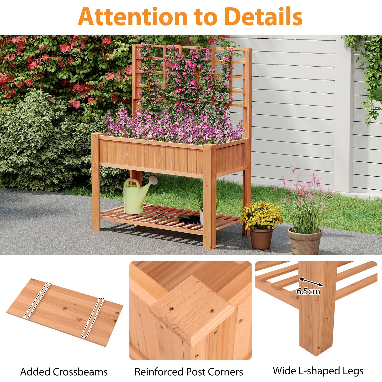 Constructed of fir wood known for its solid property, the planter box enhances your gardening experience by enabling the cultivation of flowers, herbs, or vegetables. It includes a trellis that not only supports climbing plants but also serves as a frame for hanging decorative elements. A removable liner is designed to protect the garden bed from water damage. To keep proper soil humidity, the planter box is equipped with 4 drainage holes and gaps. Below the bed, a slatted shelf avoids water retention while providing a storage area for gardening tools. The elevated structure of the planter protects your plants from small animals. Furthermore, there is no bending for watering. Stability is significantly boosted by wide, L-shaped legs. Moreover, additional crossbeams and reinforced corners make the planter a reliable choice for garden enthusiasts. Additionally, the natural surface invites you to customize its appearance with paint.
