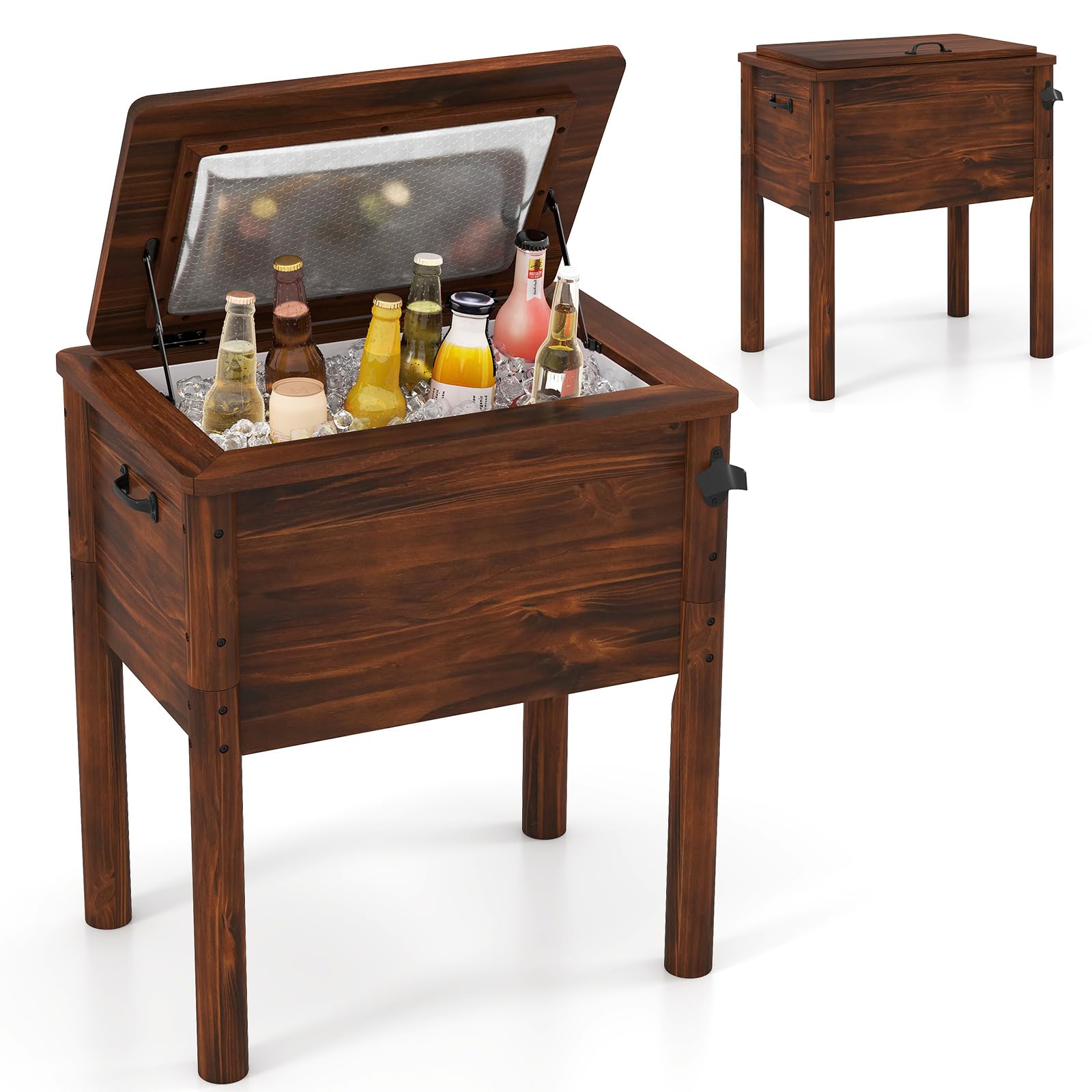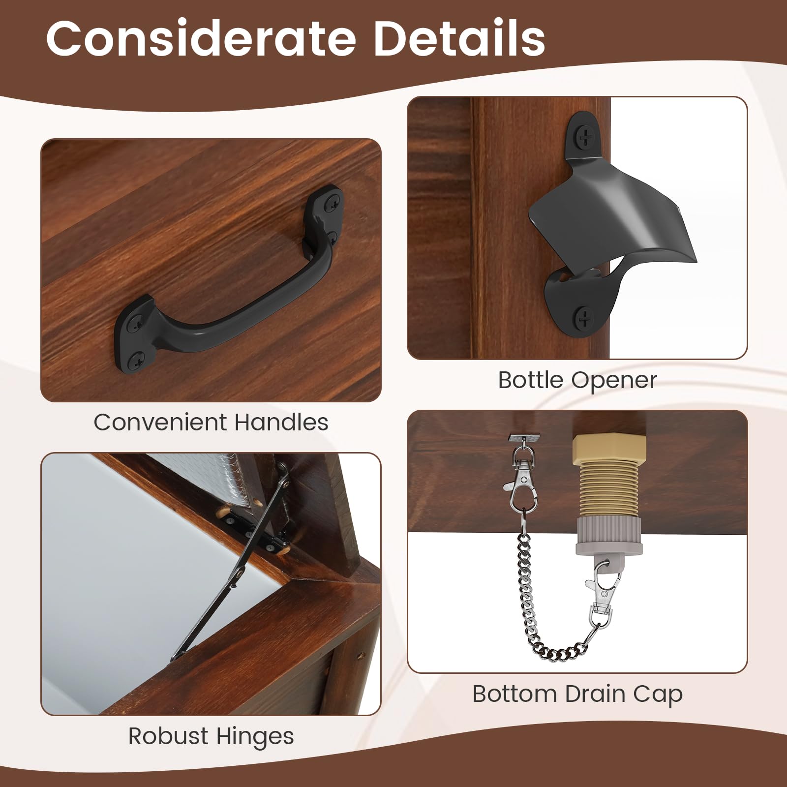 With a capacity of 54 quarts, this outdoor beverage cooler can hold a variety of drinks to cater to all your guests. It is built with a 3-layer insulation system that maintains the temperature of your beverages or food, keeping them cool or warm for 3-4 hours. Crafted from natural and solid pine wood with high temperature carbonization process, this patio cooler ensures great stability and long-lasting use. The smooth and waterproof finish makes the cleaning work a breeze. Designed with practicality in mind, this ice chest includes a drainage cap and a bottle opener. Moreover, the side handles allow you to easily relocate the cooler even when fully loaded.