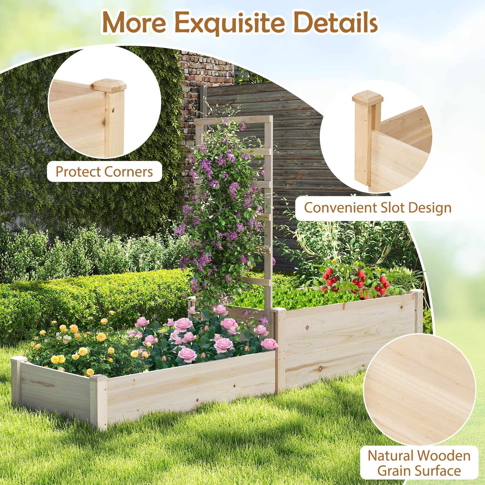 Enhance your outdoor space with this stylish 2-tier garden planter box. It features 2 planting areas of different heights, accommodating plants with various root lengths. The open-ended base ensures excellent drainage and air circulation for healthy growth. Besides, the vertical trellis design offers ample space for climbing plants, with a middle trellis that can be installed on either side, maximizing space and adding beauty to your garden. Made from premium solid wood, this planter box has a natural appearance and sturdy structure. Its water-based paint finish enhances durability. Personalize it with DIY painting options to match your garden's theme. Suitable for cultivating flowers or growing vegetables, this planter box with trellis fits both courtyards and farms.