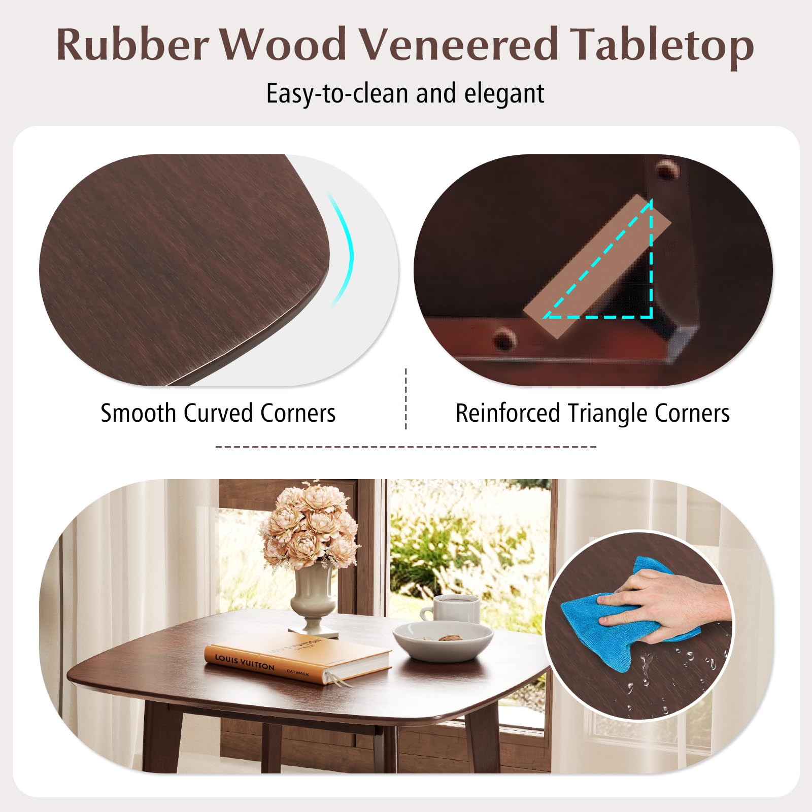 Rubber wood veneered tabletop is easy-to-clean and elegant