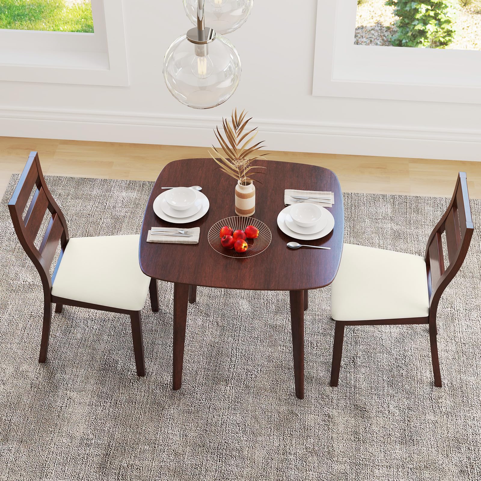 The kitchen table features a farmhouse style design with a rubber wood veneered tabletop. The dining table set's sturdy frame is constructed from natural rubber wood, provide a robust foundation. Additionally, the back of the chair is designed with a curvature to better fit the body's curves, while the upholstered seats offer a comfortable dining experience. Also, the seat features PU leather upholstery for easy maintenance. In addition to its aesthetic appeal and durability, the 3-piece dining table set offers a space-saving design. By allowing you to tuck the chairs neatly under the table when not in use, this breakfast set optimizes your living space, making it perfect for smaller dining areas or apartments.