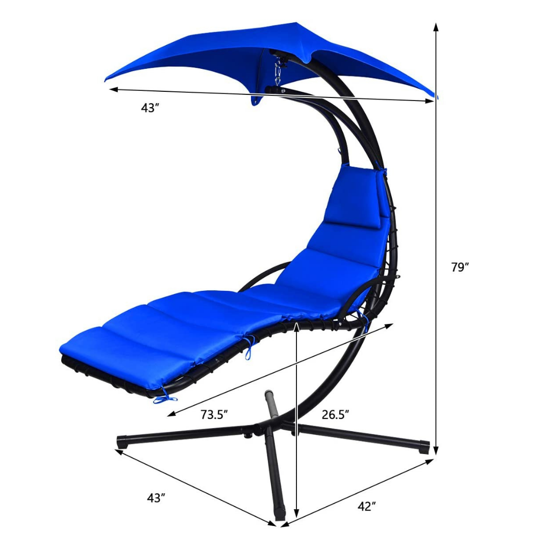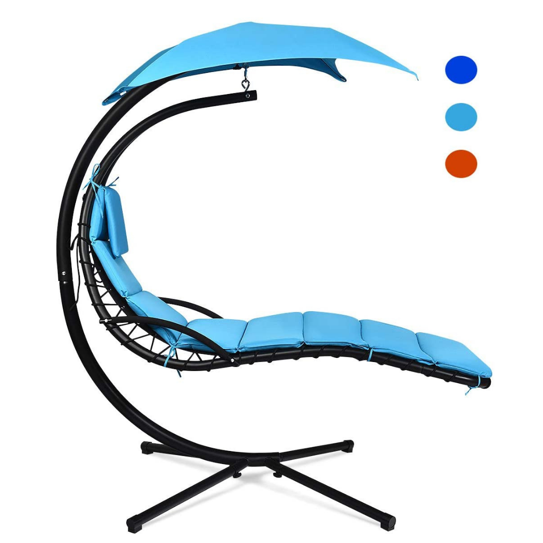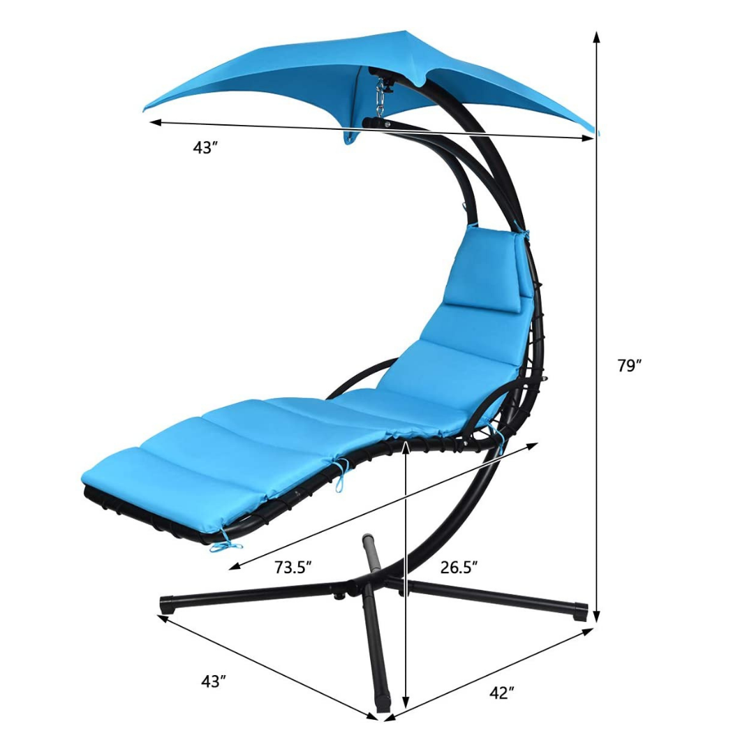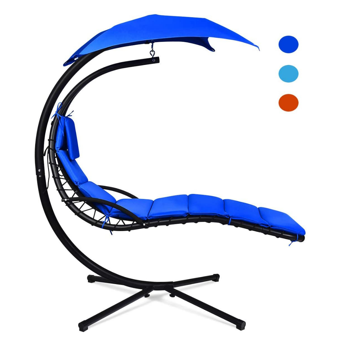 This hanging chaise lounger chair with superior quality can provide comfort and style to your garden, patio, or backyard. Crafted with a thick stainless steel frame, this hammock chair is sturdy for long-term use. The legs with anti-slip foot cover of the lounge chair are designed with an X-shape to ensure stability. Attached with soft cushion and pillow, the hanging lounge will add extra comfort to you. And the ergonomic-shaped chair will provide you with hours of rest. The porch swing chair also features a canopy to shade you from the sun and the canopy can be adjusted with different angles. You will get the greatest extent of comfort if you have this hammock chair.