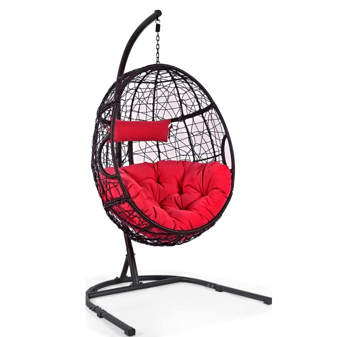 The hanging hammock chair is the best choice for better enjoying your leisure time. It consists of a stable C stand and chair. You can sit in this comfortable swing chair and enjoy your leisure time. It can hold you well with an enhanced frame and safety hook and provide an extra balance to use with more convenience. A heavy-duty metal frame with non-slip pads can always keep this egg chair stable and won't fall over easily. The soft fiber-filled seat cushion and headrest pillow offer luxurious comfort and reduce fatigue. You can use it indoors or outdoors as you like.