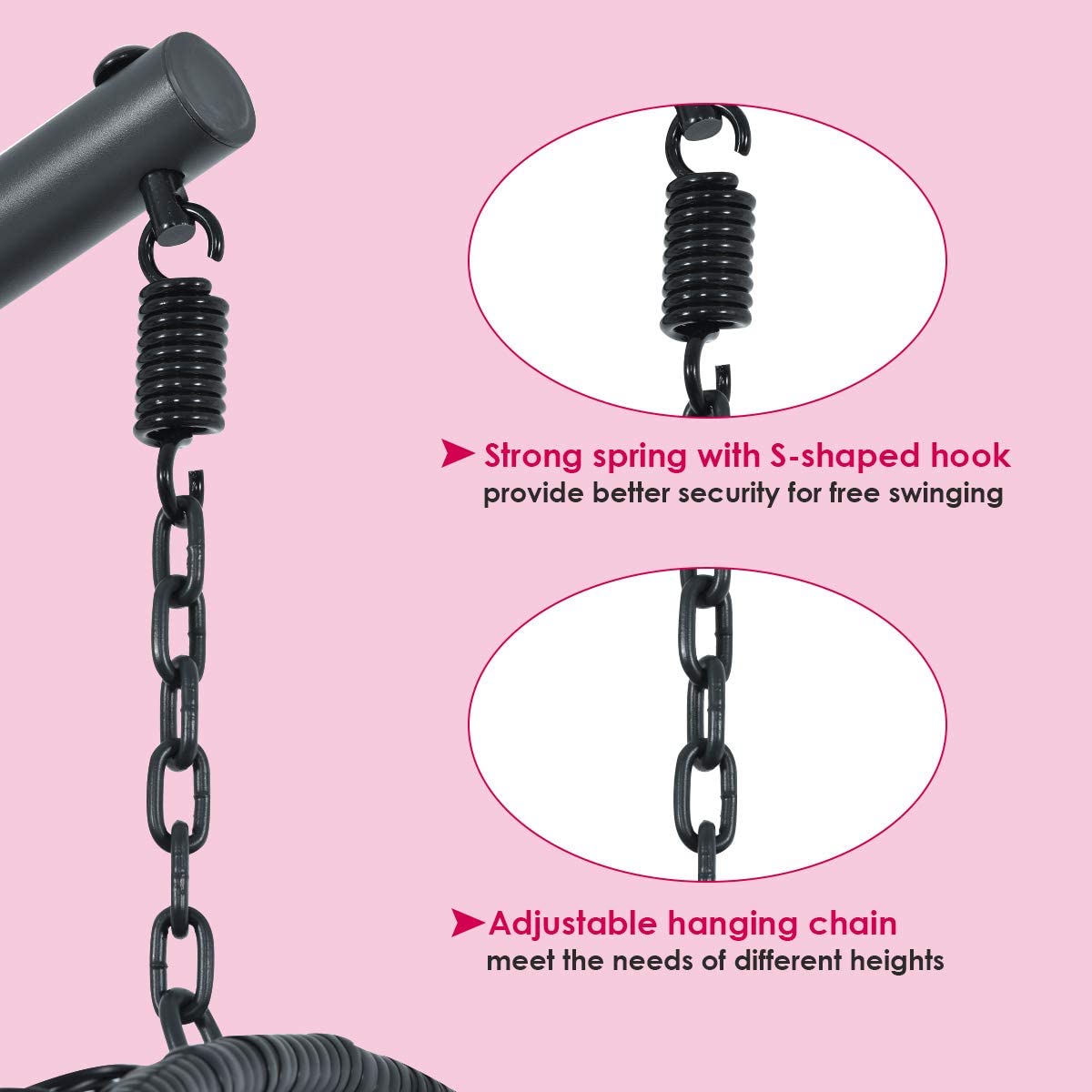 - Great Balance & Enjoy Leisure Time:?A safety hook, durable hanging chain, and strengthened frame ensure great balance. Besides, the chair is secured with a strap for safety. You can spend joyful swinging time with its powerful function. Enjoy the panoramic day sitting in the chair.