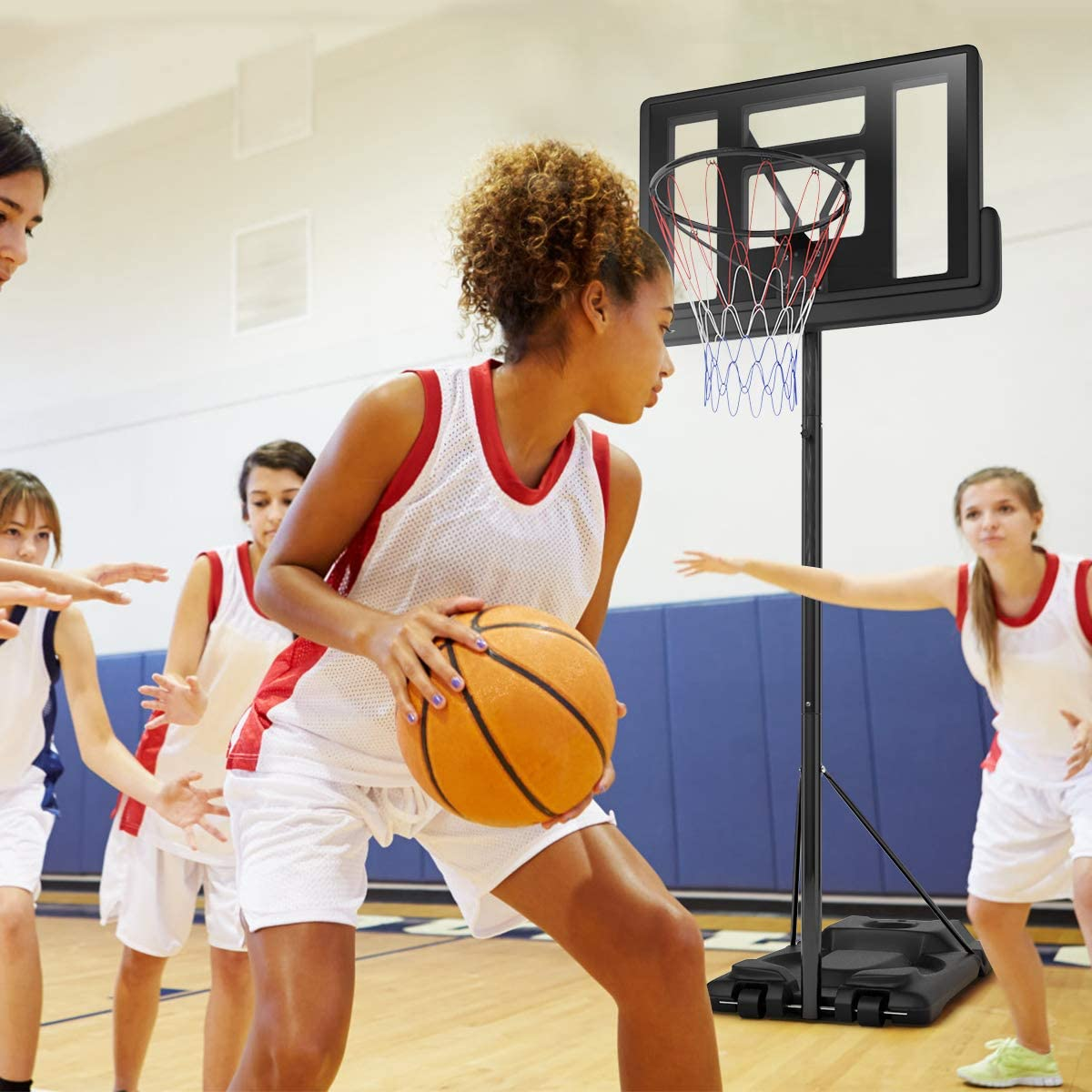 This is our high quality basketball hoop system. The height of this item is adjustable. It could suit for different height requirements, both children and adult can use it to play the basketball. The material of the rim net is durable nylon for all weathers. And the backboard is made by high quality PVC. It could be indoor and outdoor. You could put it in your house or in the public area in your neighborhood and invite several friends to have a basketball game in your leisure time. Please do not hesitate buy it!