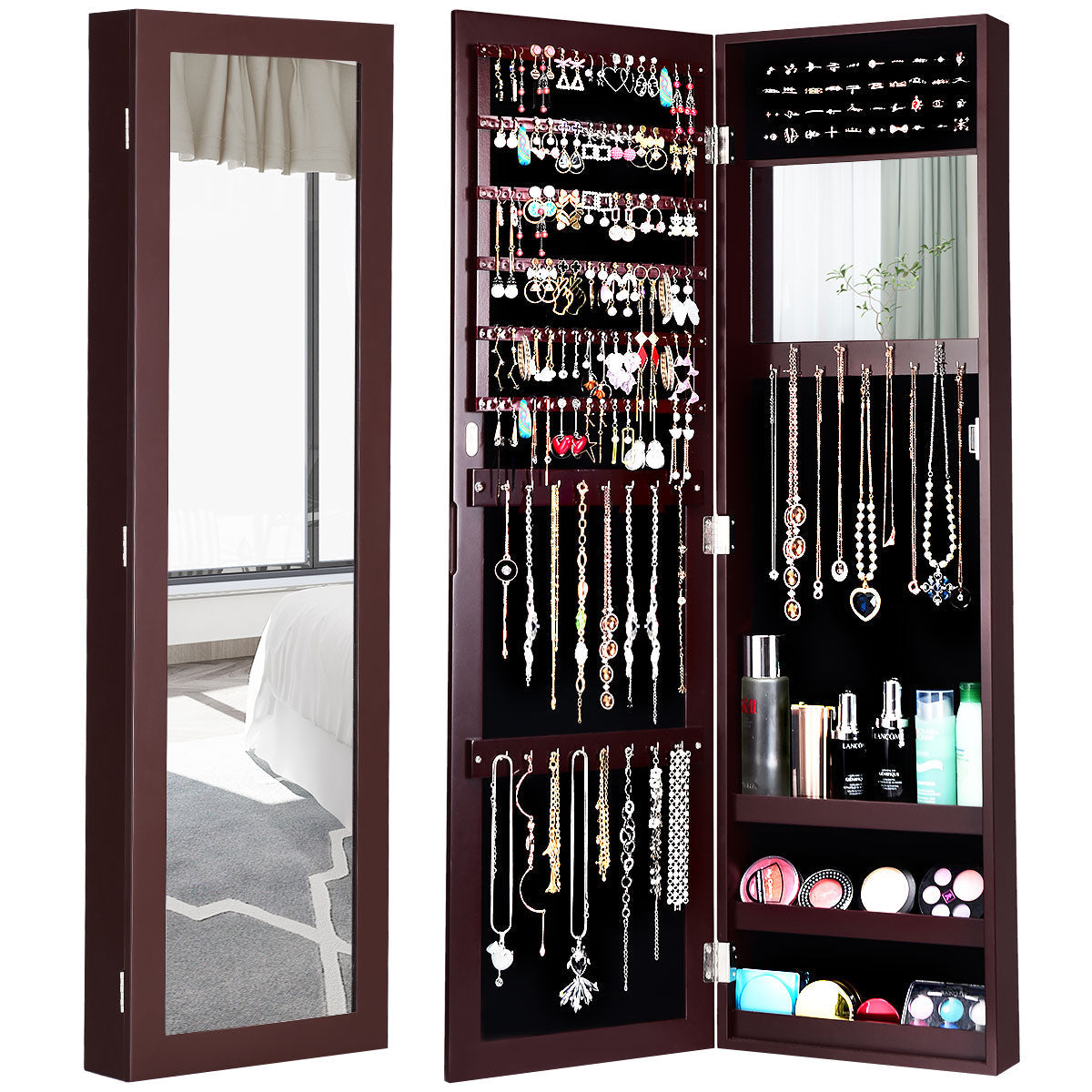 This jewelry cabinet with a full-size mirror is an attractive artwork that is specially designed for all your valuables, helps your jewelry in an organized manner, and keeps your jewelry safe and away from kids. The full-size mirror is convenient for you to try your clothes or jewelry on. In addition, its chic and stylish design fits with your bedroom decor and the wall/door-mounted feature makes it space-saving and perfect for smaller rooms. With it, your life will be convenient and self-consistent. Worth having!