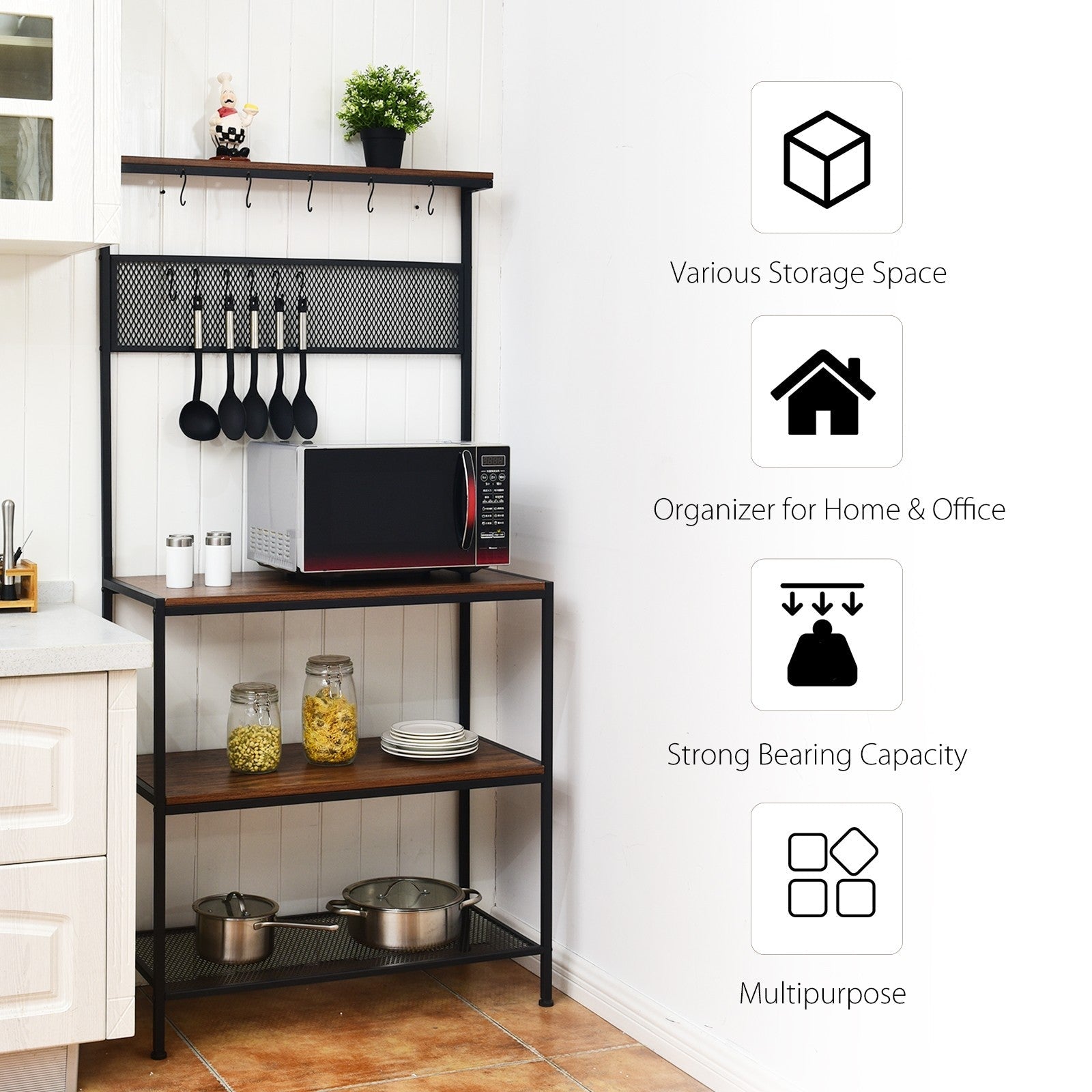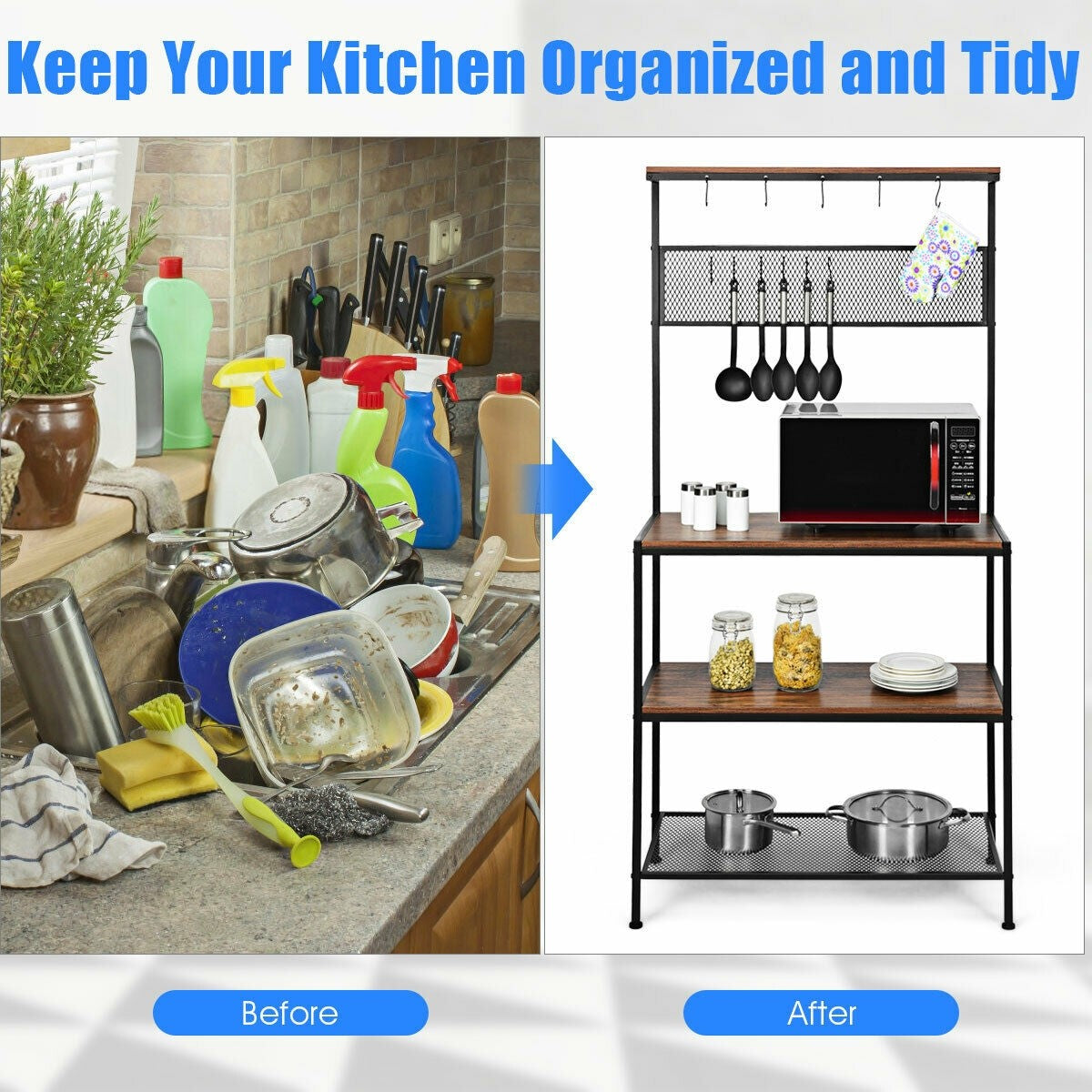 Made of thicken board and iron tubes, the baker's rack is sturdy and durable for a life span. It also does excellent in rust resistant with paint-coat on it. Adjustable feet provide great stability. 4-layer design, including 3 wooden boards and 1 grid layer, provides ample storage and classified space, making your home tidy and neat. Moreover, 11 S-hooks help to hang up objects like pans and ladles conveniently and effortlessly!