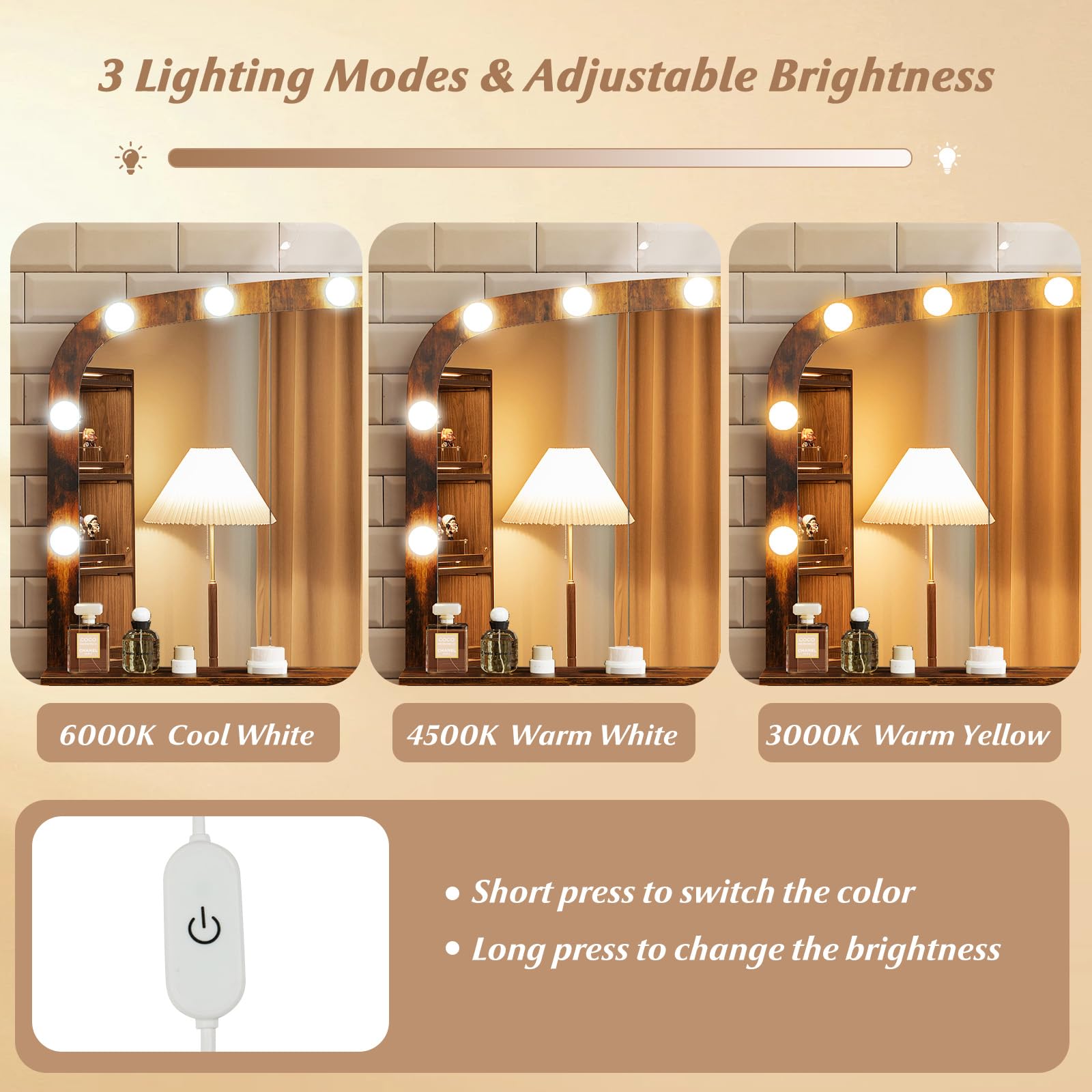 LED mirror with 3 color modes & adjustable brightness
