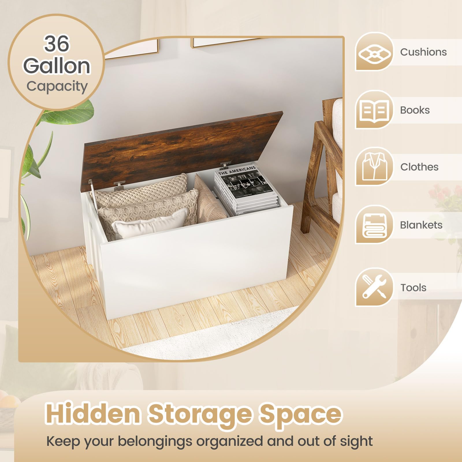 This multifunctional storage bench with a rustic brown top and white body is a practical and aesthetic addition to your living space. Featuring a self-hold lid and large internal space, the chest makes it a breeze for you to store your sundries and search something inside. Meanwhile, the wide top can be used as a seat when it is closed, firmly holding 200 lbs of weight. Excellent in materials and workmanship, the storage bench is very sturdy and durable. And there are anti-collision pads and bottom pads to give you a better using experience.