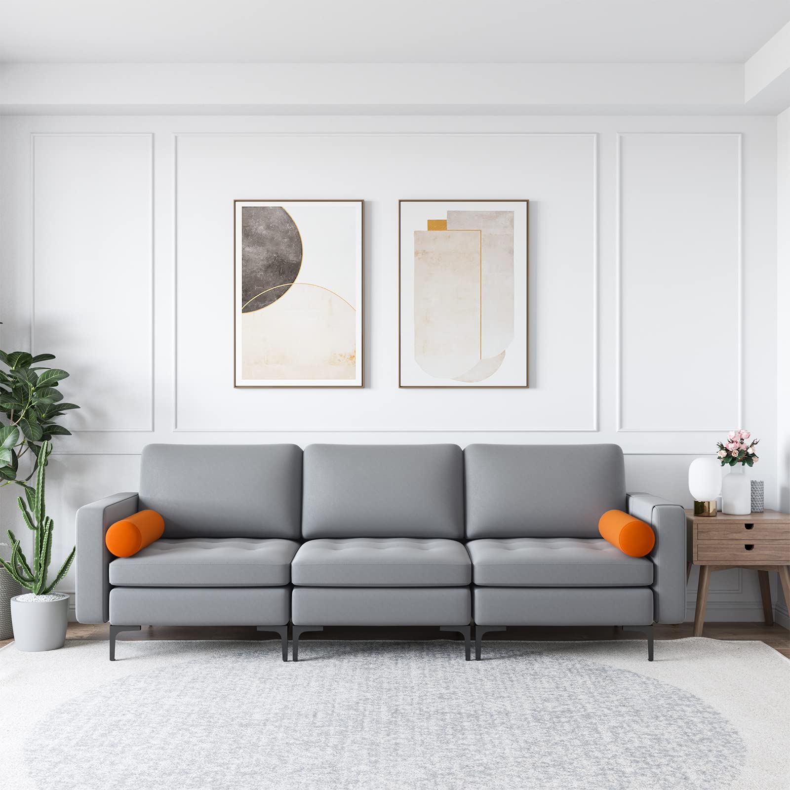 • 〖Premium Fabric〗: Covered with skin-friendly gray lint fabric, the upholstered sofa couch is breathable and crease-resistant. 3 removable backrest pillows are filled with cotton, goose down and latex particle.